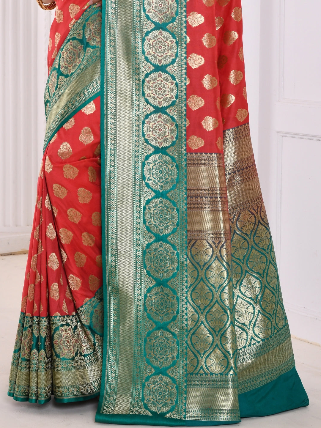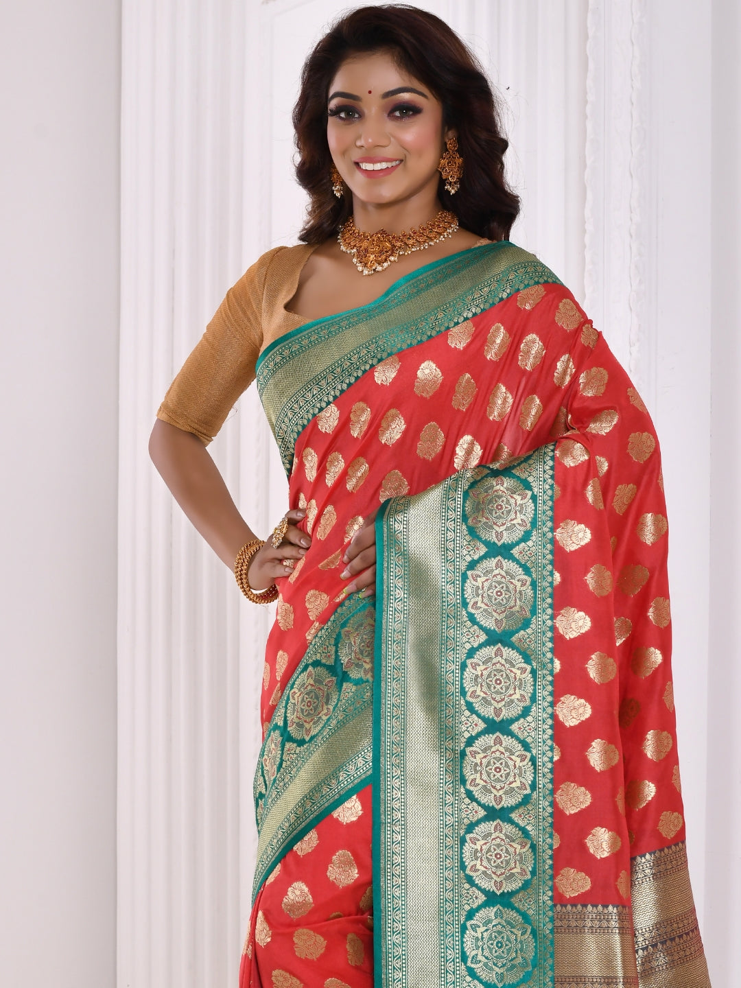Coral Banarasi Silk Saree With Contrast Border & Pallu