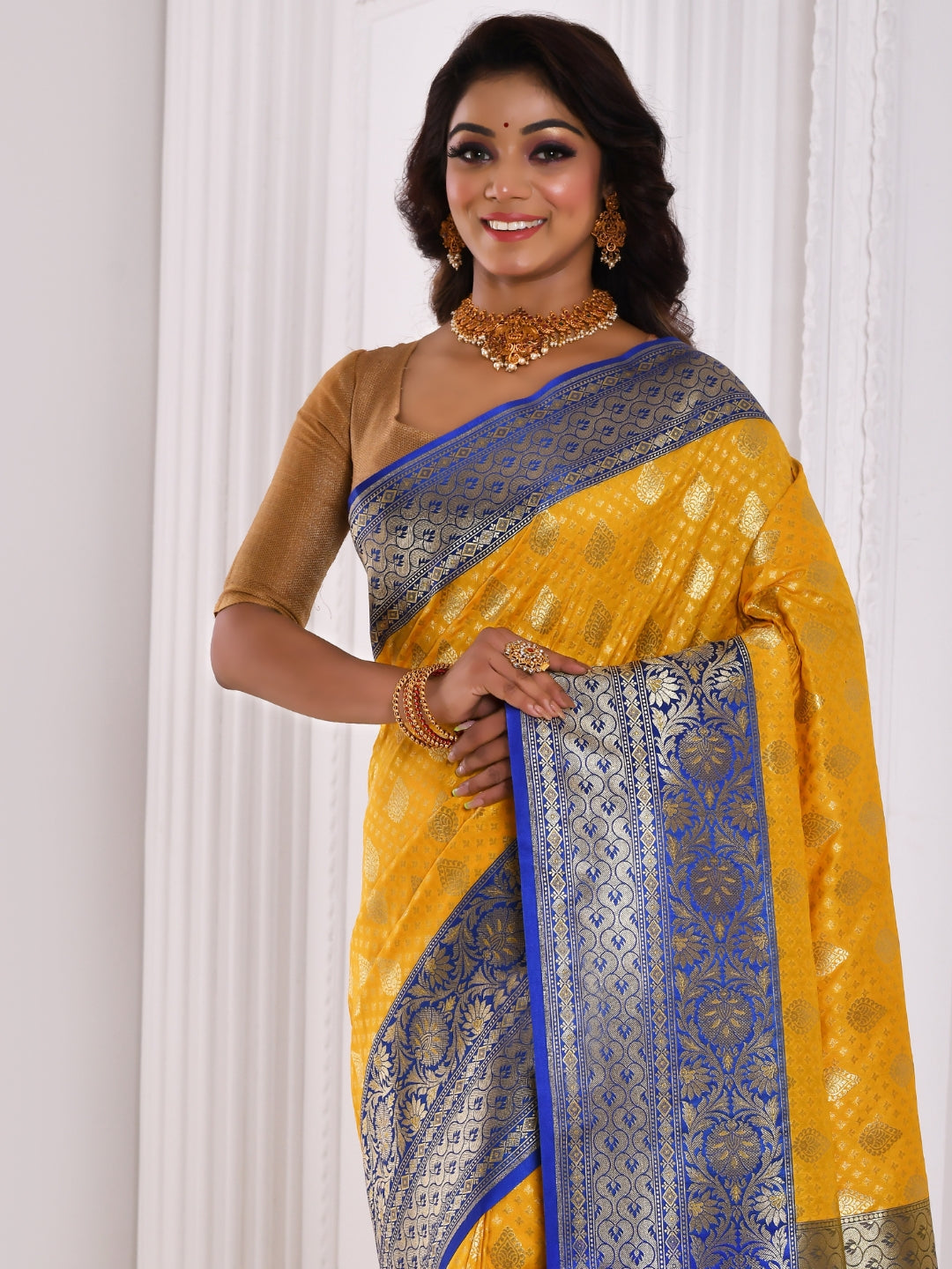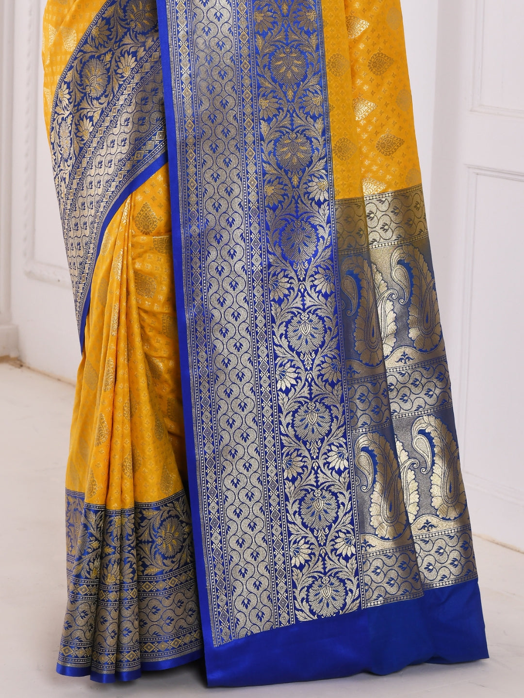 Yellow Banarasi Silk Saree With Bold Contrast Blue Border & Pallu