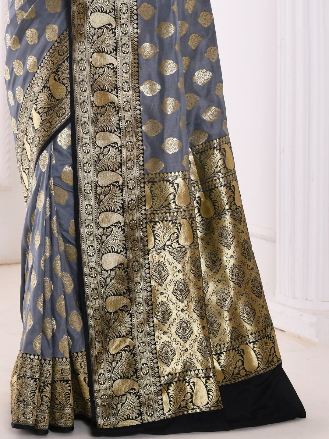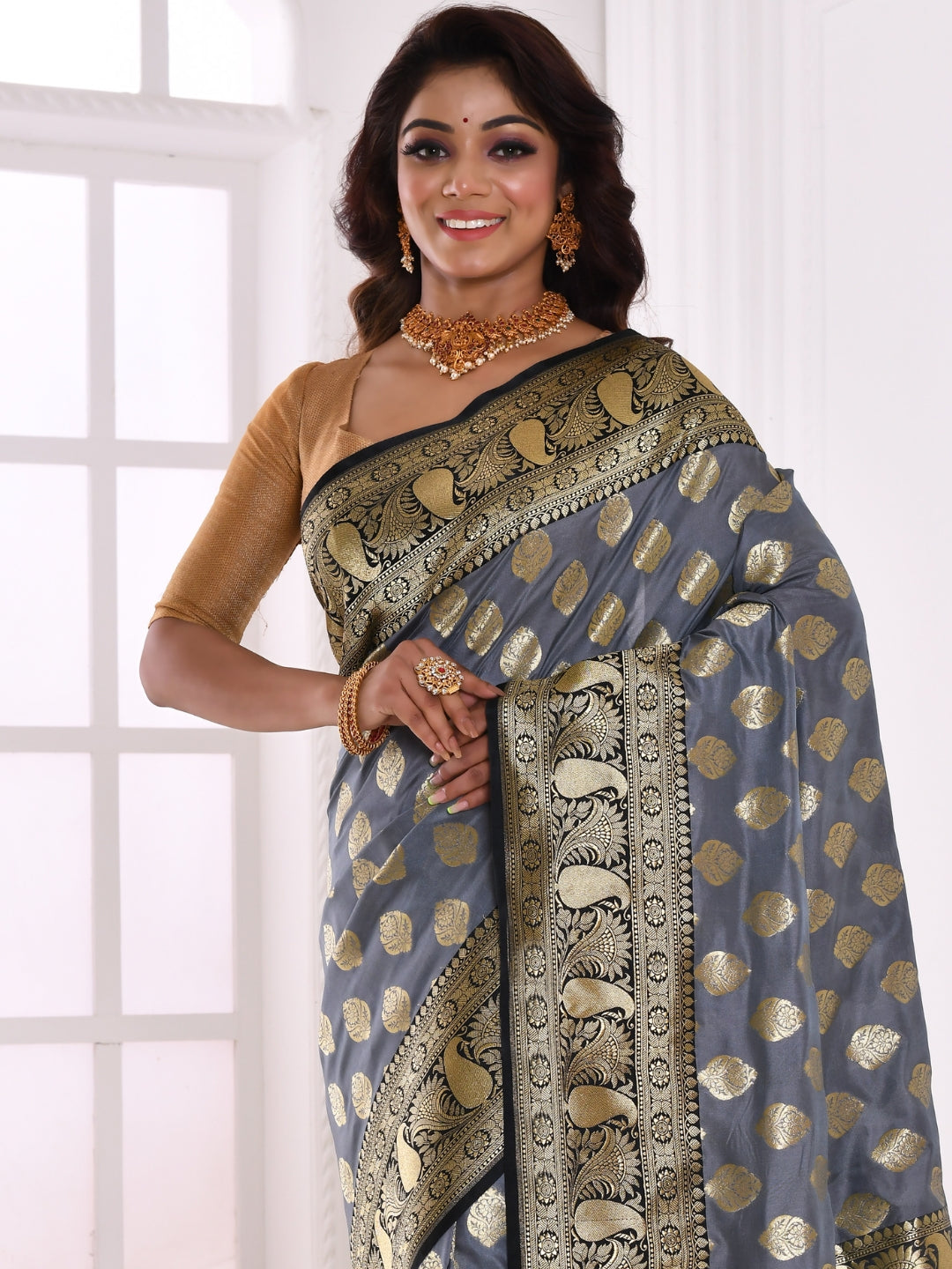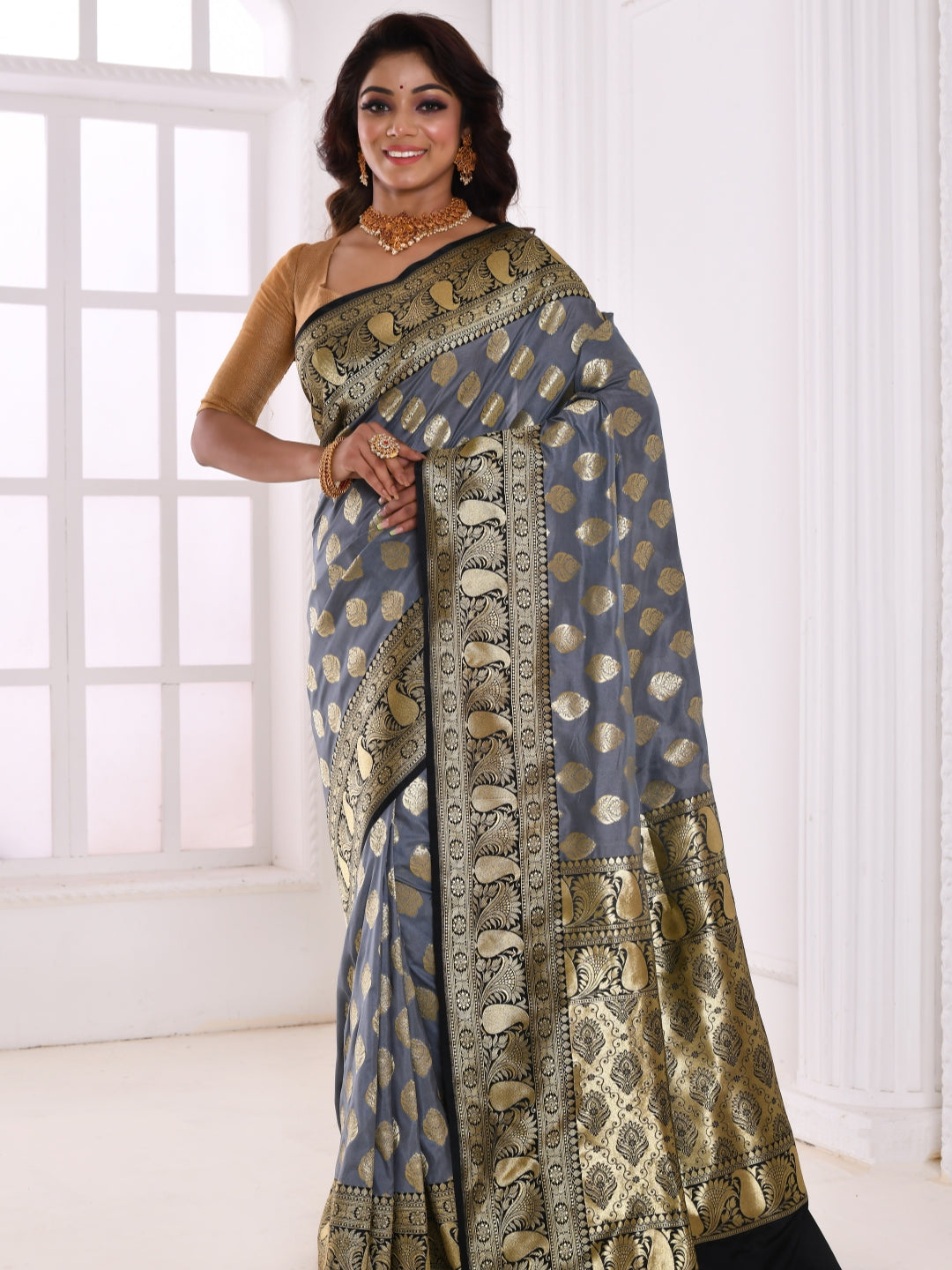 Grey Banarasi Silk Saree With Bold Contrast Border & Pallu