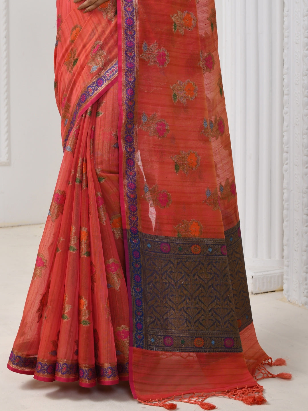 Red Chanderi Silk Floral Woven Banarasi Saree With Contrast Pallu