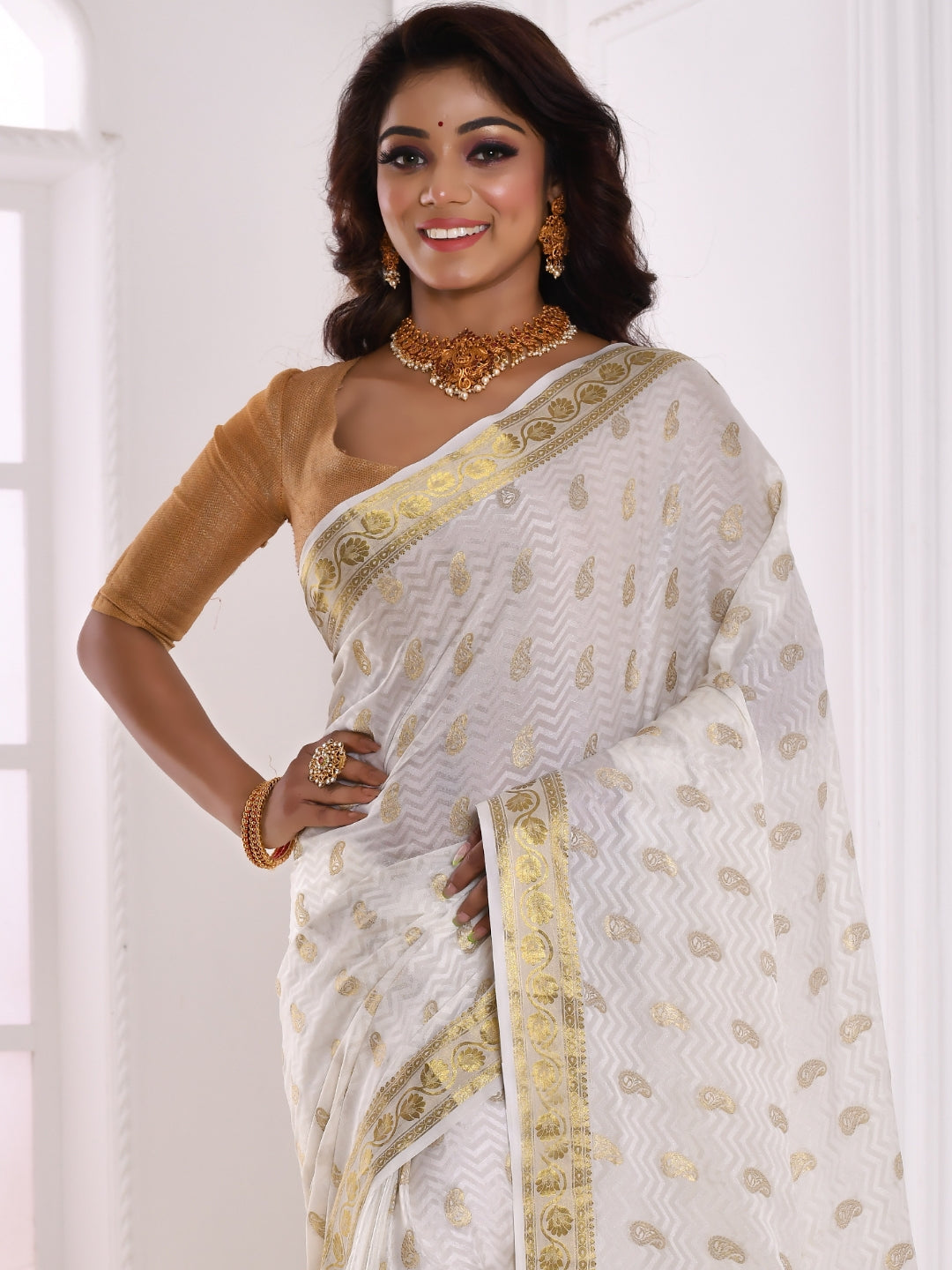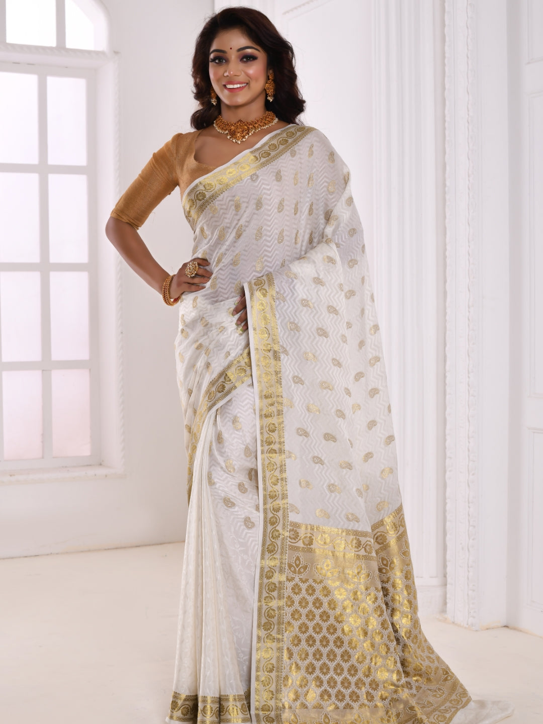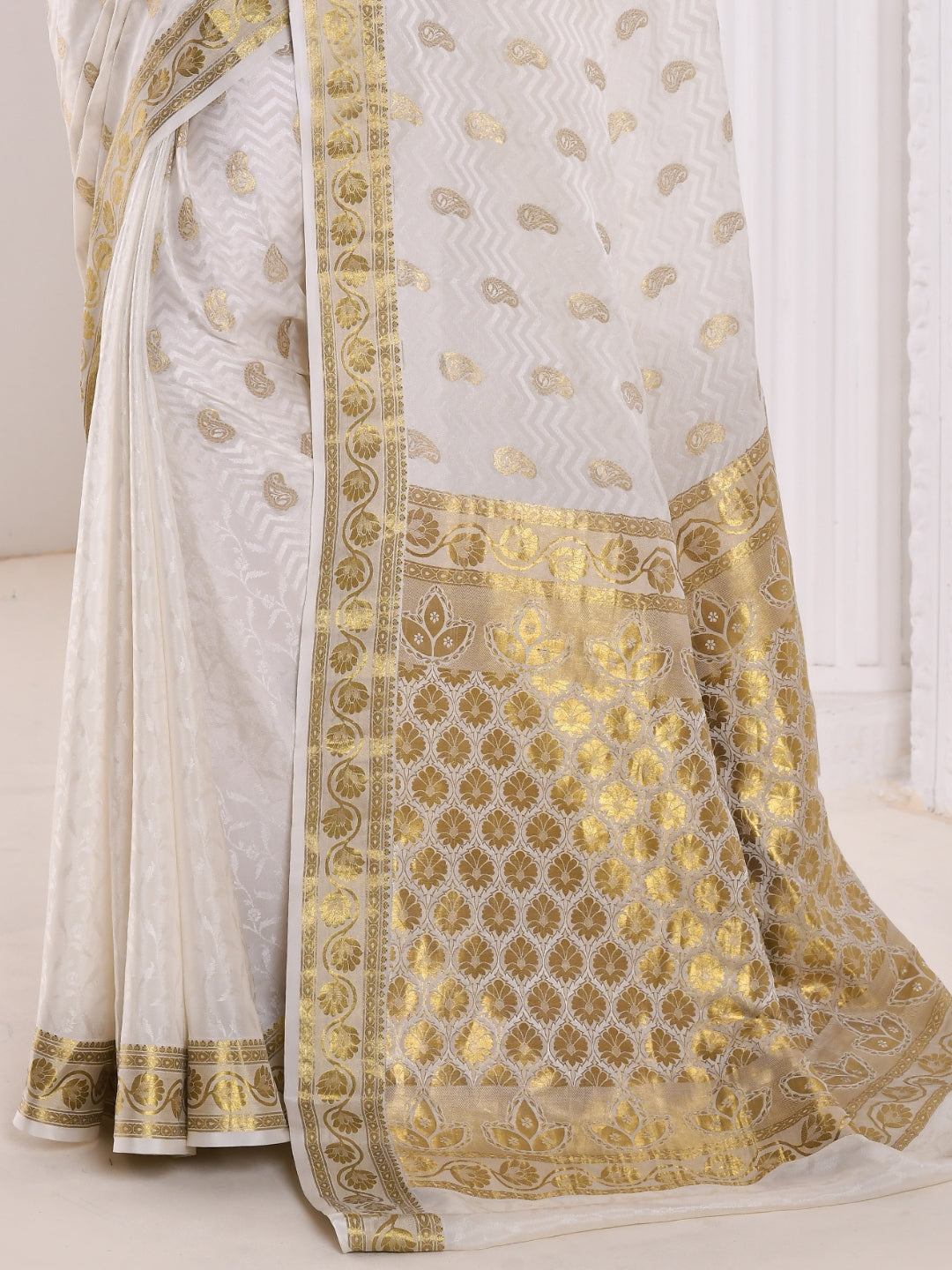 White Banarasi Silk Half Half Patterned Golden Zari Woven Saree