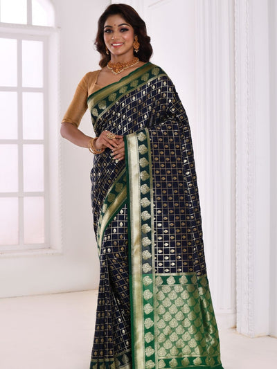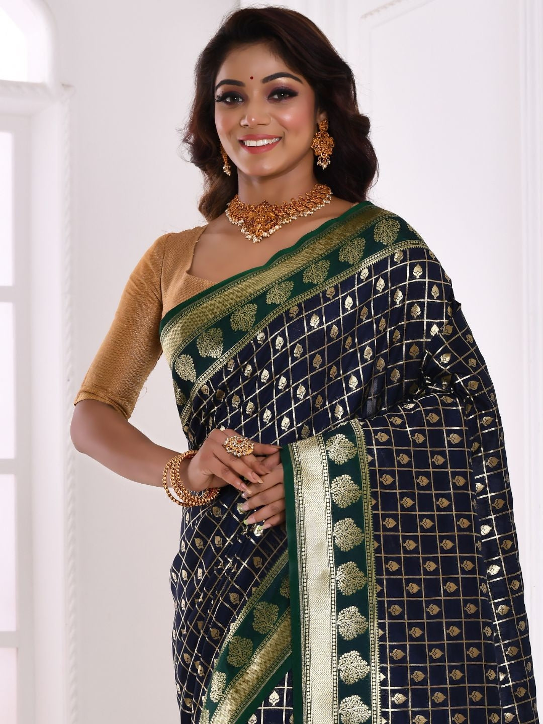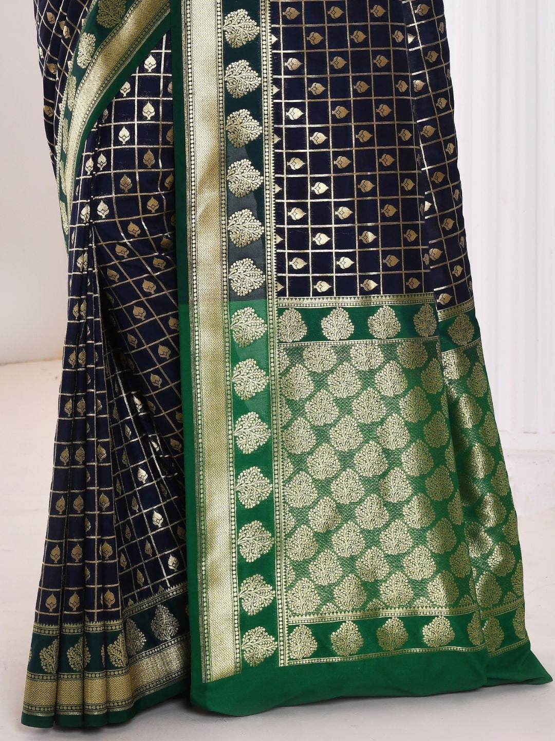 Navy Blue Checked Banarasi Silk Saree With Contrast Border & Pallu