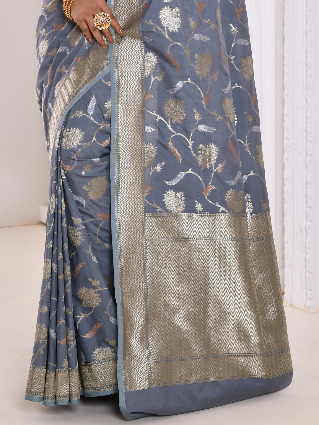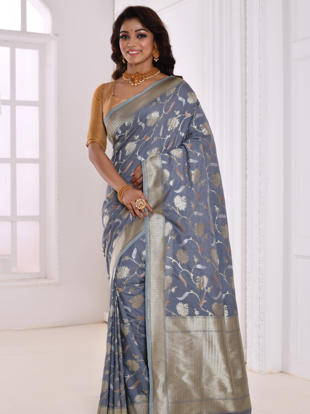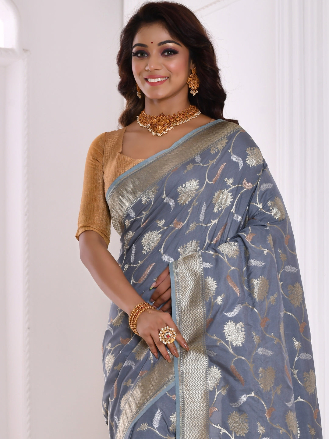Grey Floral Silver Zari Woven Embroidered Banarasi Silk Saree