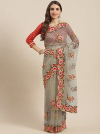 Net Floral Embroidered Saree Embellished With Scalloped Cutwork Border