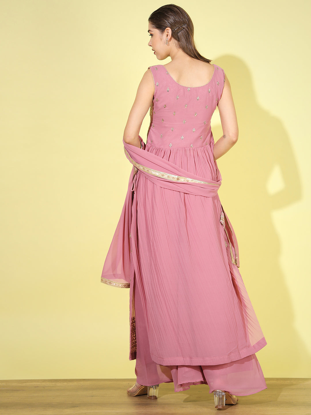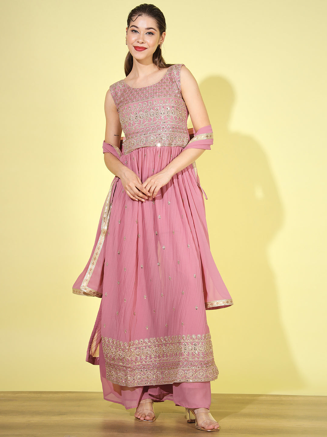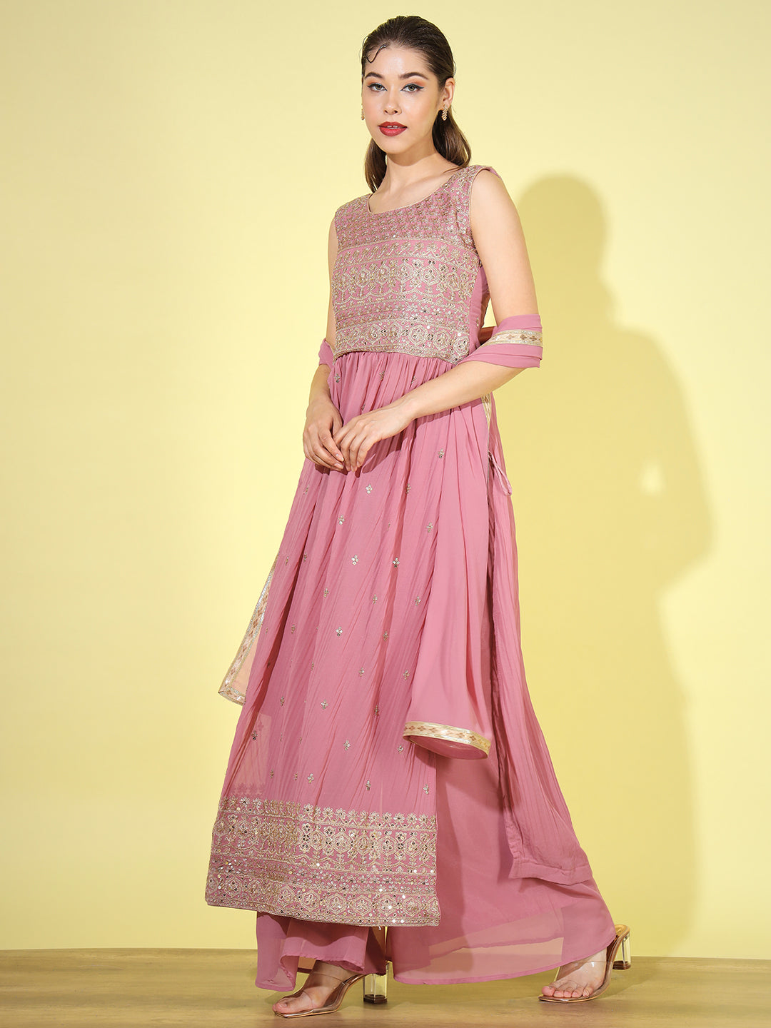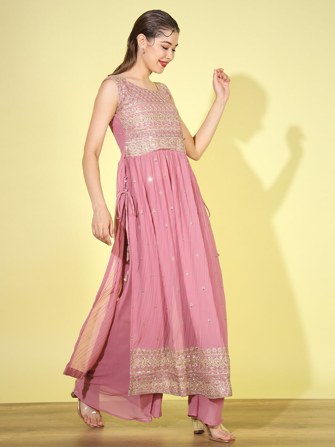 Sequin Embellished Nyraa Style High Slit Pleated Kurta Palazzo Set