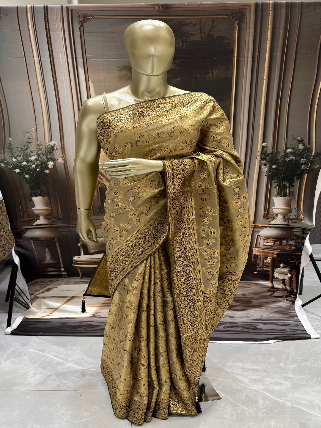 Timeless elegance meets traditional craftsmanship in this exquisite Antique Gold Banarasi Silk Saree. Woven from pure silk with intricate zari work, this saree showcases the rich heritage of Banaras weaving. The warm antique gold tones create a sophisticated, regal appearance perfect for weddings, festivals, and special occasions. The luxurious drape and fine detailing make it a treasured addition to any collection. Pair with traditional jewelry to complete your graceful look.