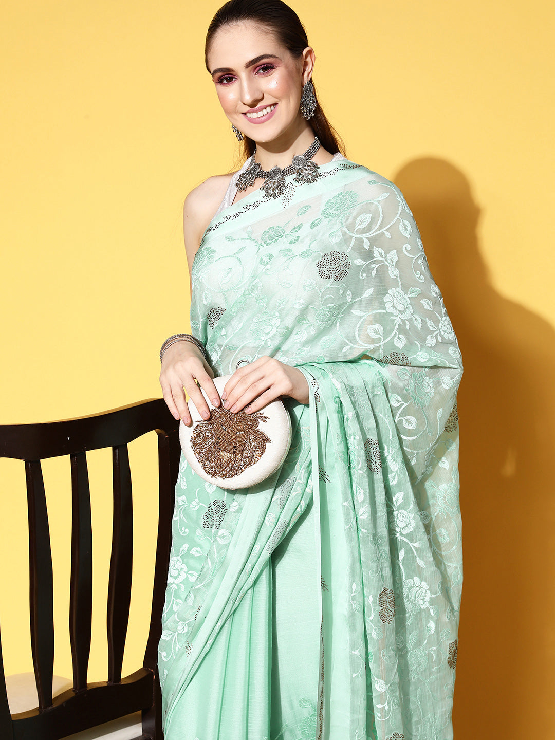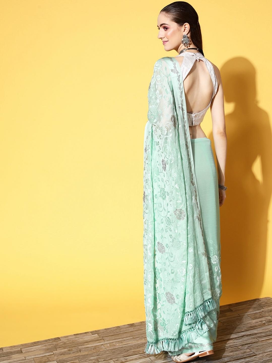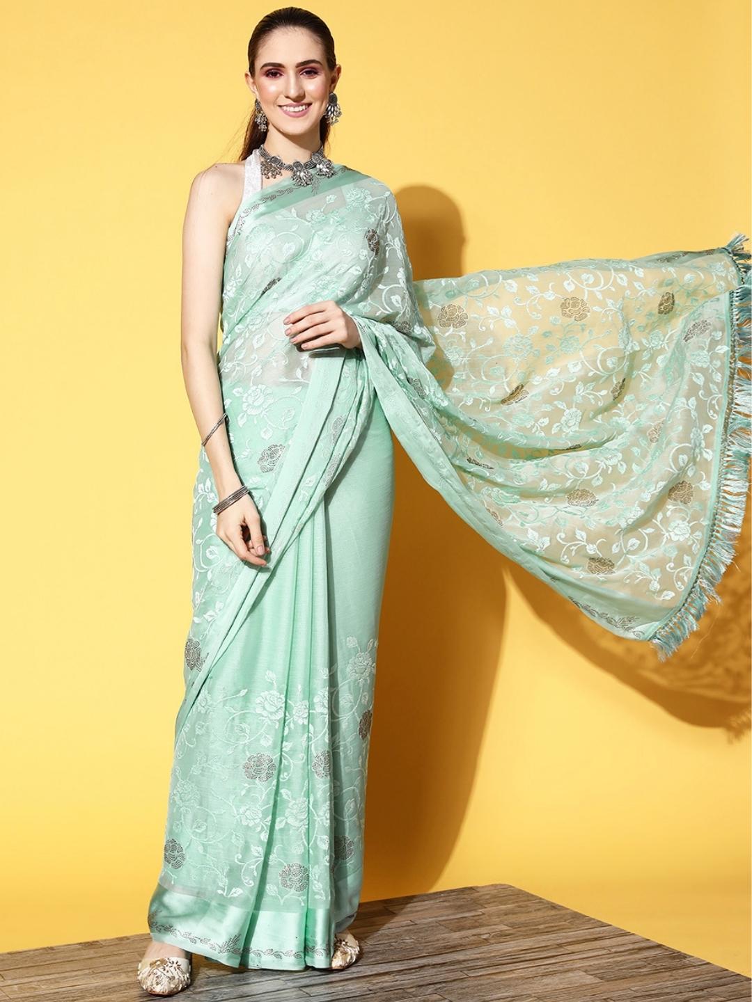 Pastel Green Sequin Embellished Shimmer Georgette Cocktail Saree