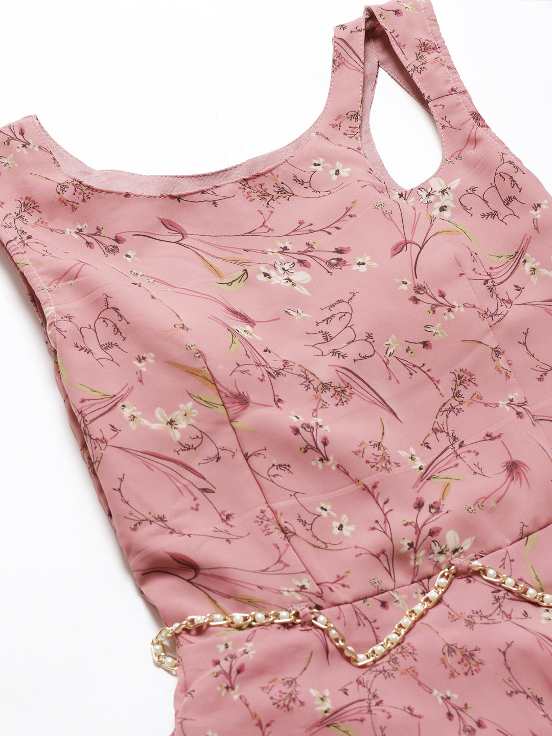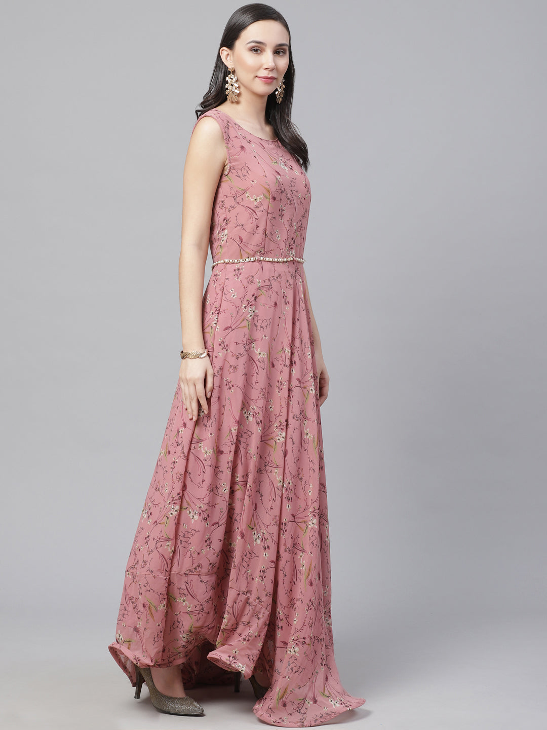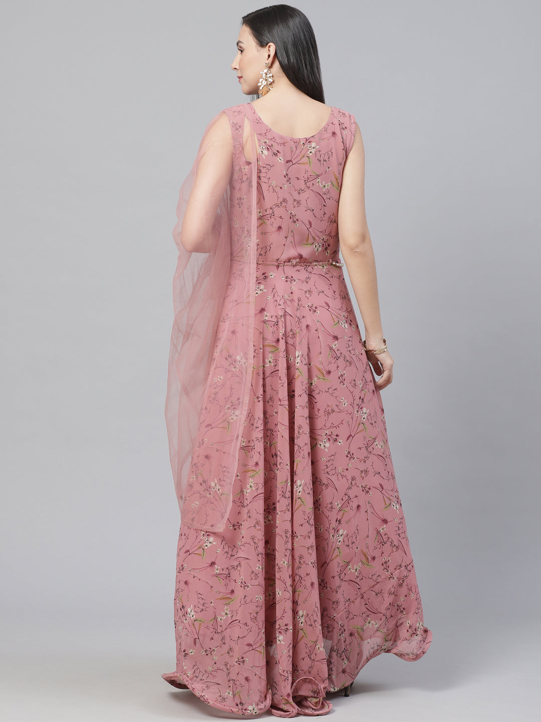 Made to Measure Rose Gold Gown with Digital Floral Print & Embellished Belt, Dupatta