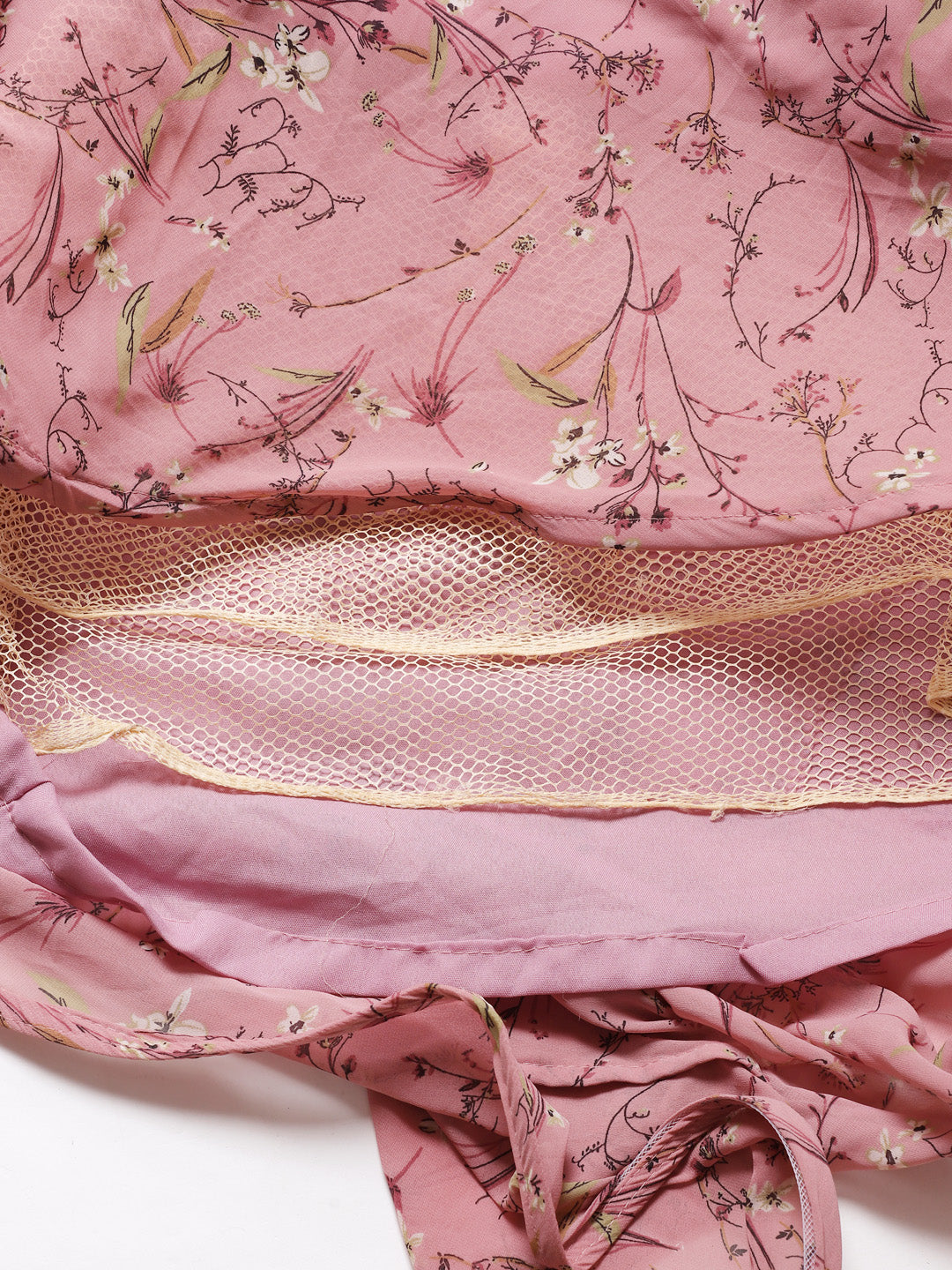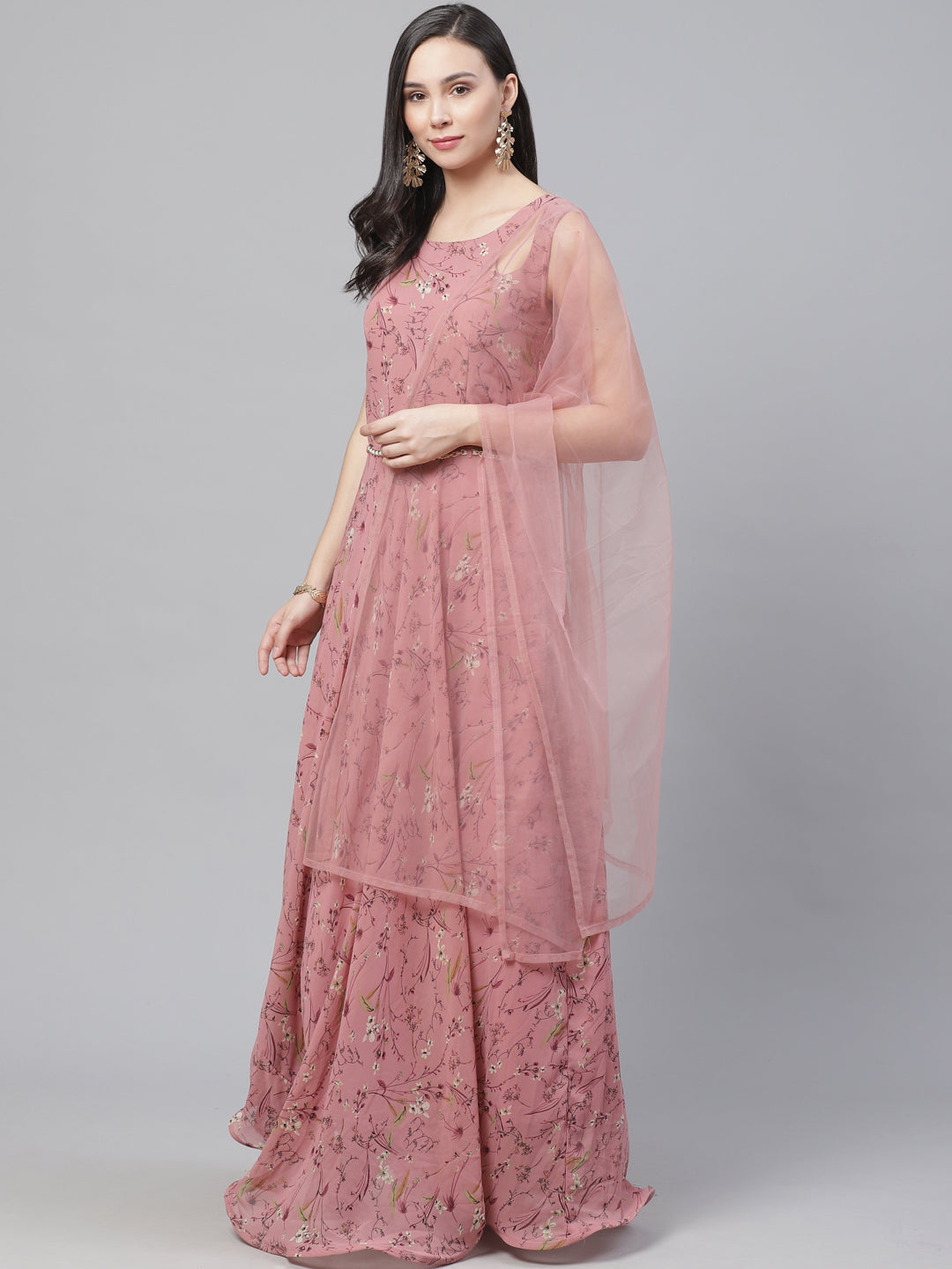 Chhabra 555 Made to Measure Rose Gold Gown with Digital Floral Print & Embellished Belt, Dupatta