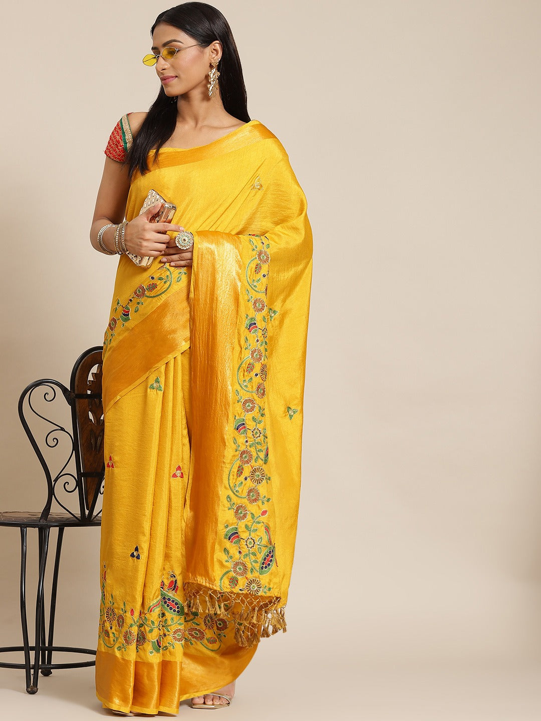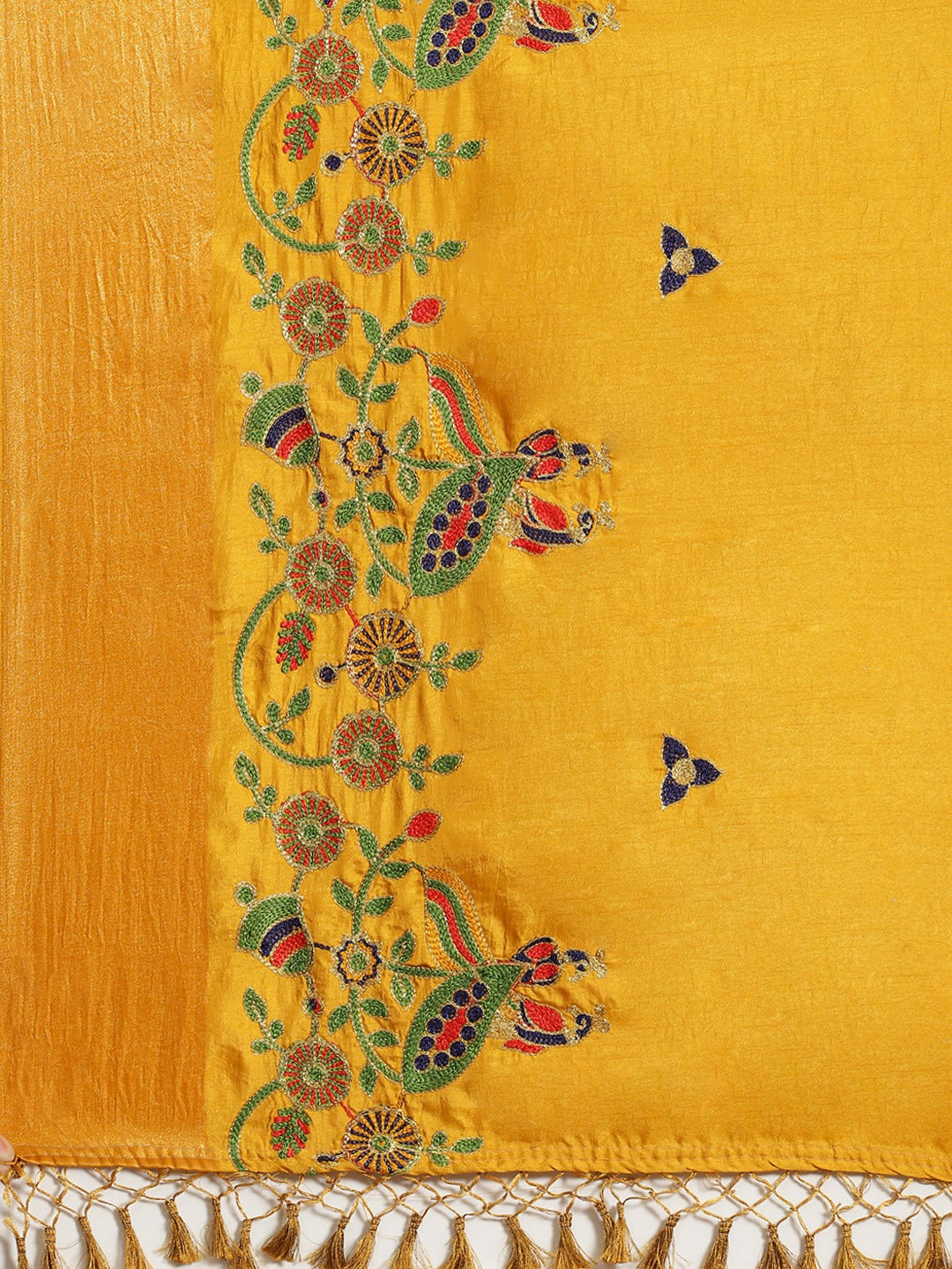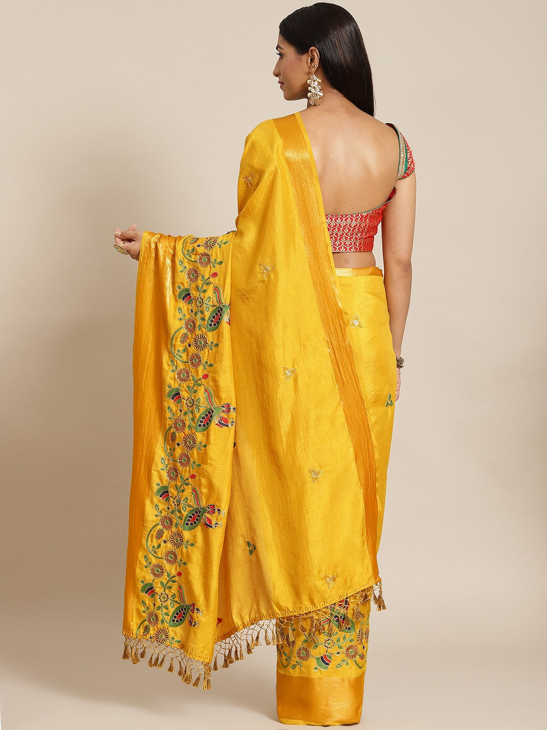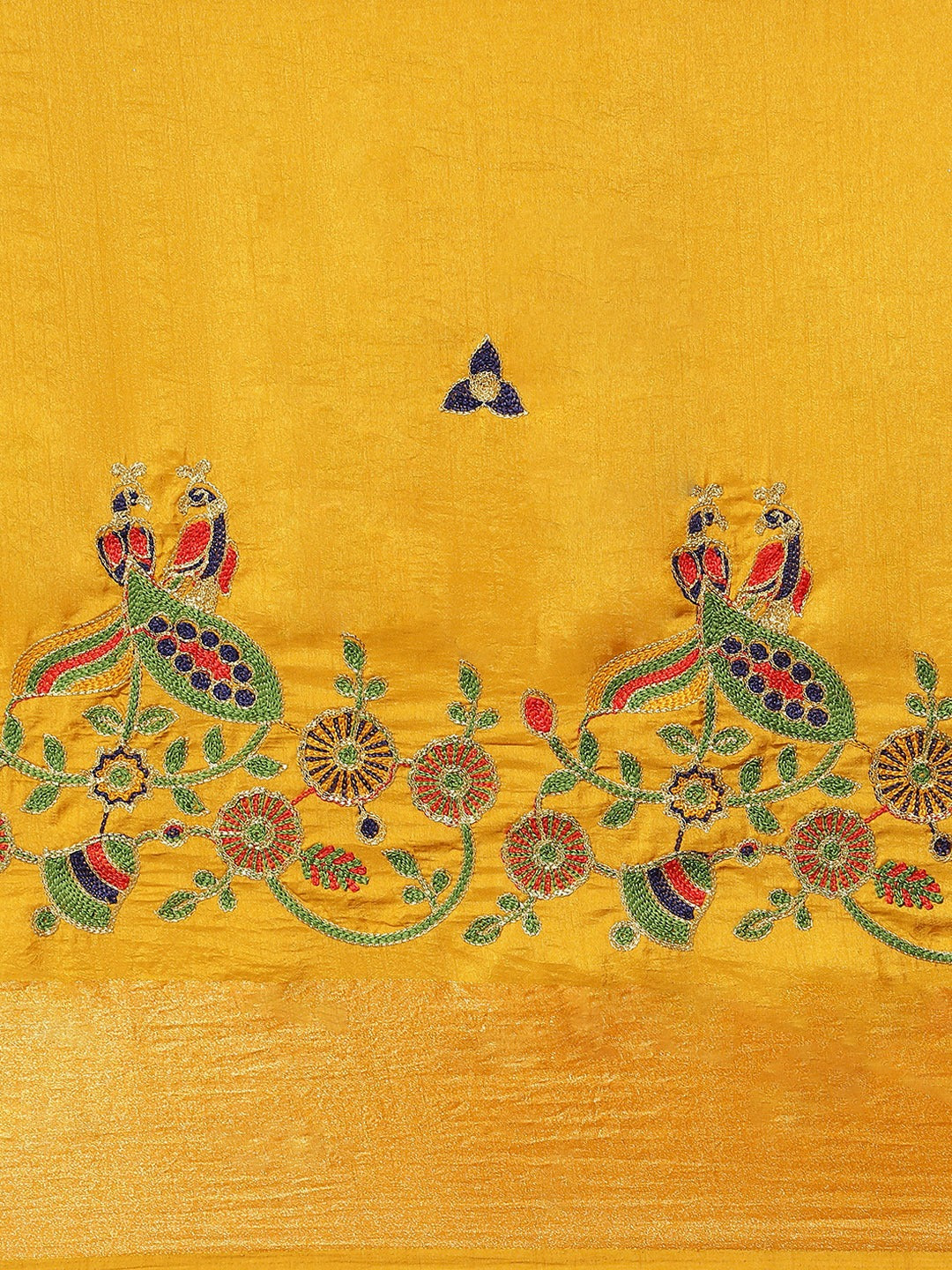 Mustard Silk Multicolor Embroidery Peacock Motifs Traditional Saree