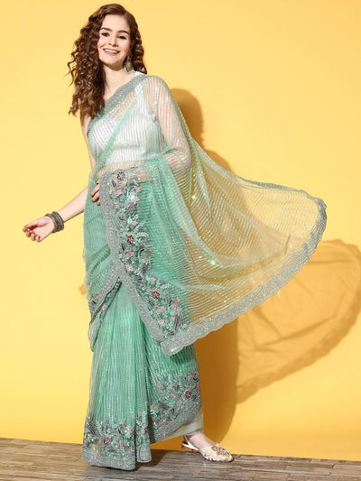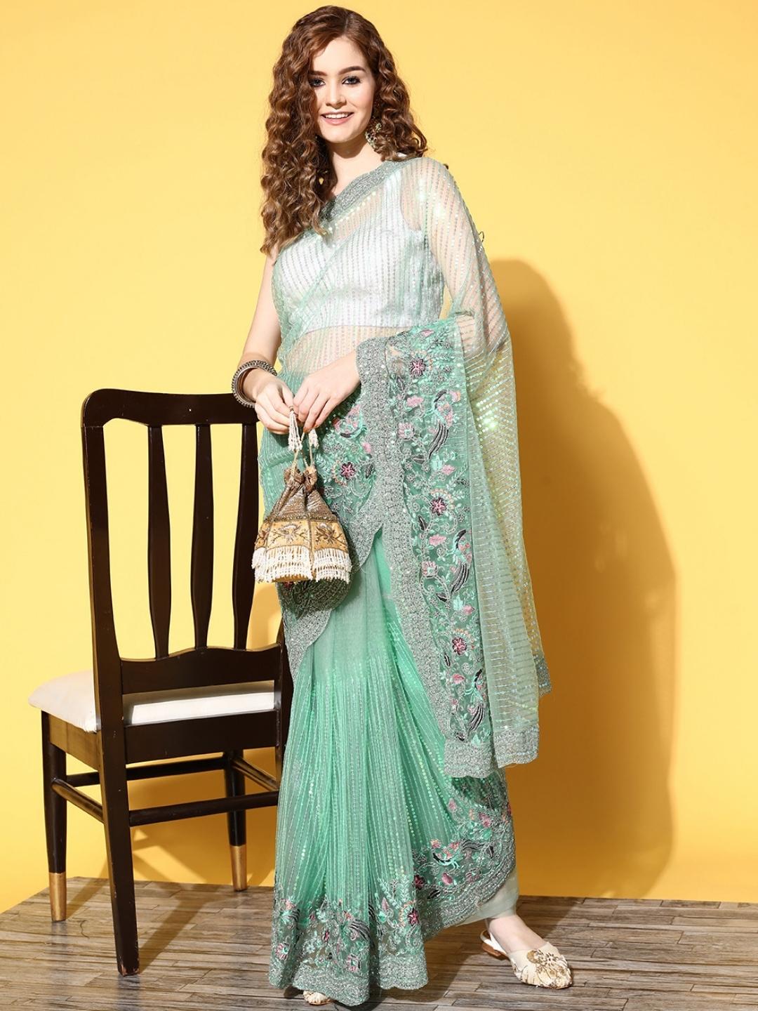 Teal Green Heavy Metallic Sequence Embroidered Fancy Party Wear Saree