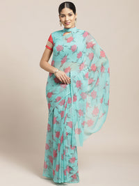 Pastel Summer Chiffon Saree with Contemporary Floral Prints and Gold Zari Border