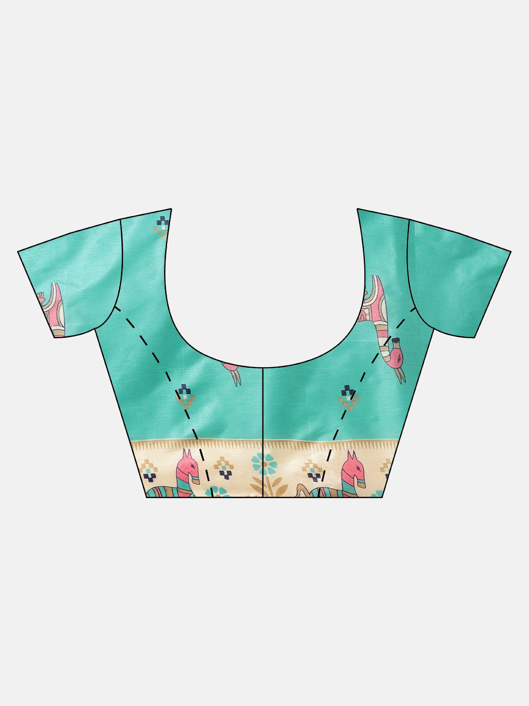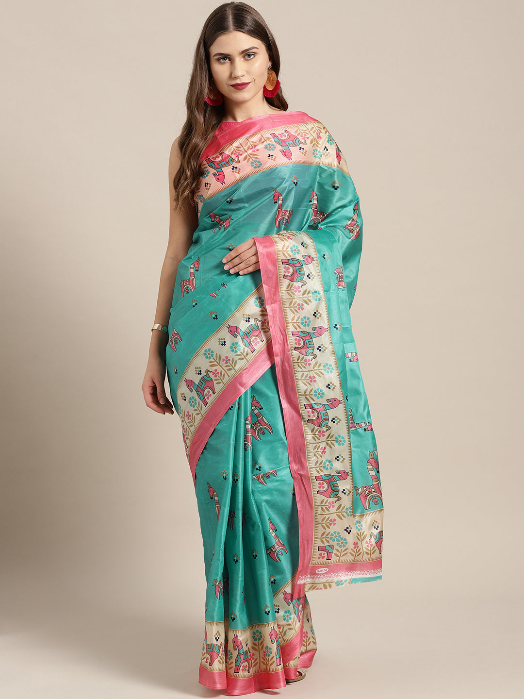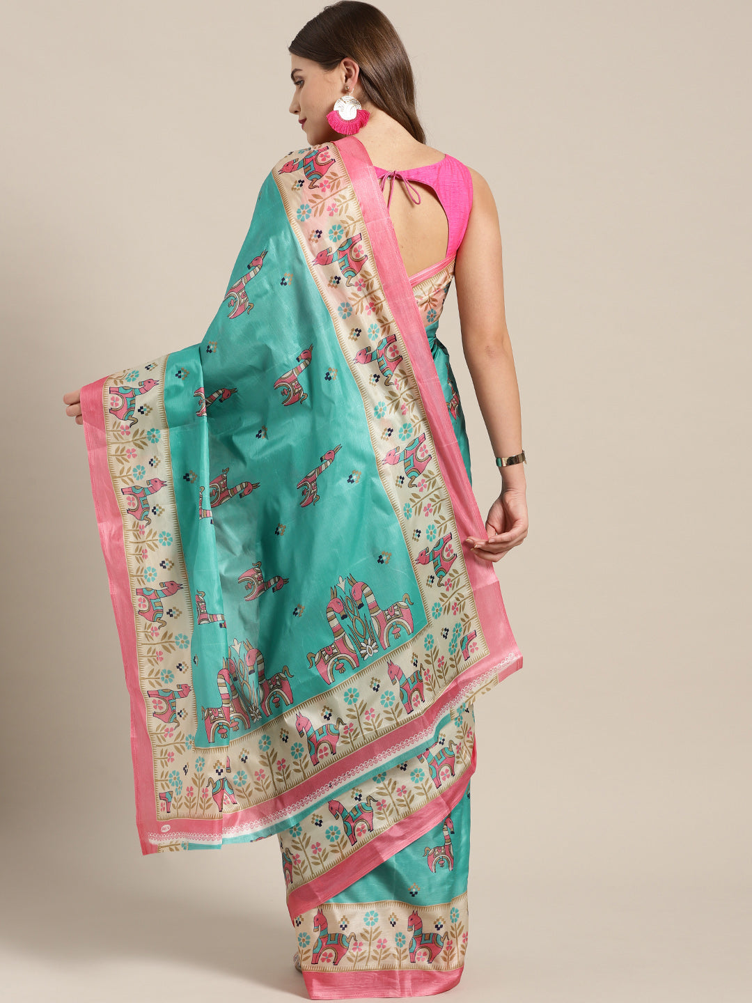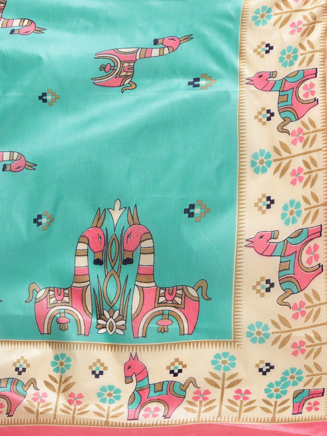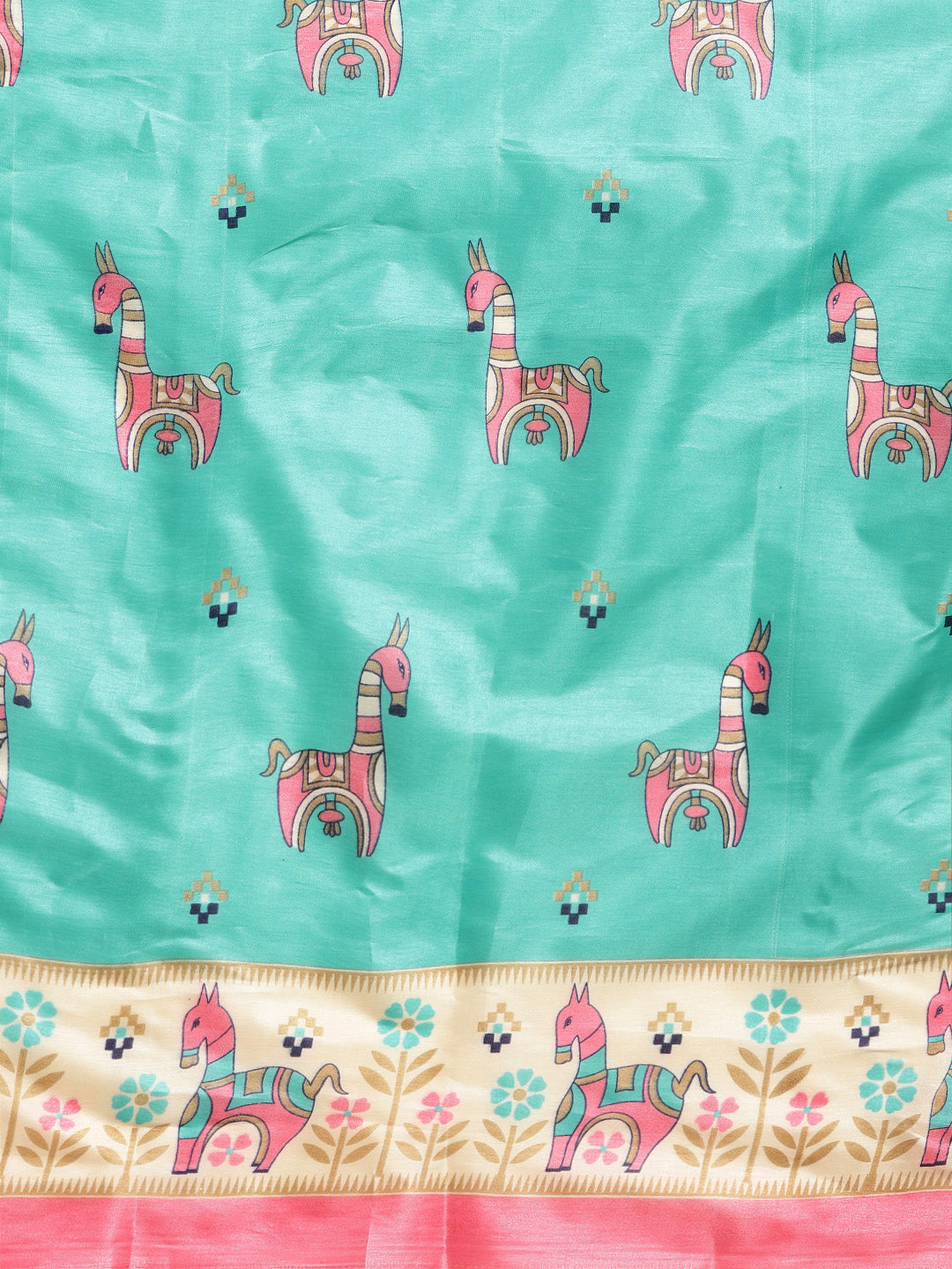 Turquoise Pink Printed Bhagalpuri Saree with Bright animal and geometric motifs