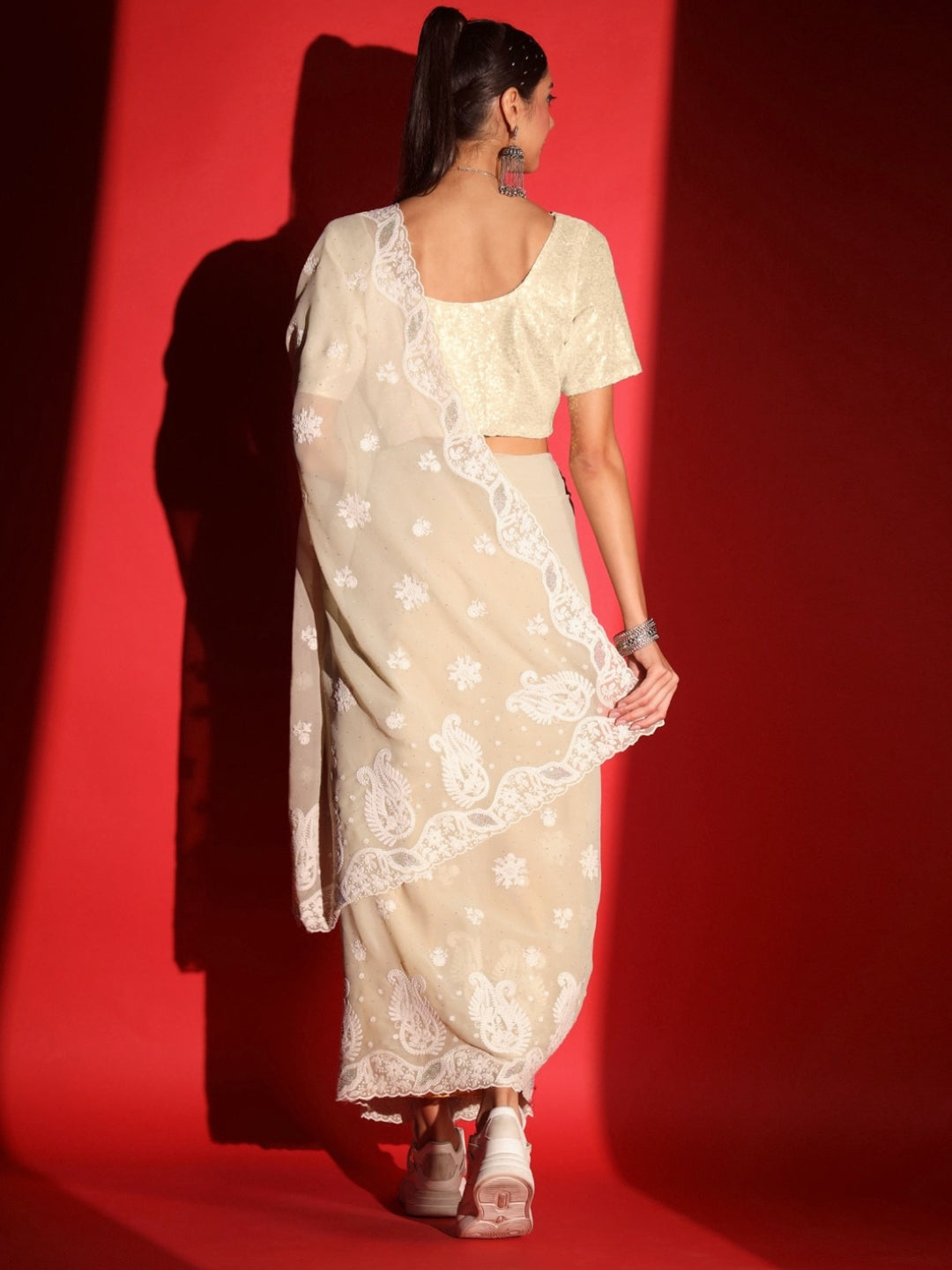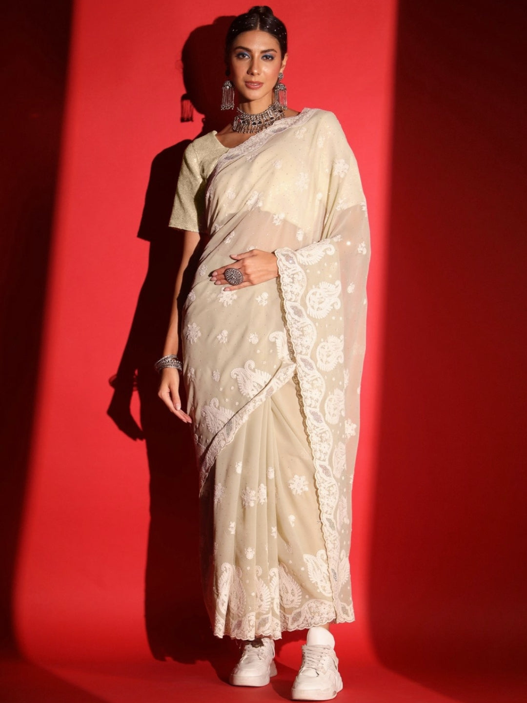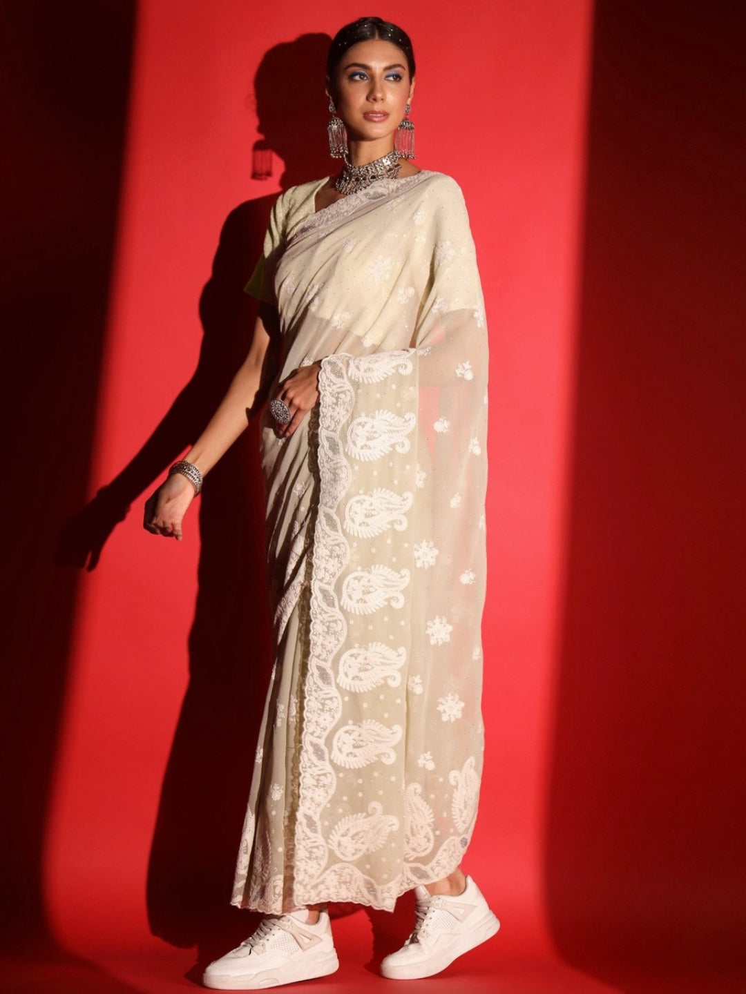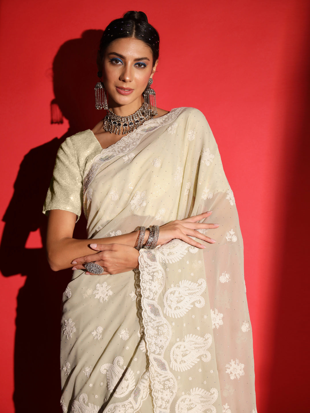 Pastel Resham Thread Embroidered & Crystal Embellished Saree