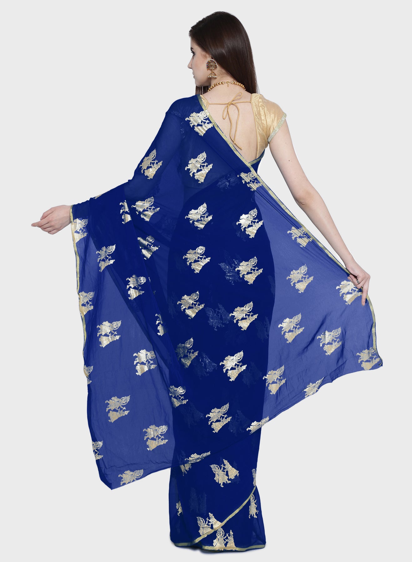 Blue Chiffon Foil Print Party Wear Saree with Ethnic Radha Kishan Motifs