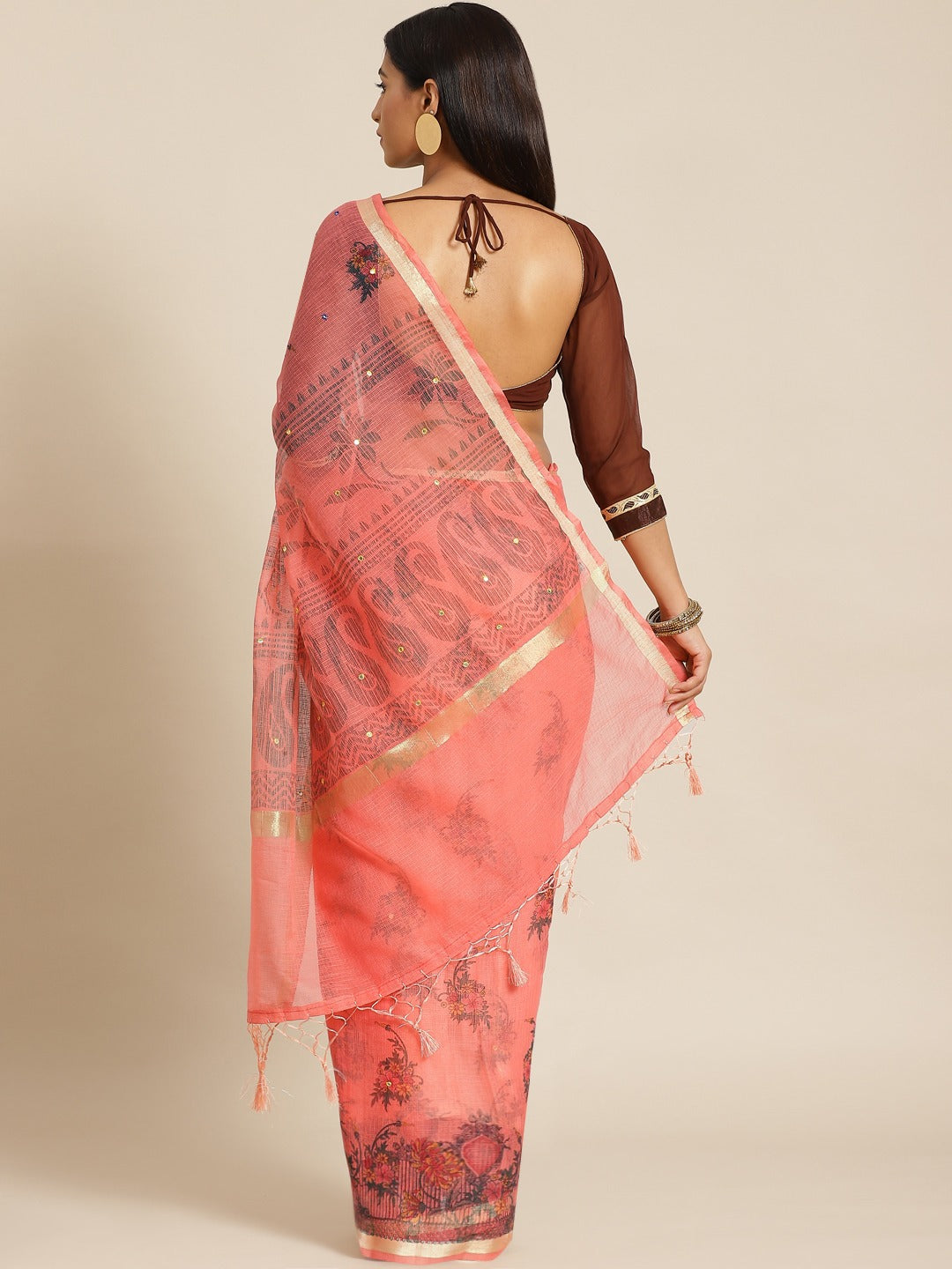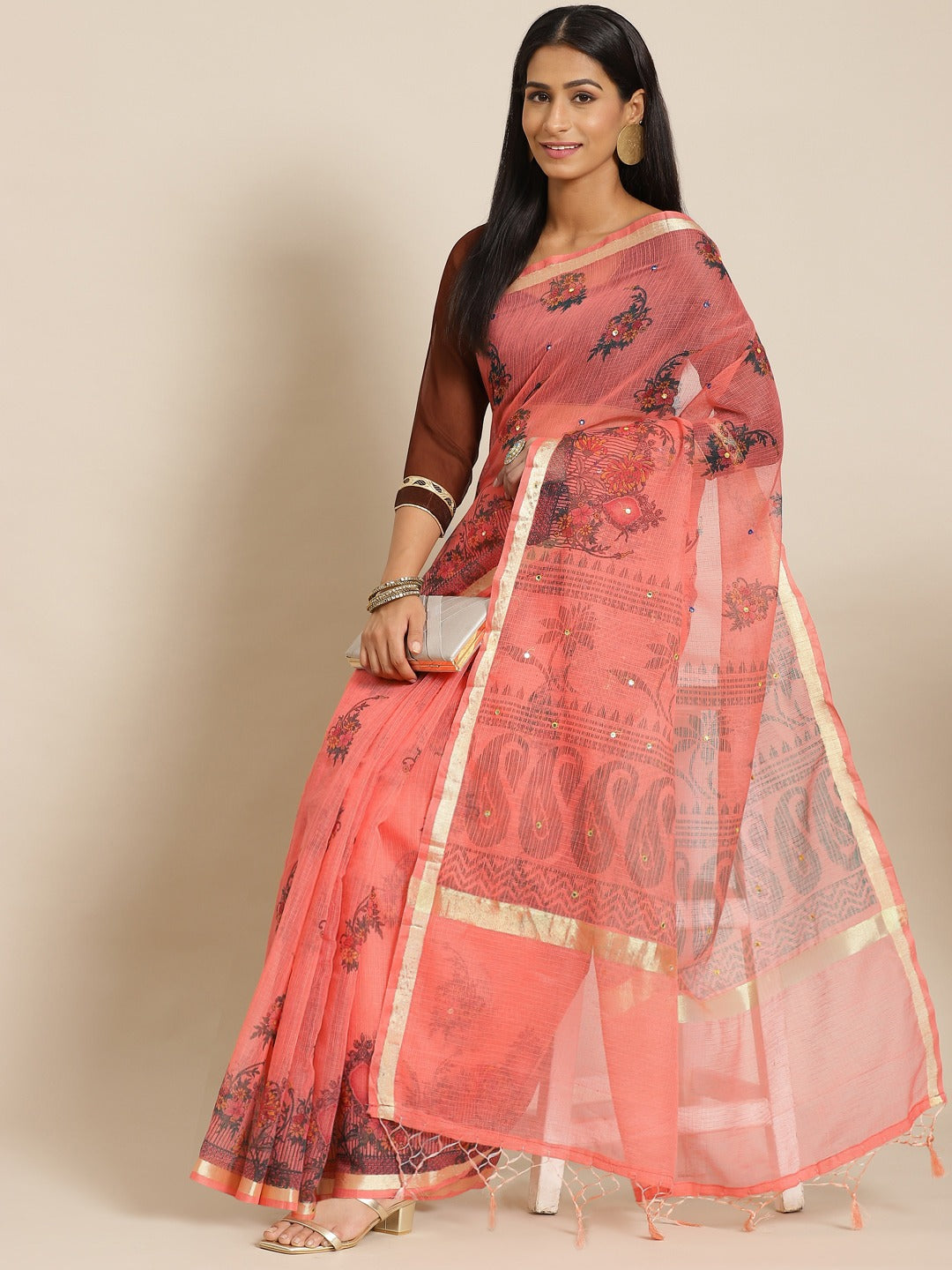 Pastel Peach Floral Figital Printed Kota Mirror Work Chanderi Saree
