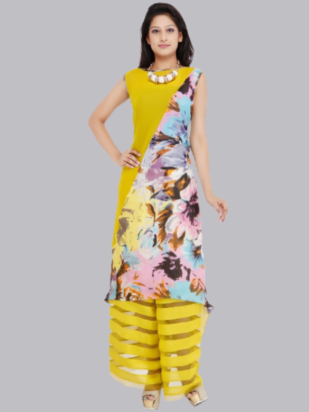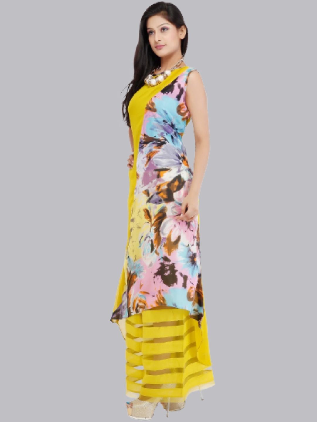 Yellow Umbrella Style Half & Half Floral Kurti With Palazzo