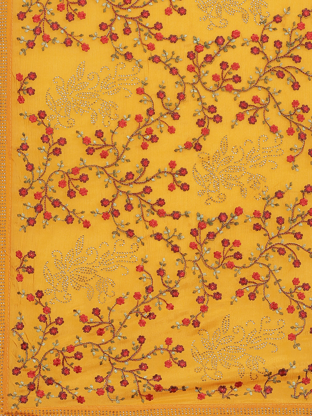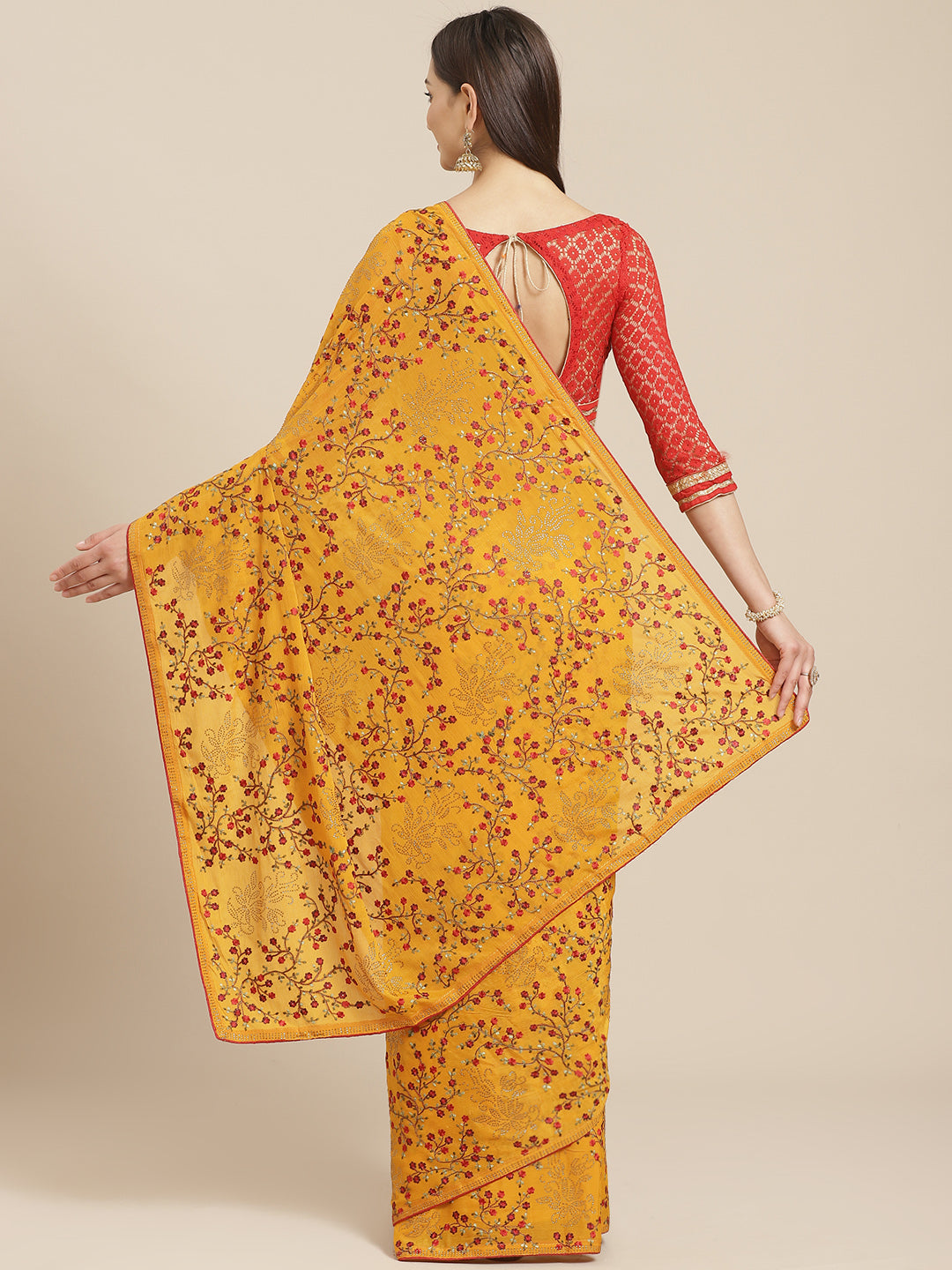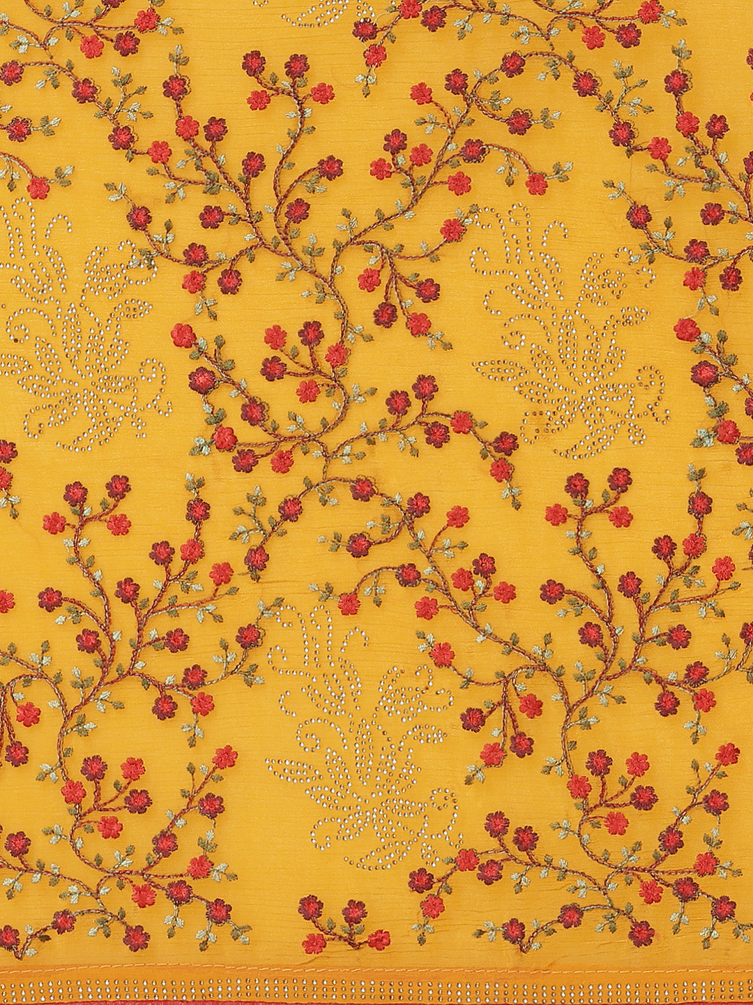 Mustard Yellow Georgette Saree with multicolor Resham Embroidered Flowers & Crystal Embellishments