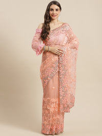 Pastel Net Zari & Resham Floral Embroidery Saree With Crystal & Scalloped Cutwork Border
