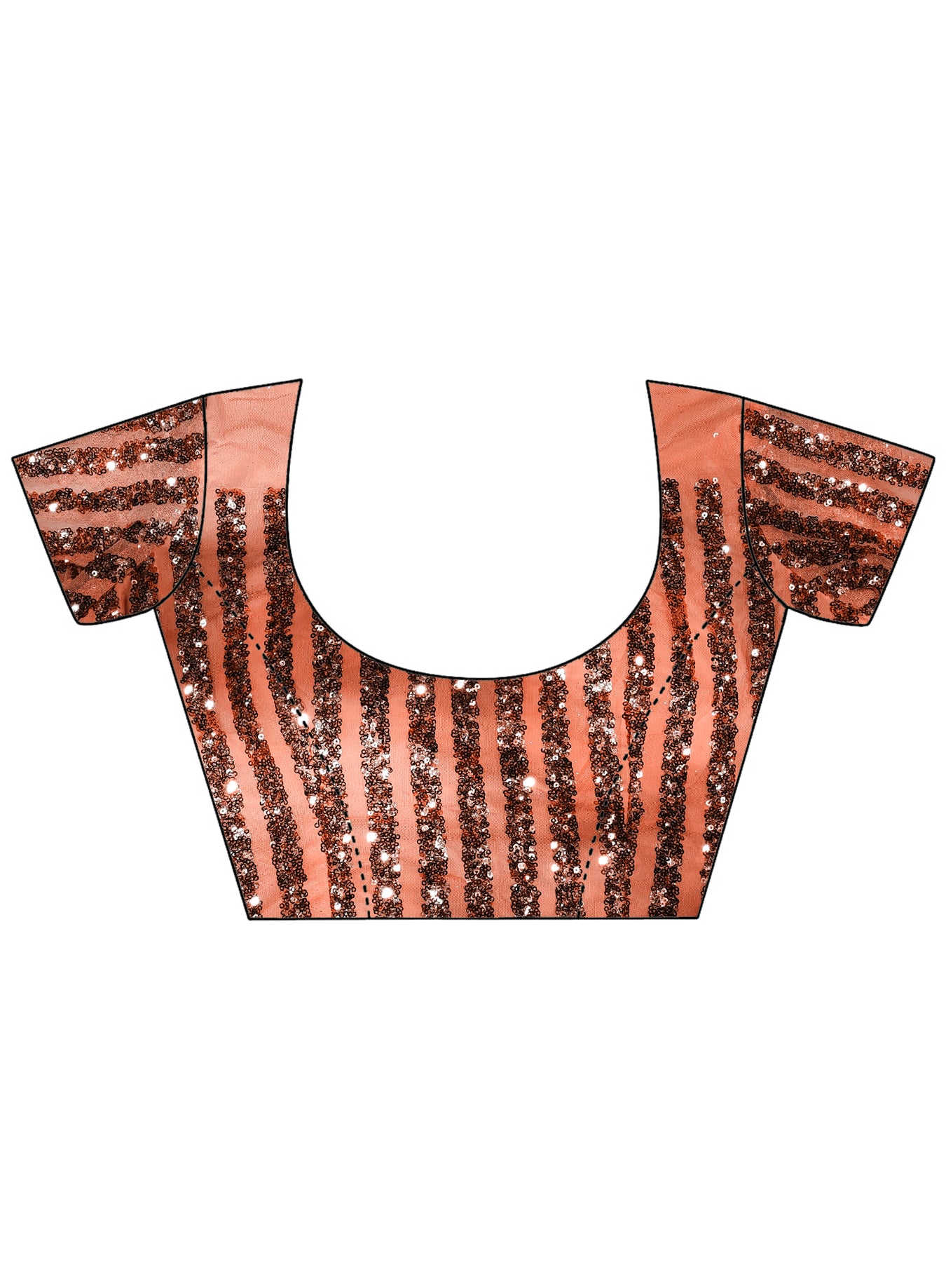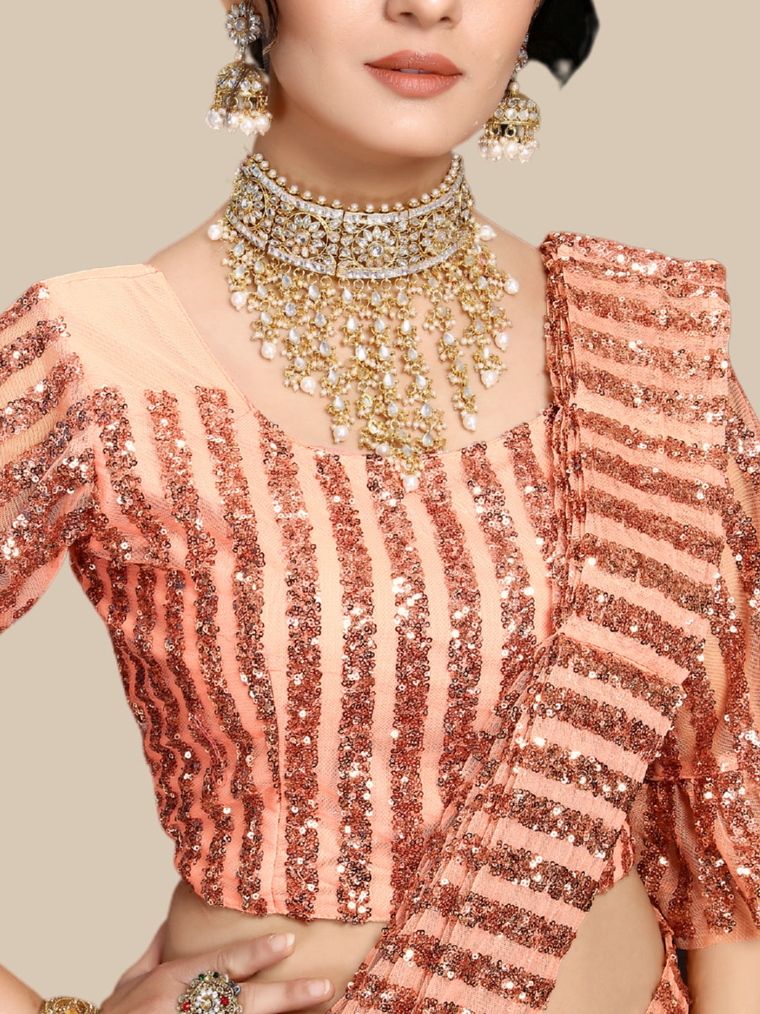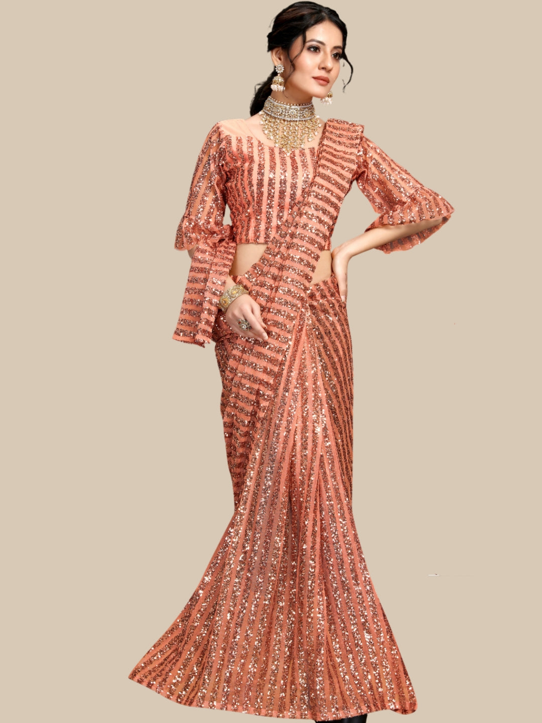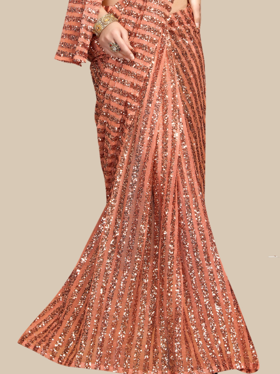 Peach Metallic Sequinned Party Wear Saree with Bell Sleeves Blouse