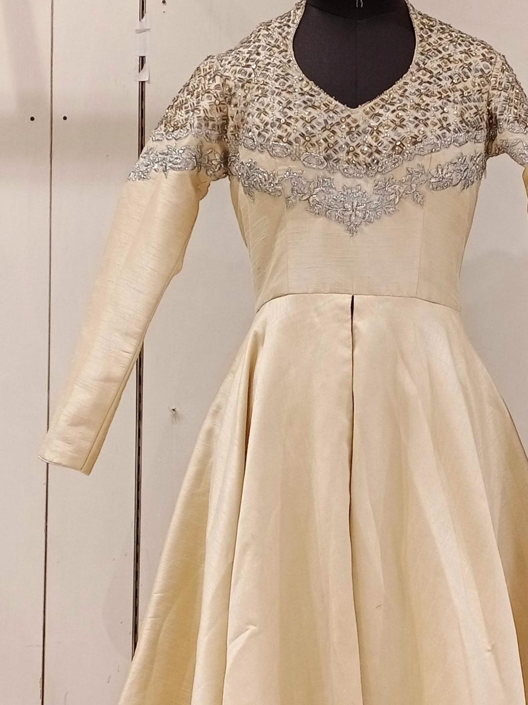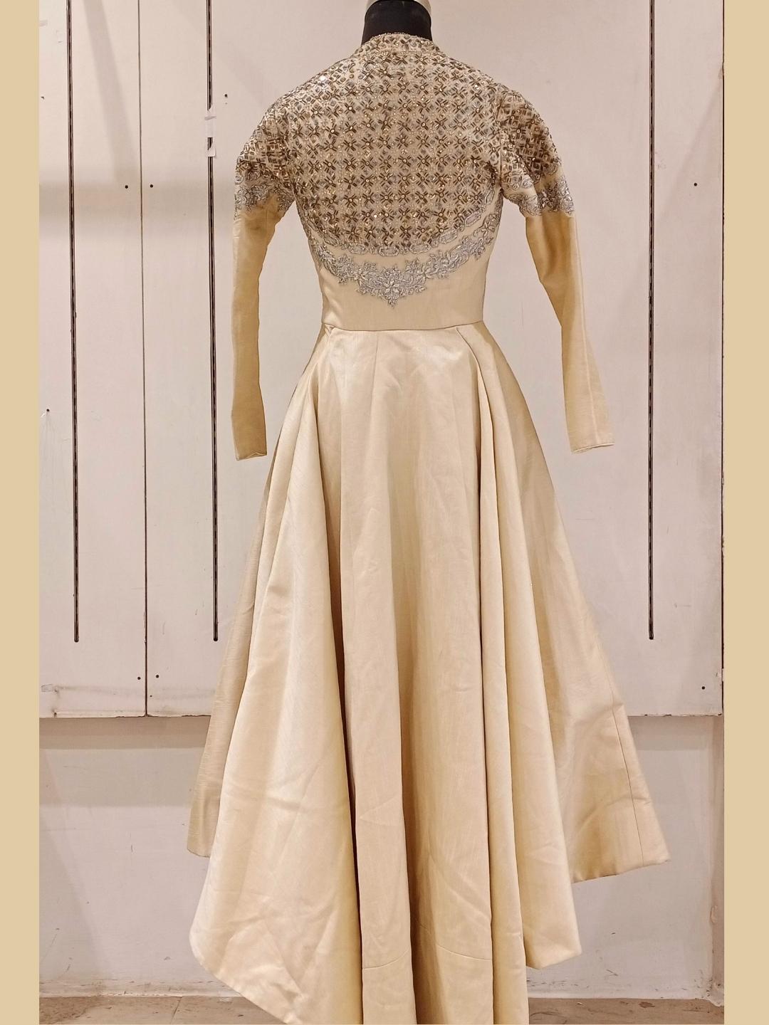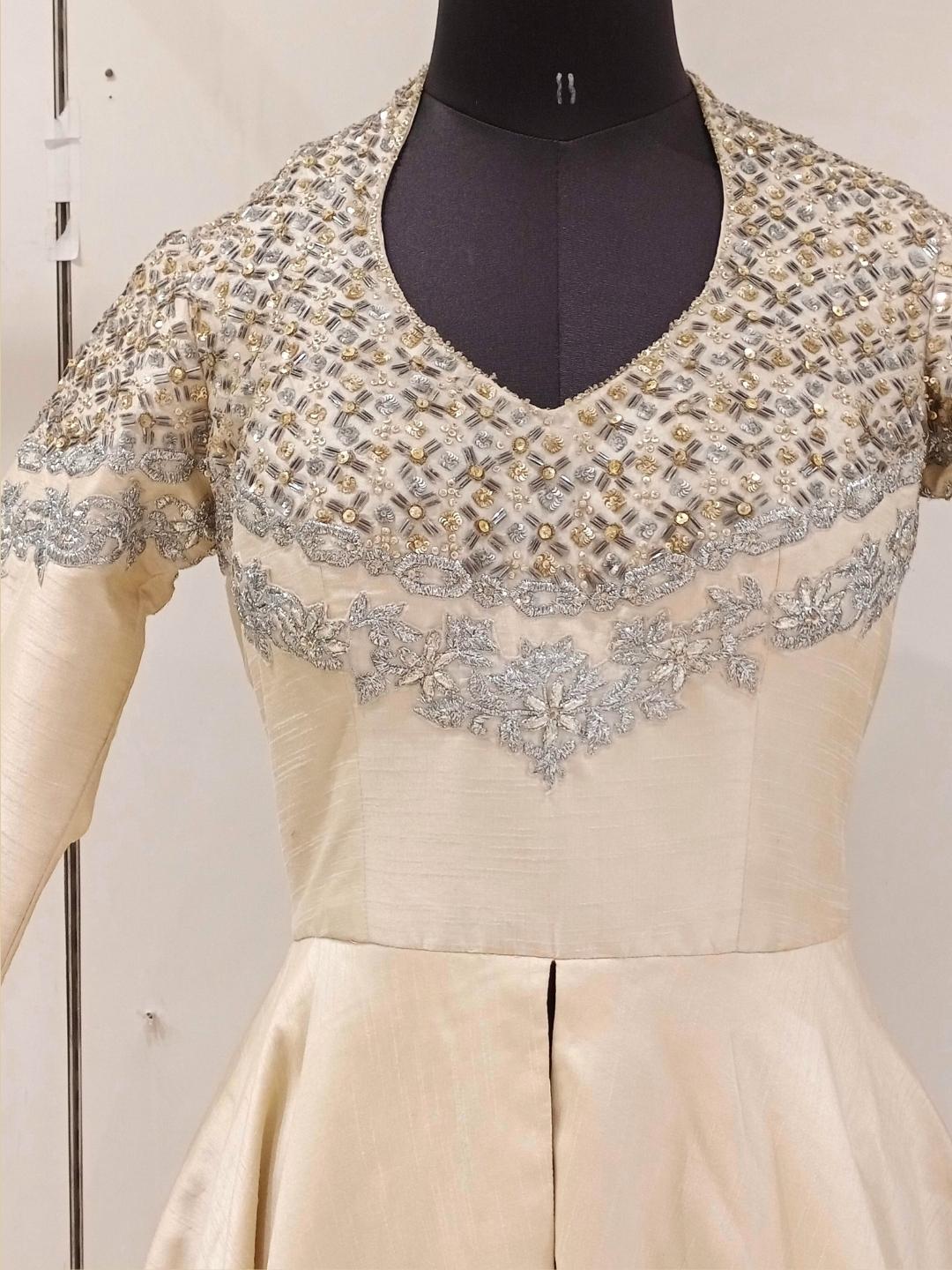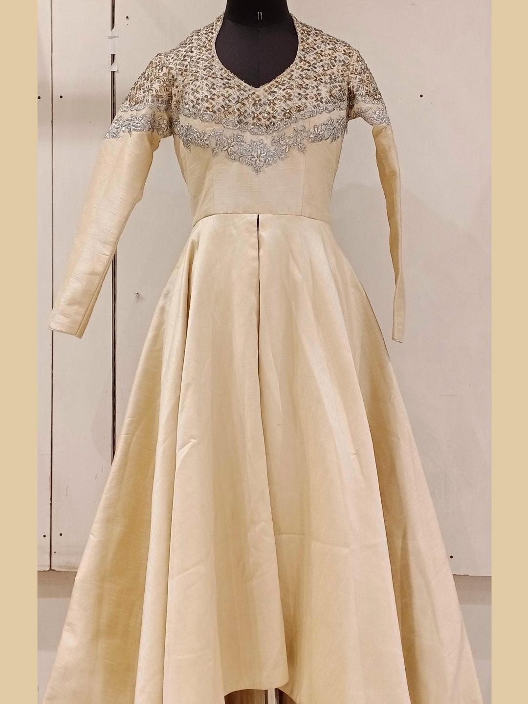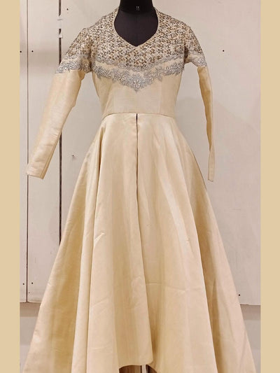 Cream Heavy Neck Embellished High Low Flared Gown Dress