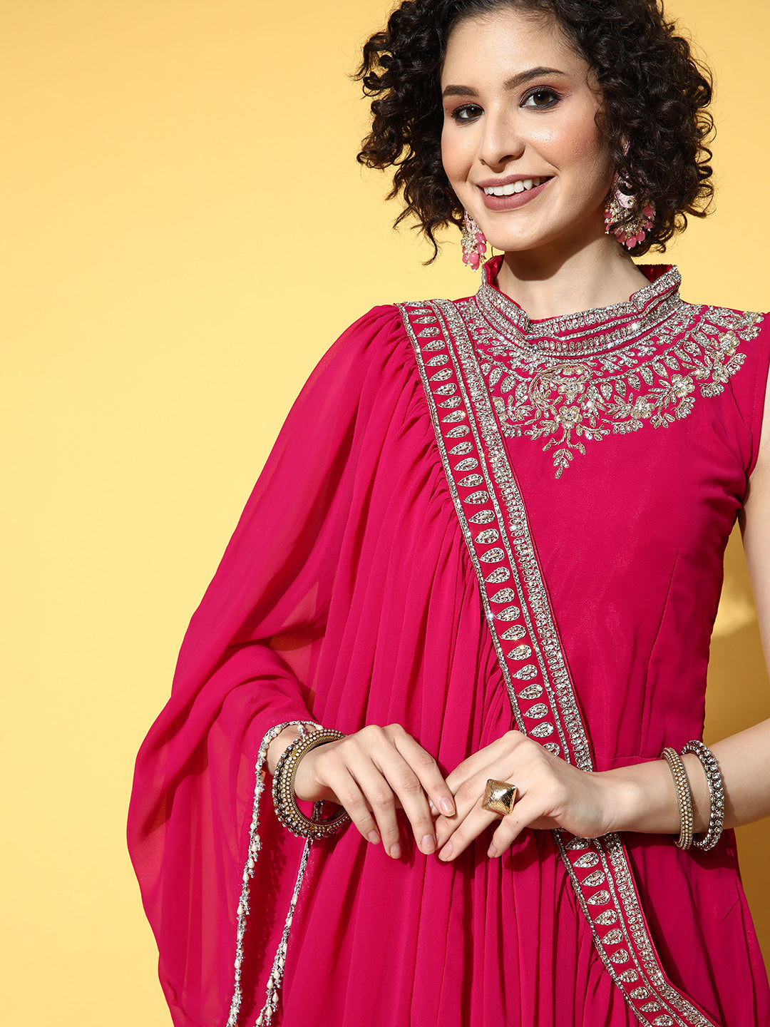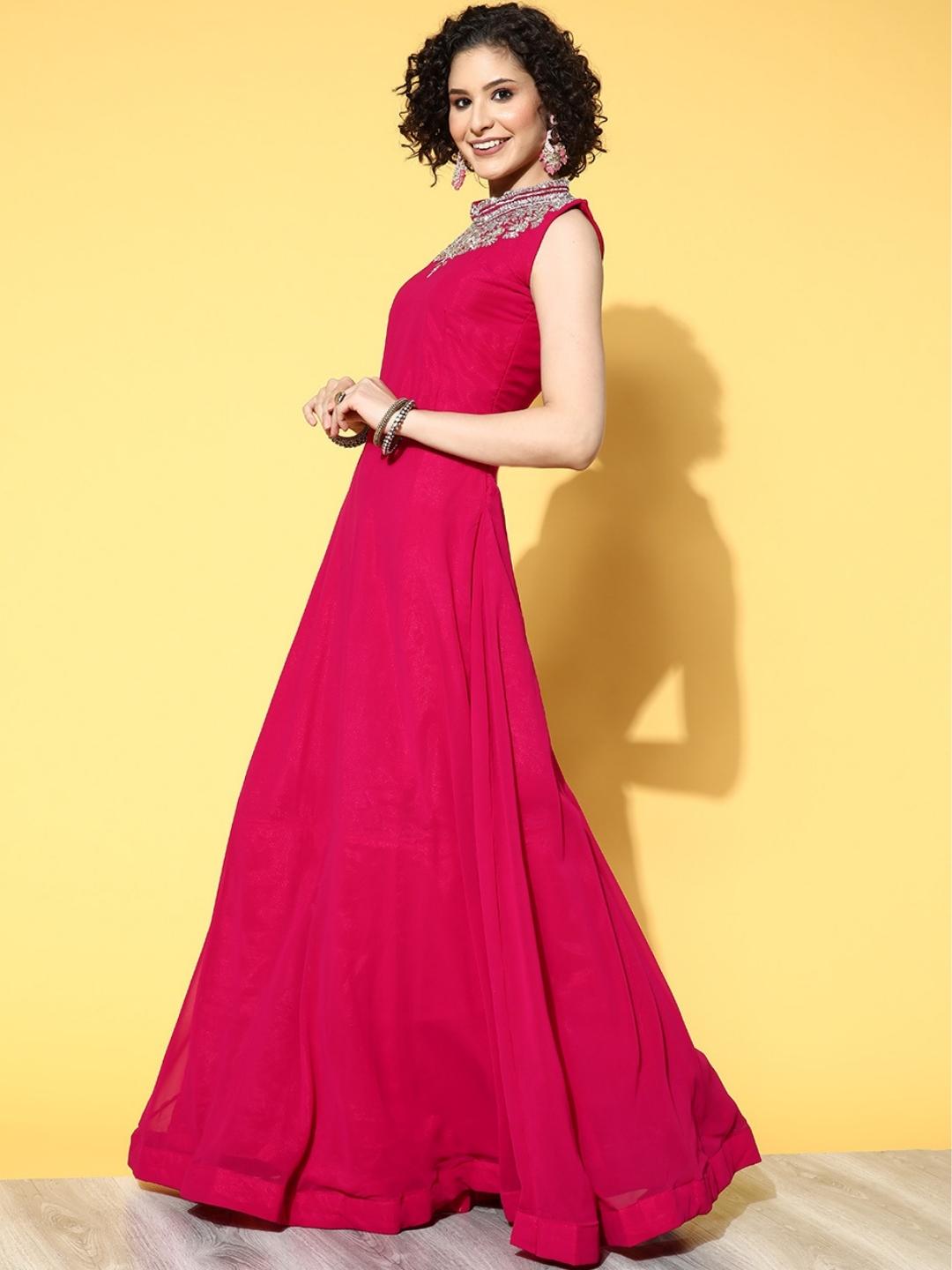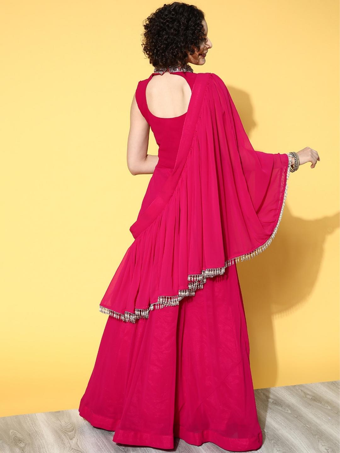 Keywords: Made to Measure, Magenta, Bright, Georgette, Stone Work, Flared, Gown, Solid, Fancy, Party, Embellished, Beautiful, Long, Fit & Flare, Cocktail, Maxi, Halter Neck, Party, Stylish Dupatta, Beads, Tassles, Asymmetric Dupatta