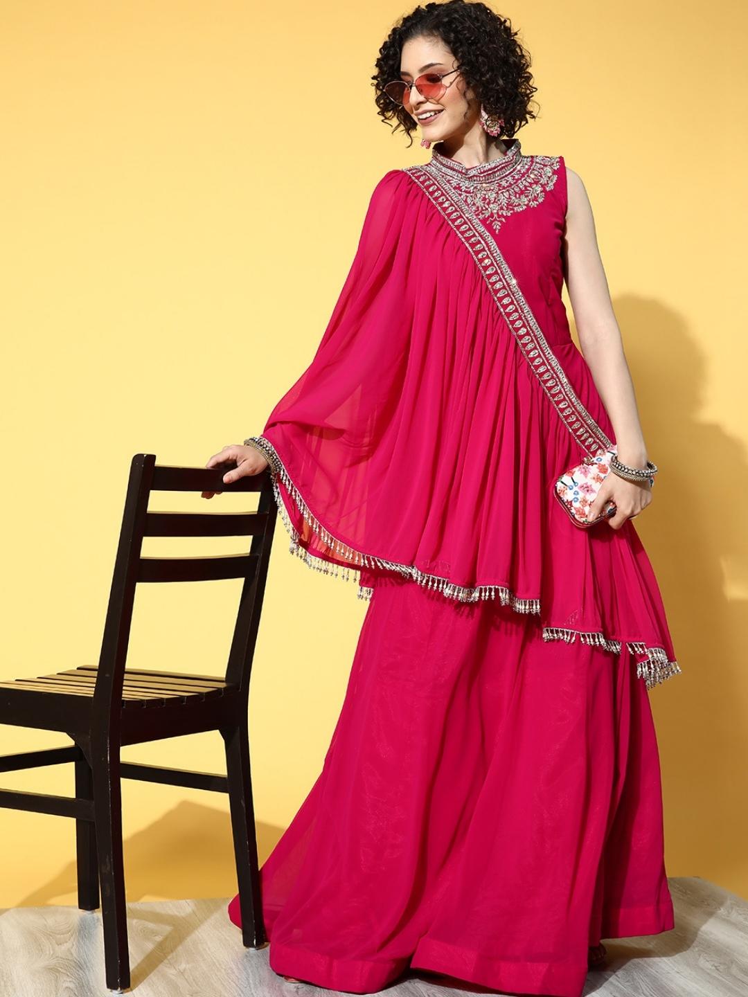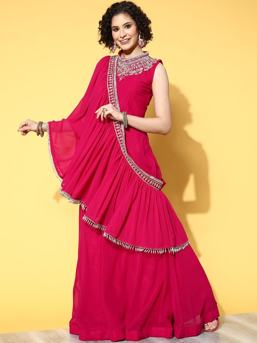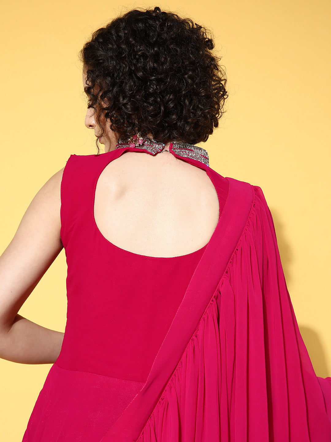 Keywords: Made to Measure, Magenta, Bright, Georgette, Stone Work, Flared, Gown, Solid, Fancy, Party, Embellished, Beautiful, Long, Fit & Flare, Cocktail, Maxi, Halter Neck, Party, Stylish Dupatta, Beads, Tassles, Asymmetric Dupatta