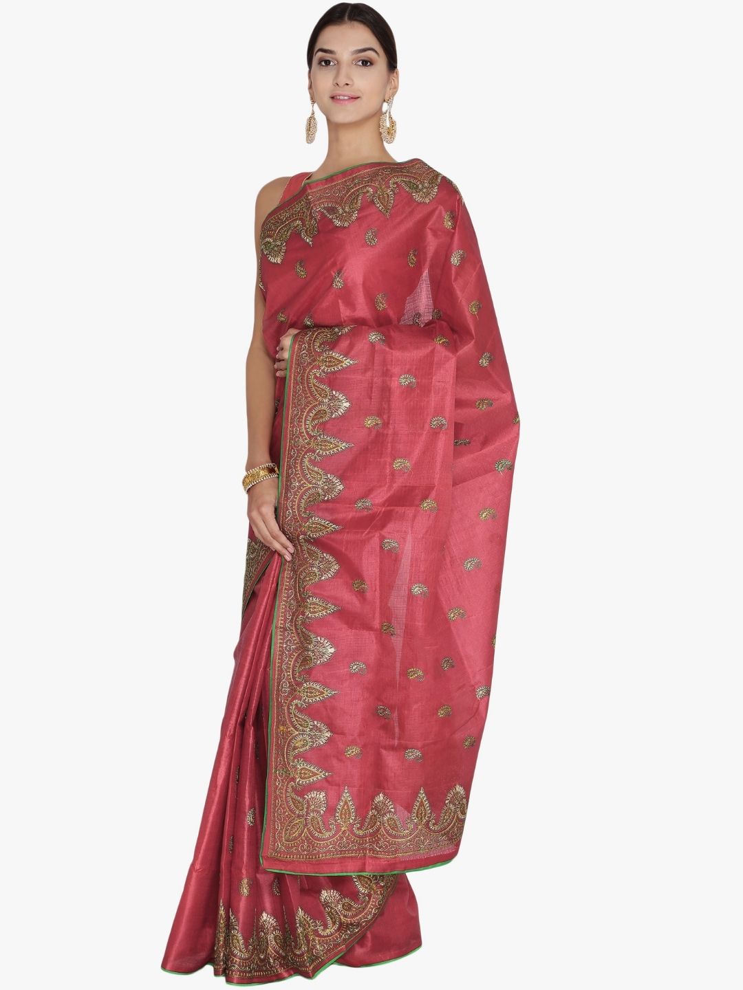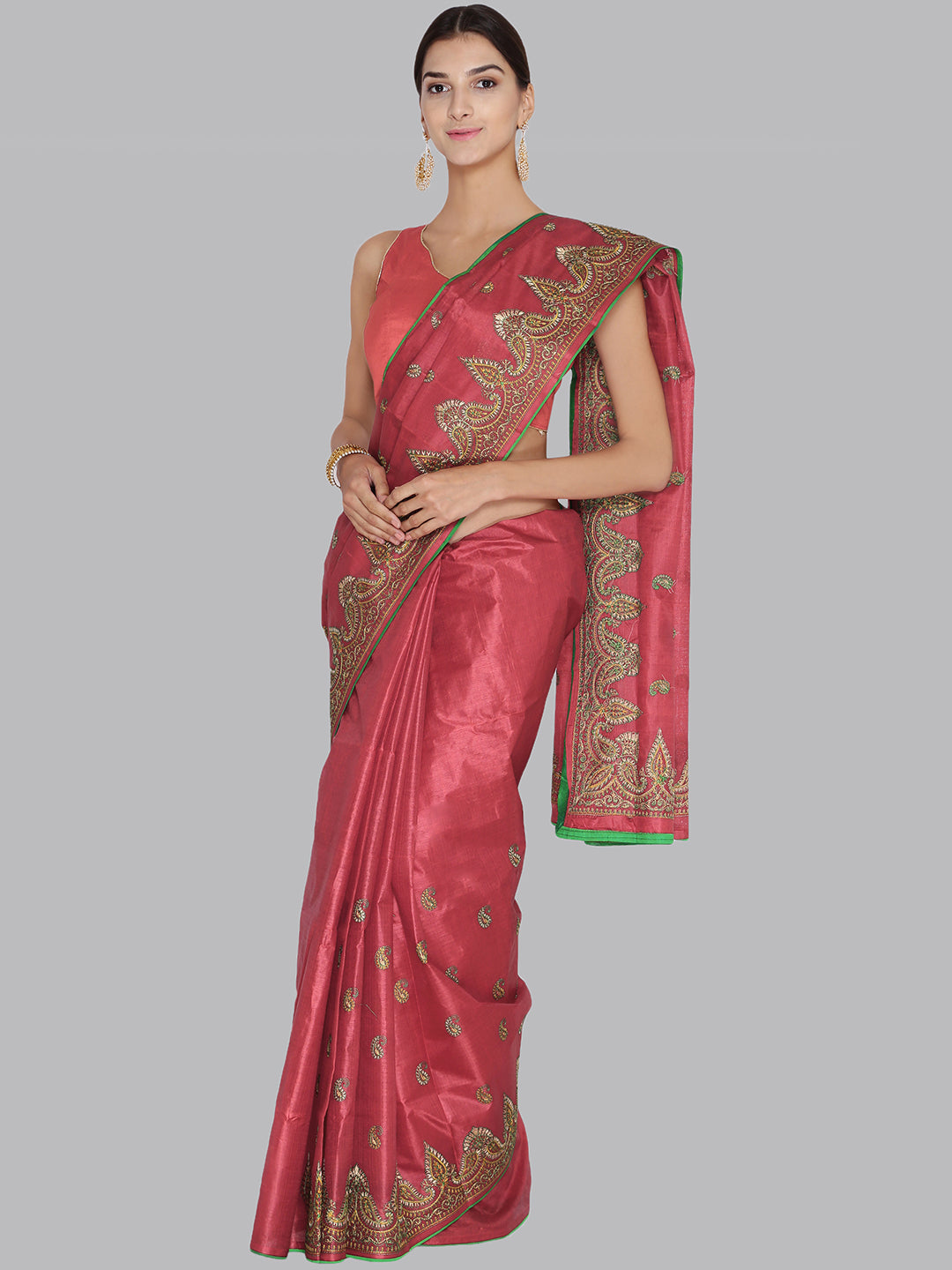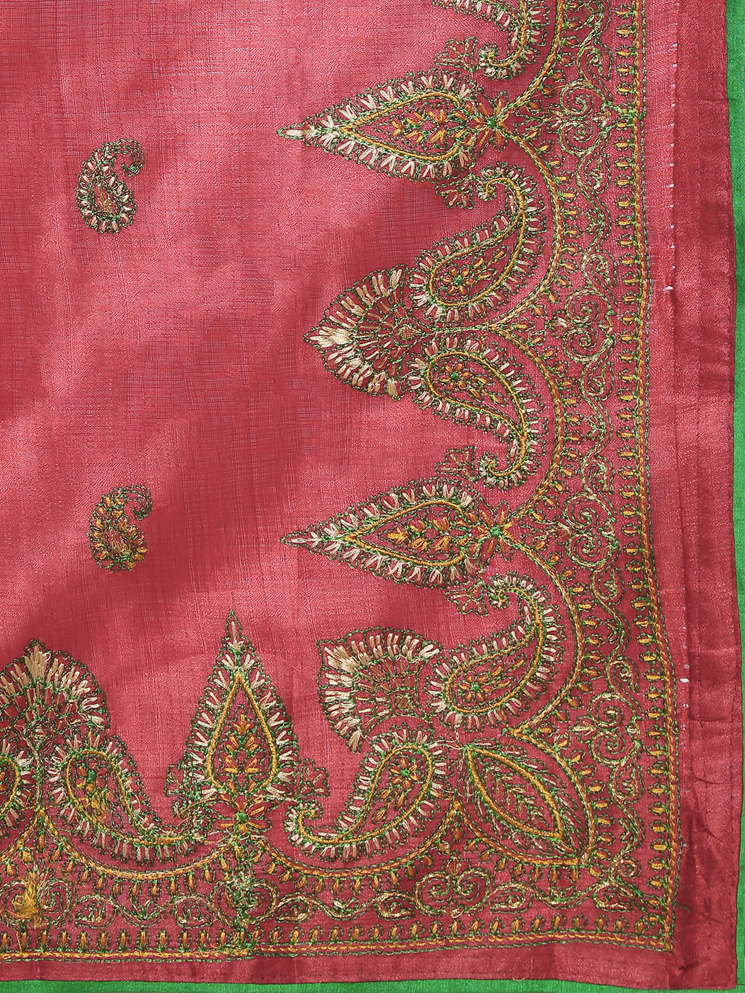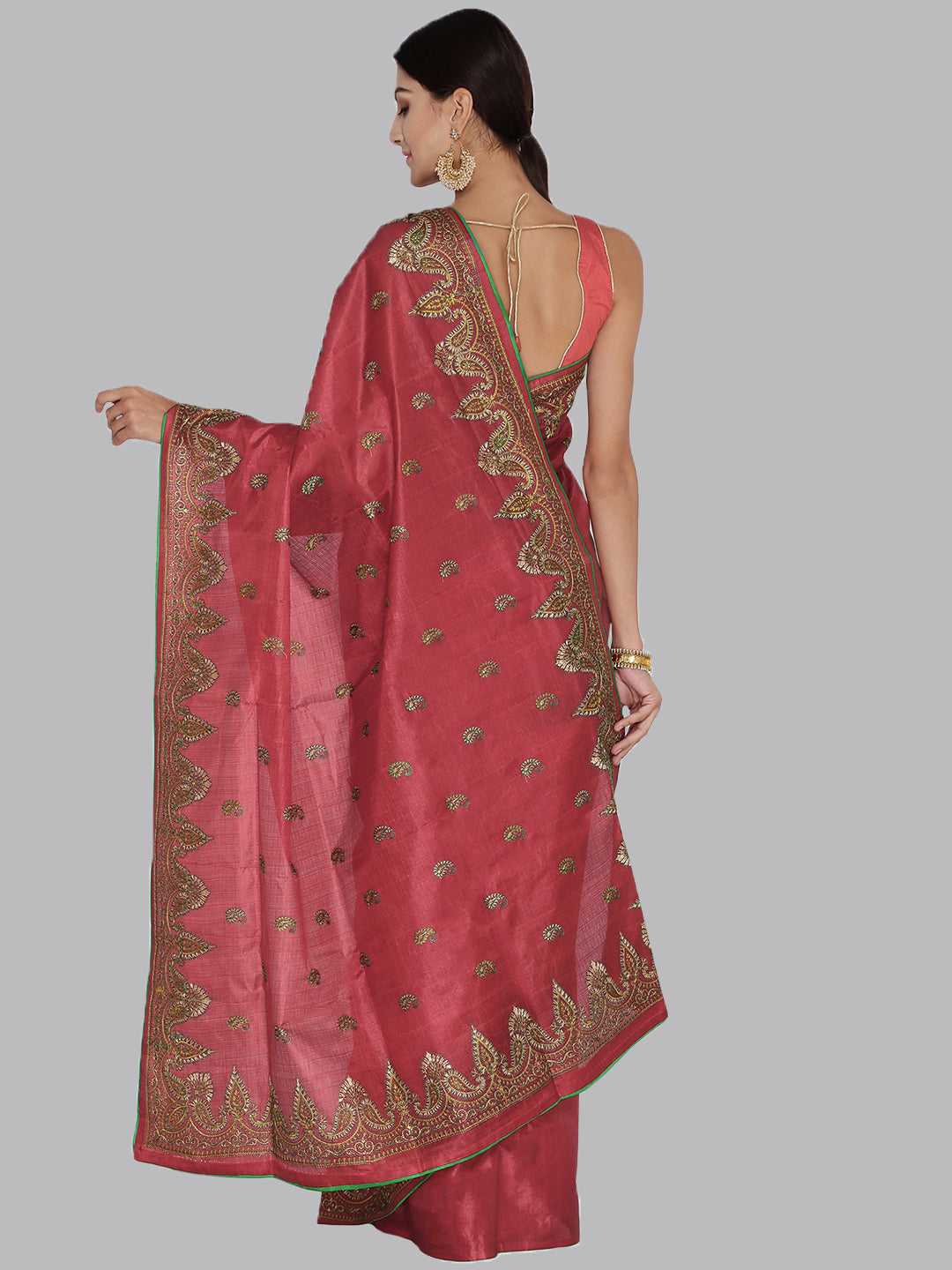Bright Red Tussar Silk Saree with Resham Embroidery