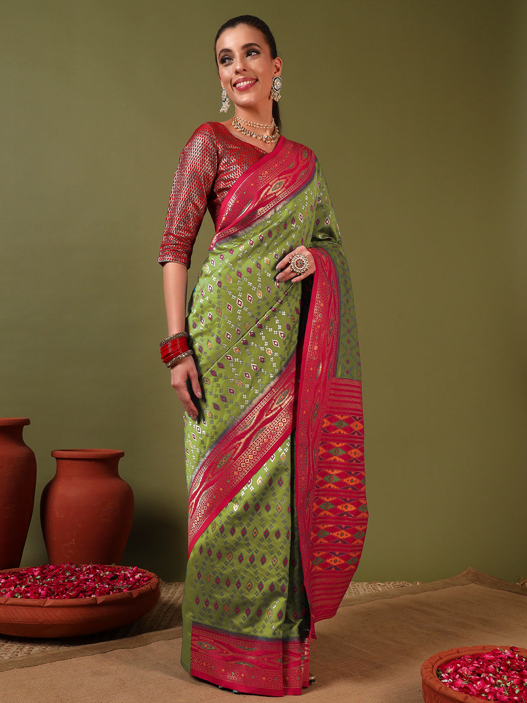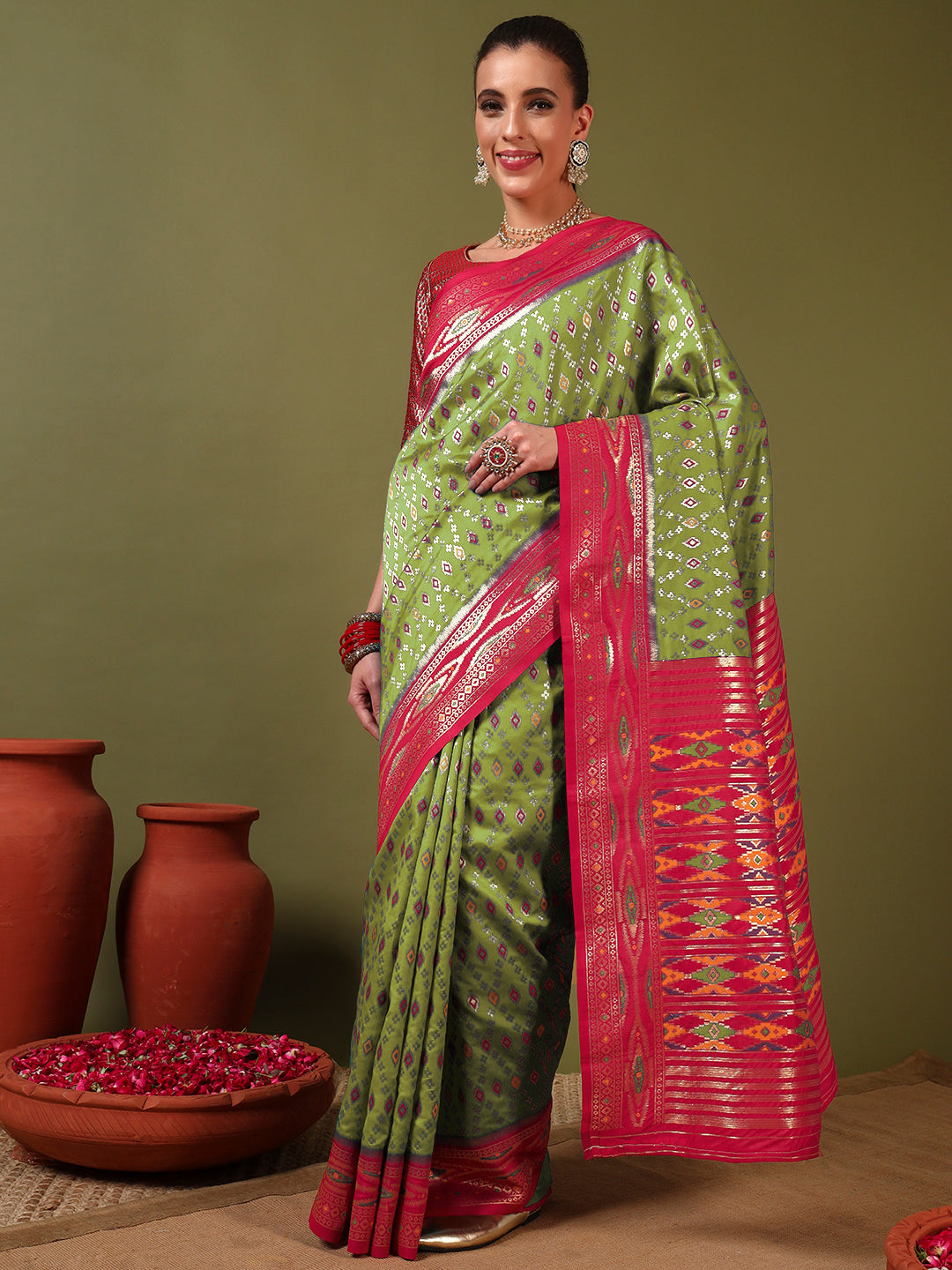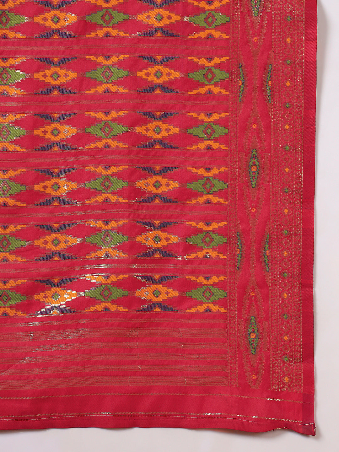 Rich Ikat Pochampally Silk Saree with Meenakari Weaving & Contrast Border