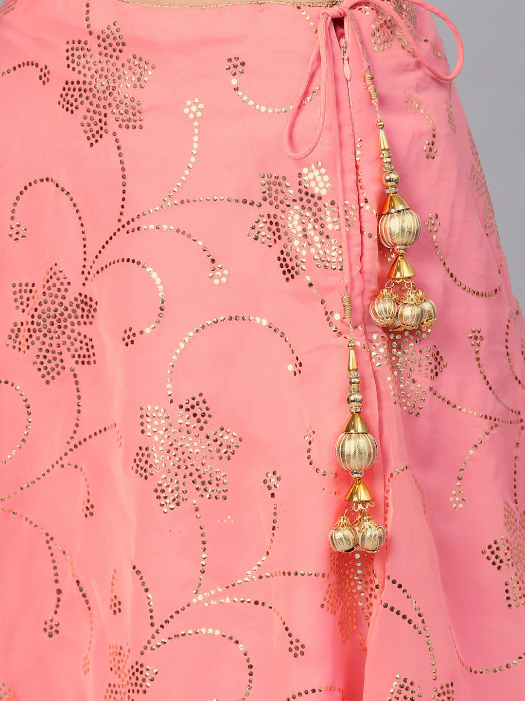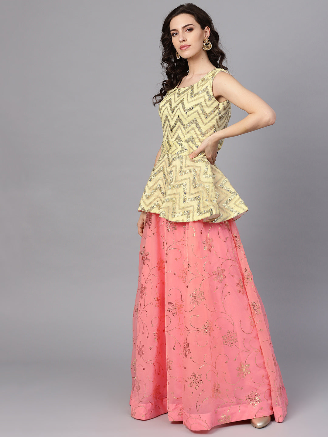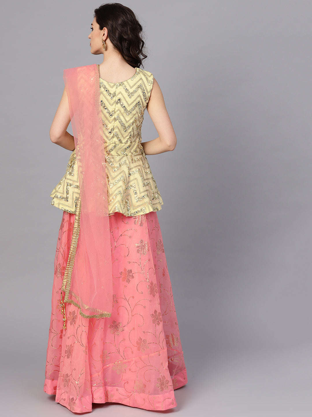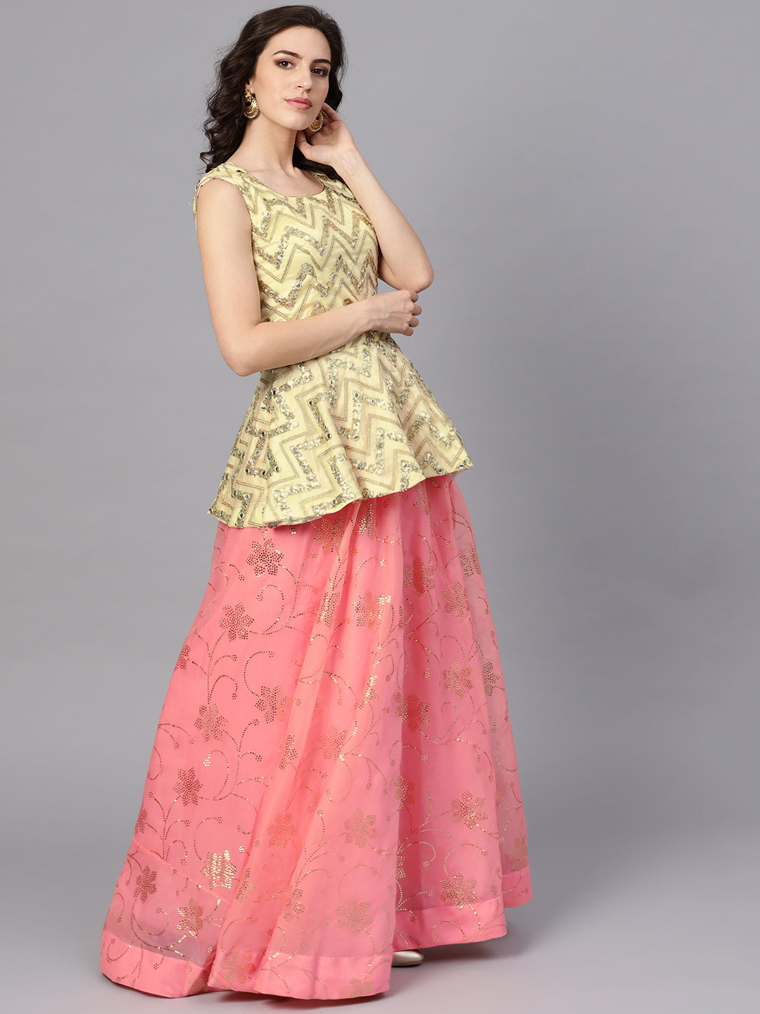Peplum Crop Top Lehenga with Foil Print, Mirror Work
