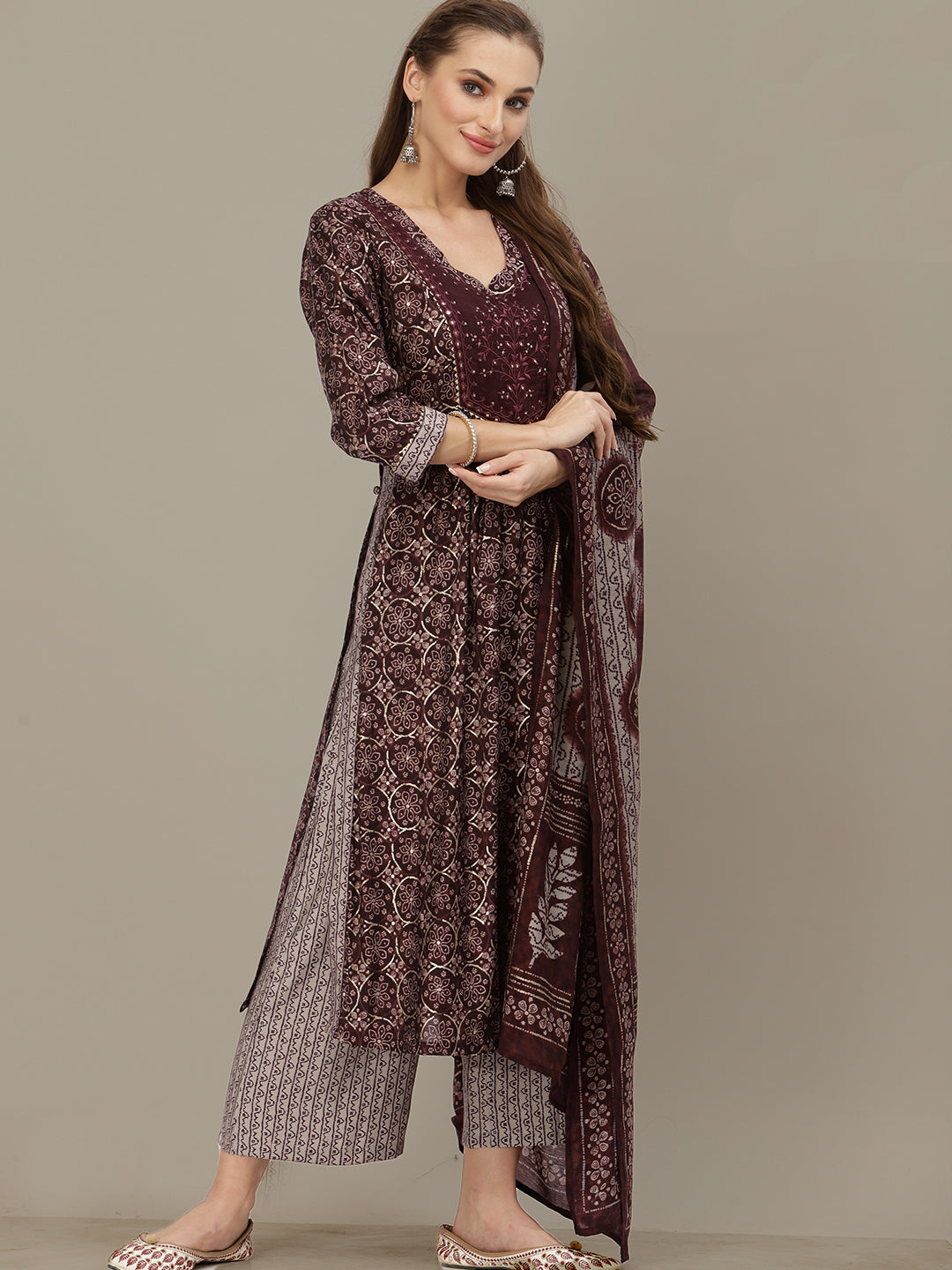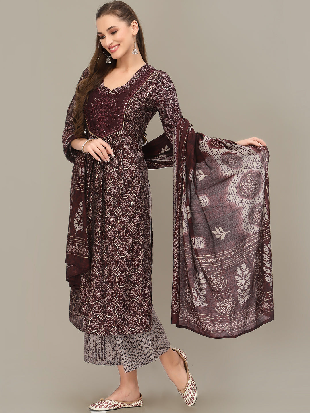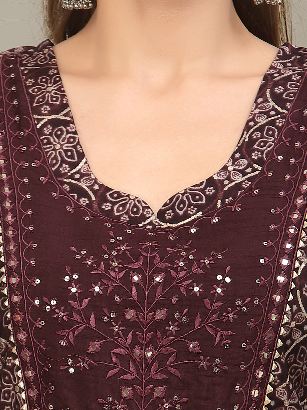 Burgundy Digital Indi Prints Kurta Palazzo & Mirror Resham Embroidery