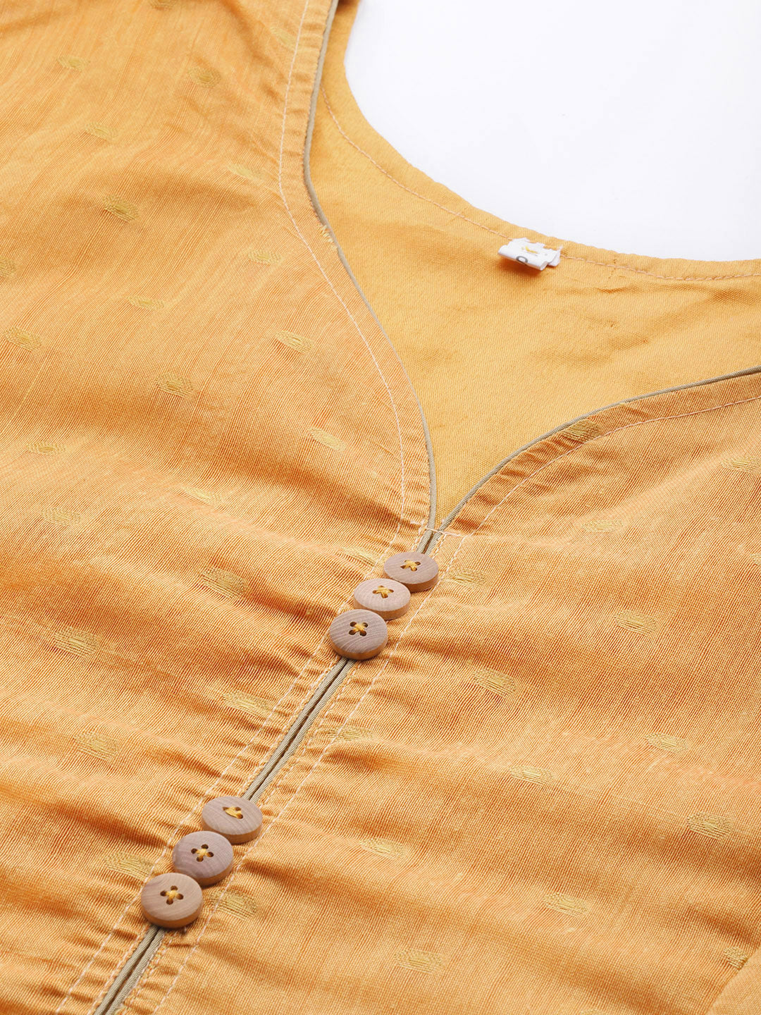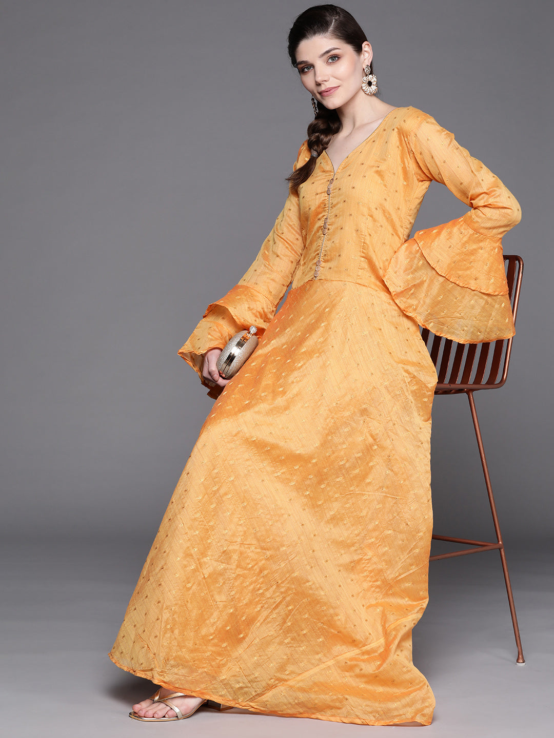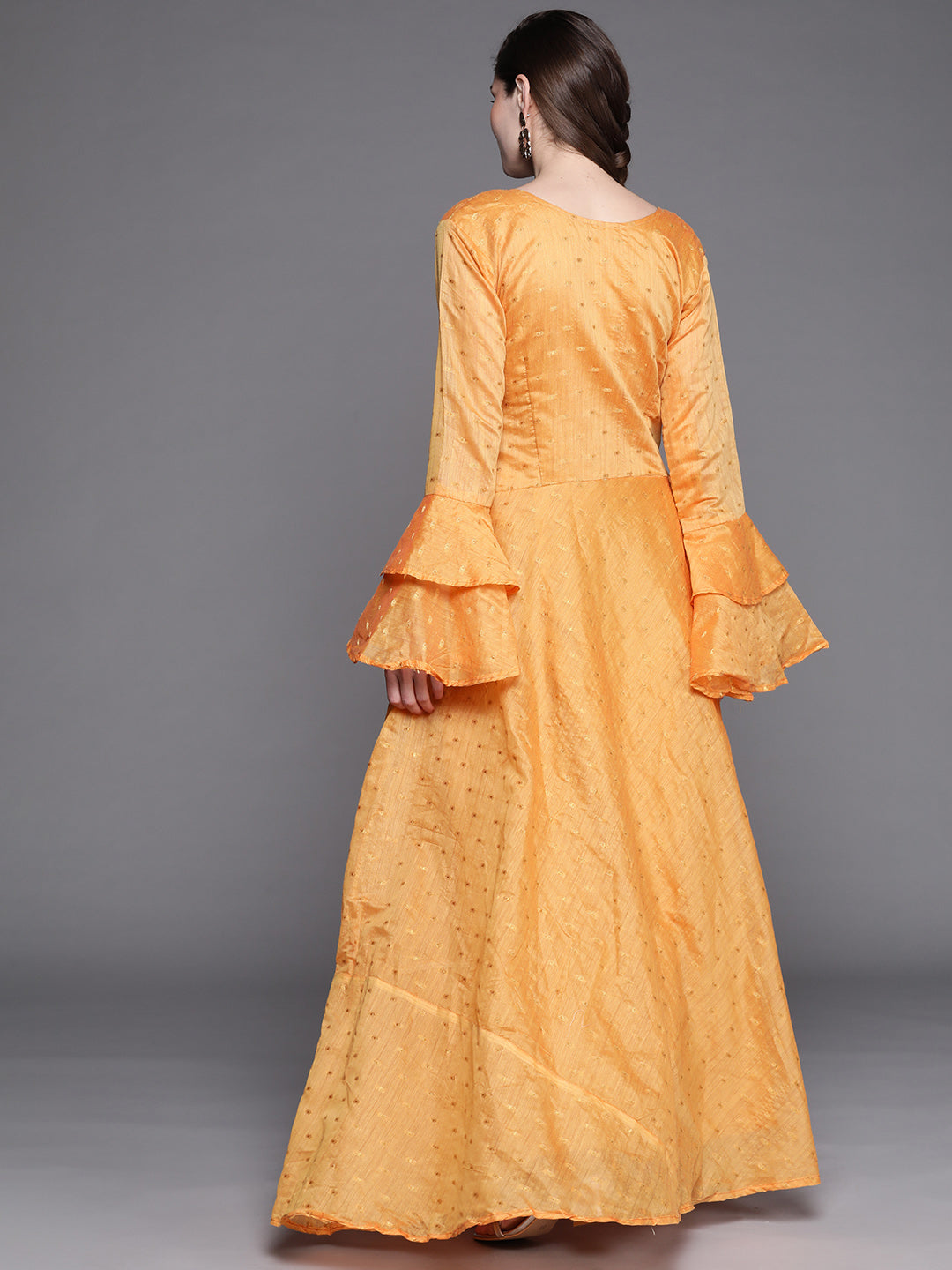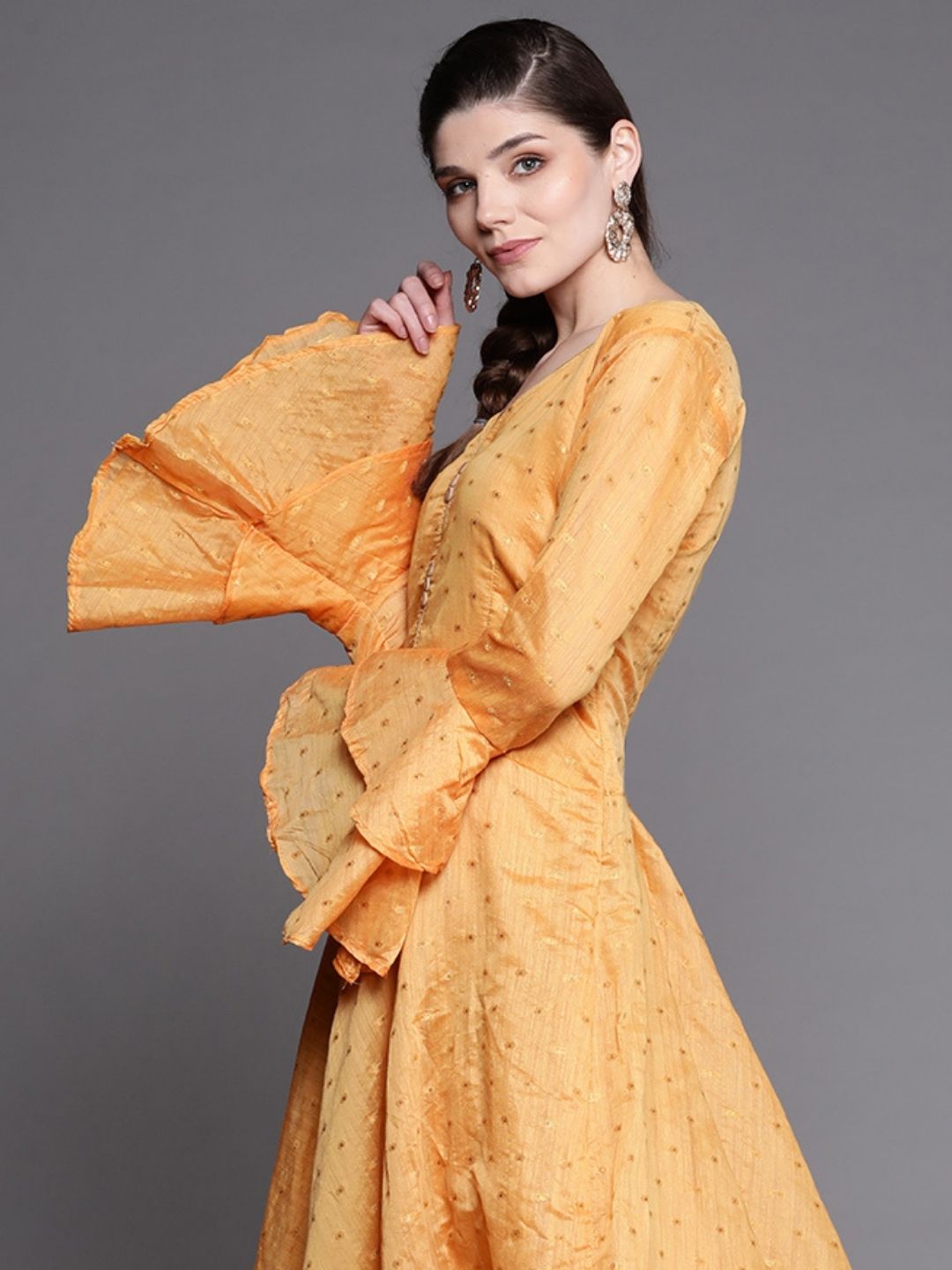 Made to Measure Mustard Chanderi Flared Dress with Zari weaving & Bell sleeves