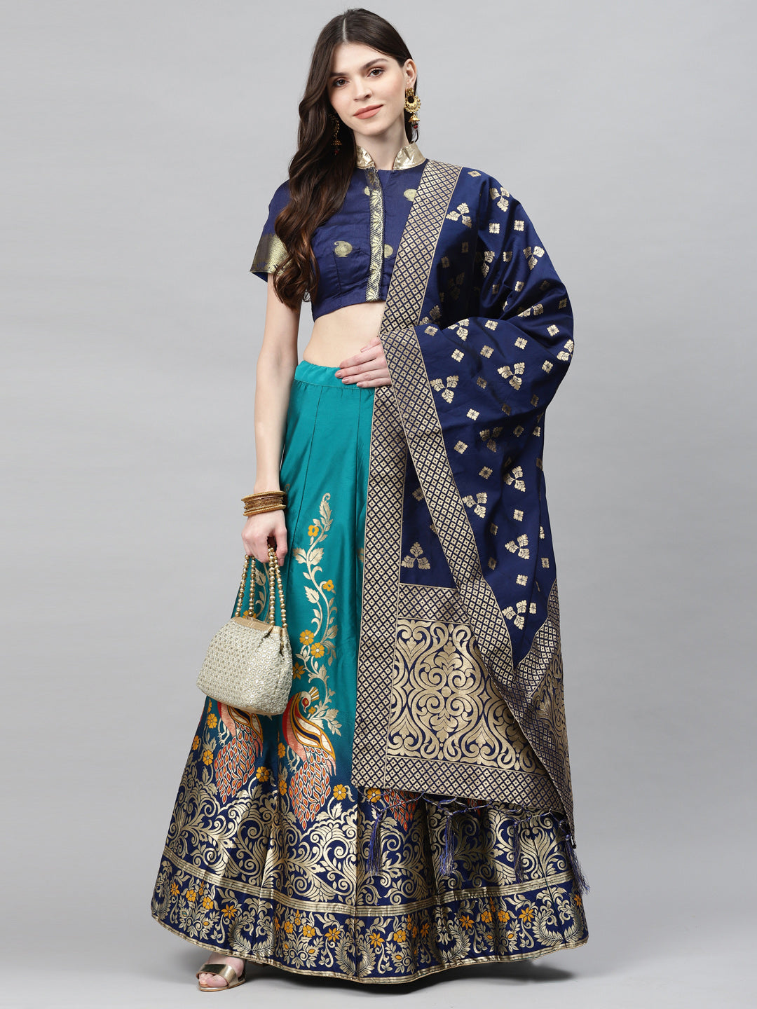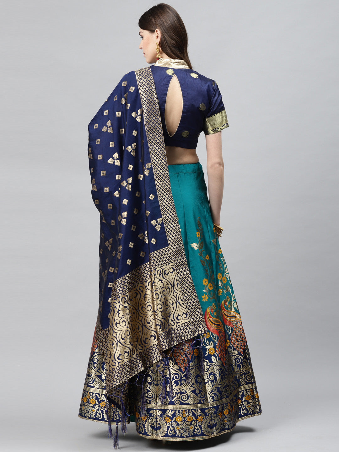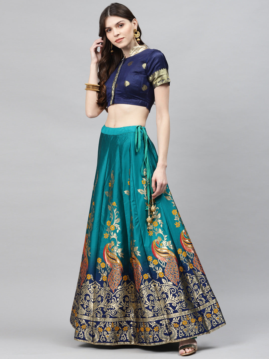 Ombre Semi Stitched Banarasi Lehenga Choli With Zari Weaving & Peacock Motifs