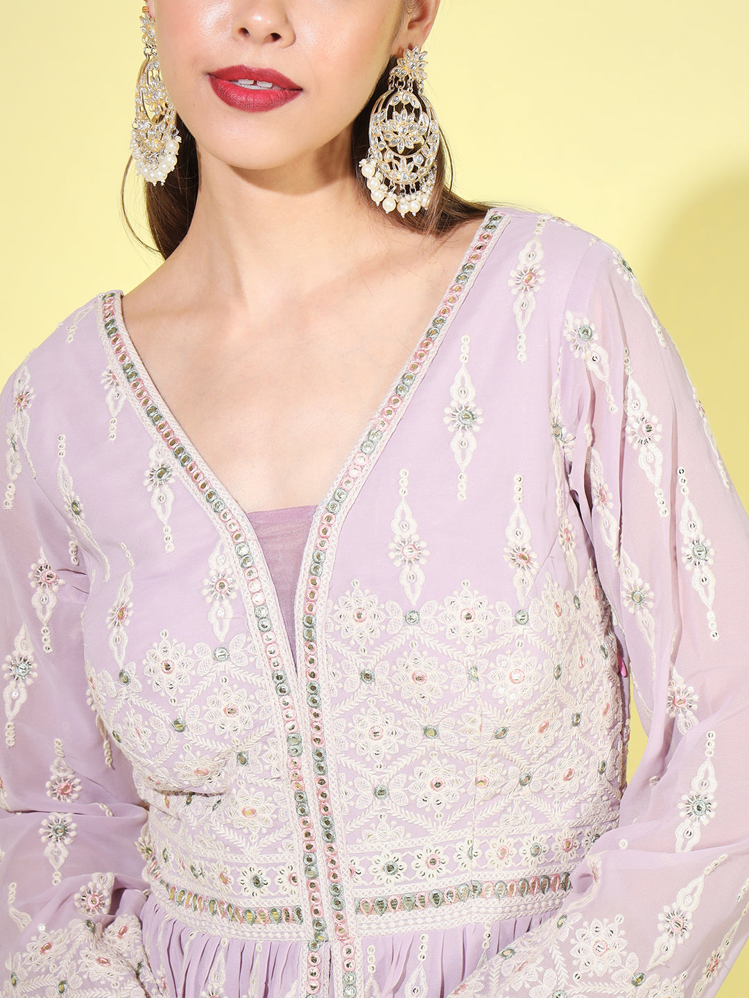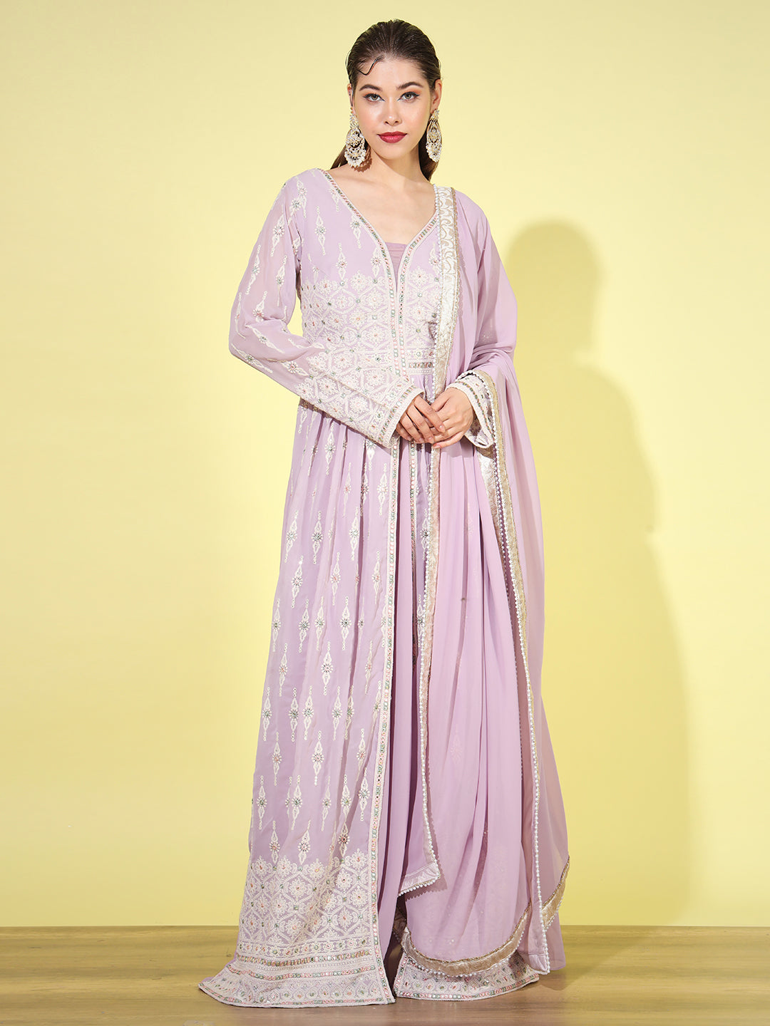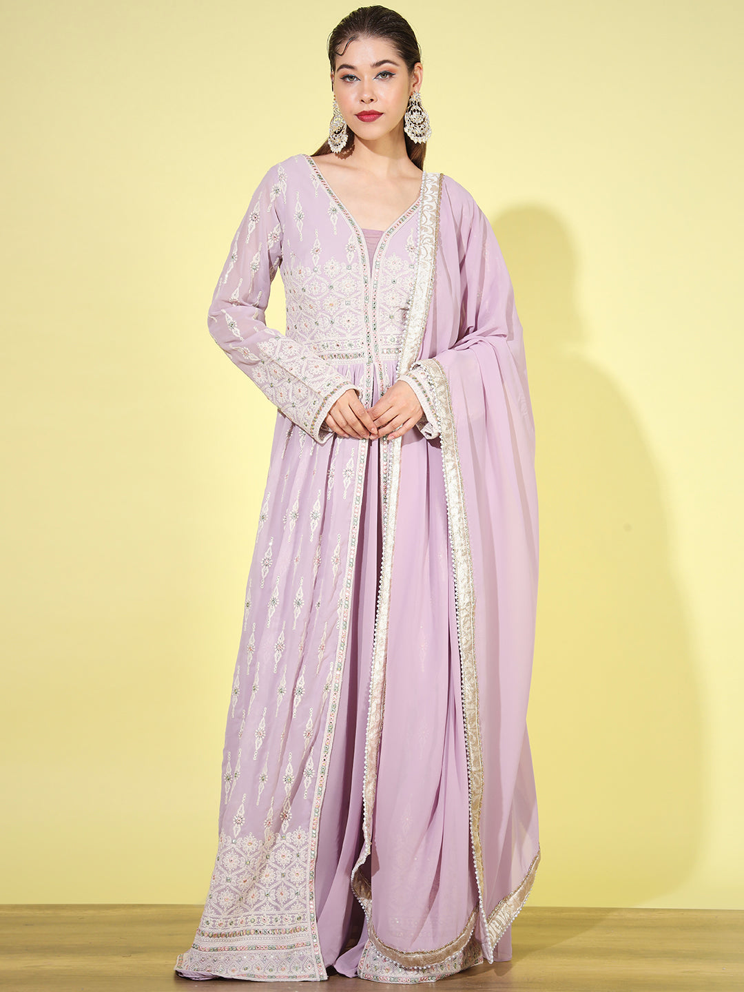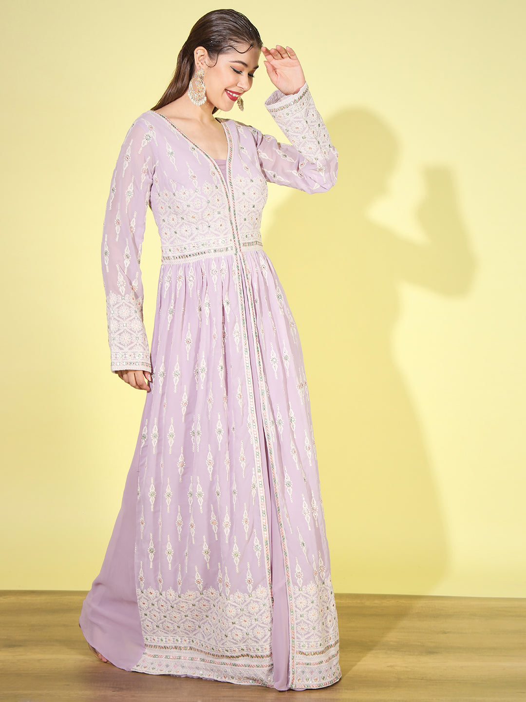Lavender Resham Chikankari Embroidered Front Slit Georgette Dress