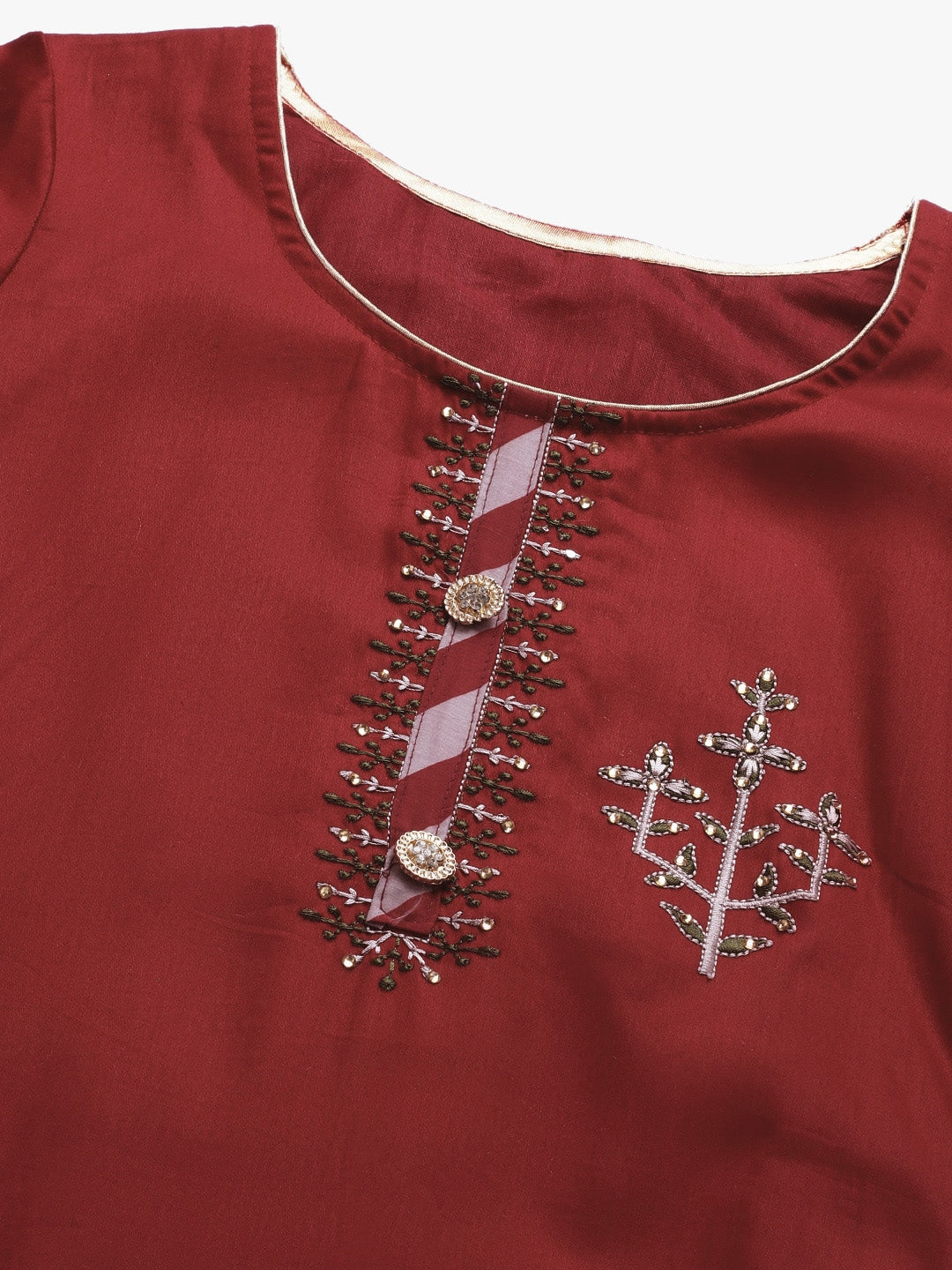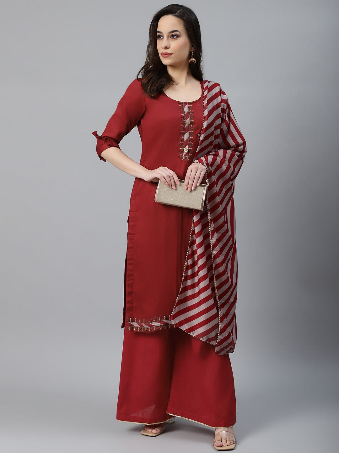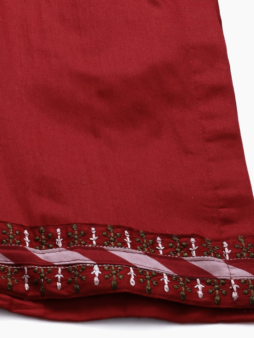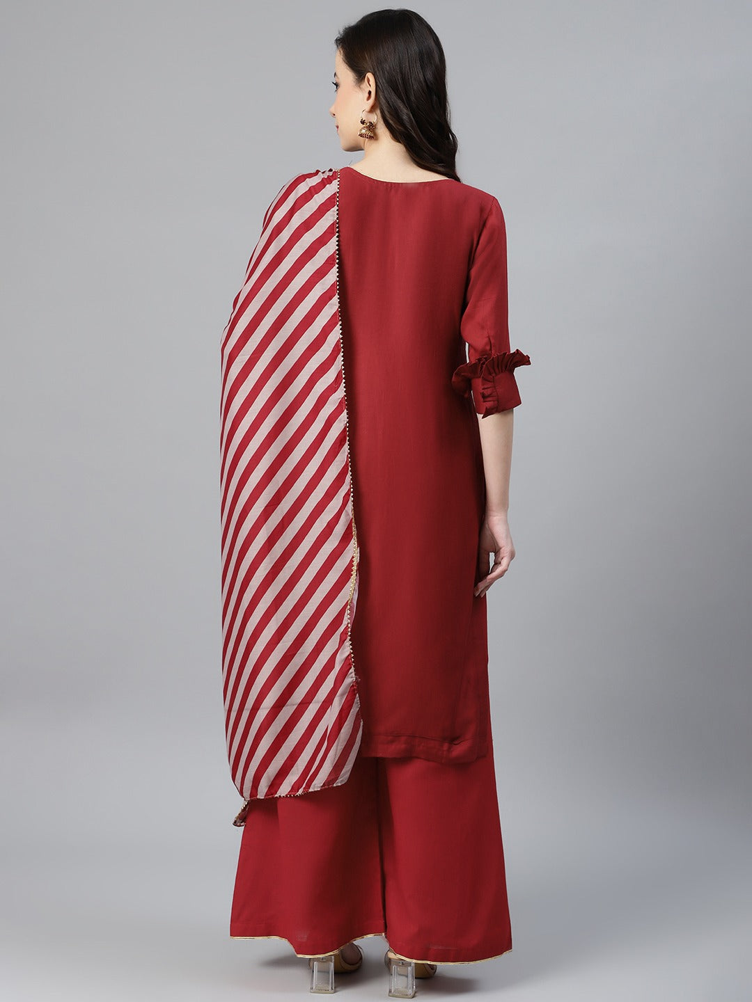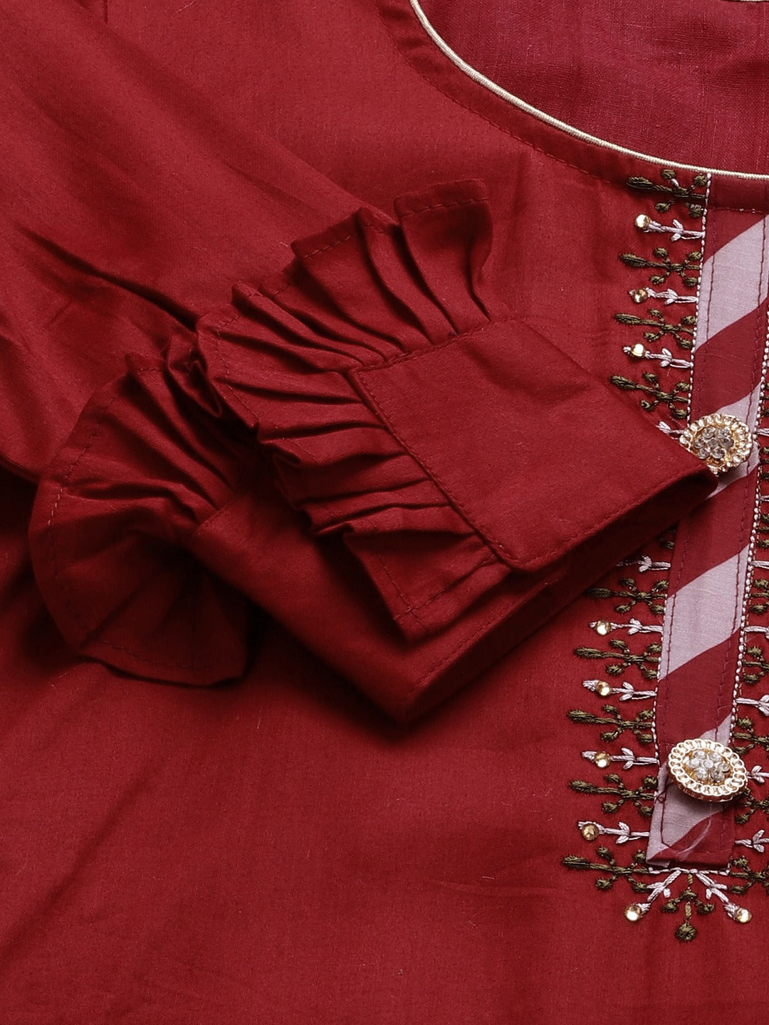 Maroon Colour Cotton Stitched Embellished Suit with Leheriya Printed Dupatta
