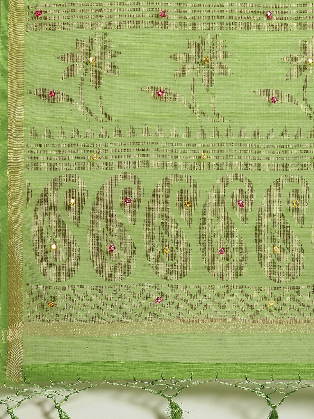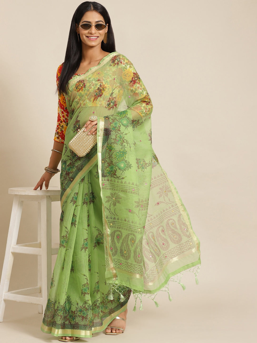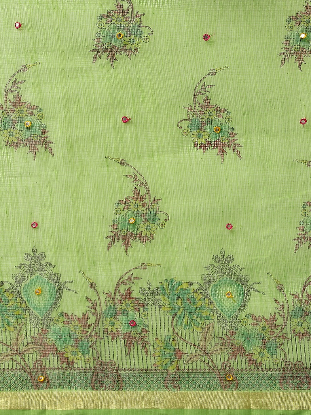 Pastel Green Floral Figital Printed Kota Mirror Work Chanderi Saree