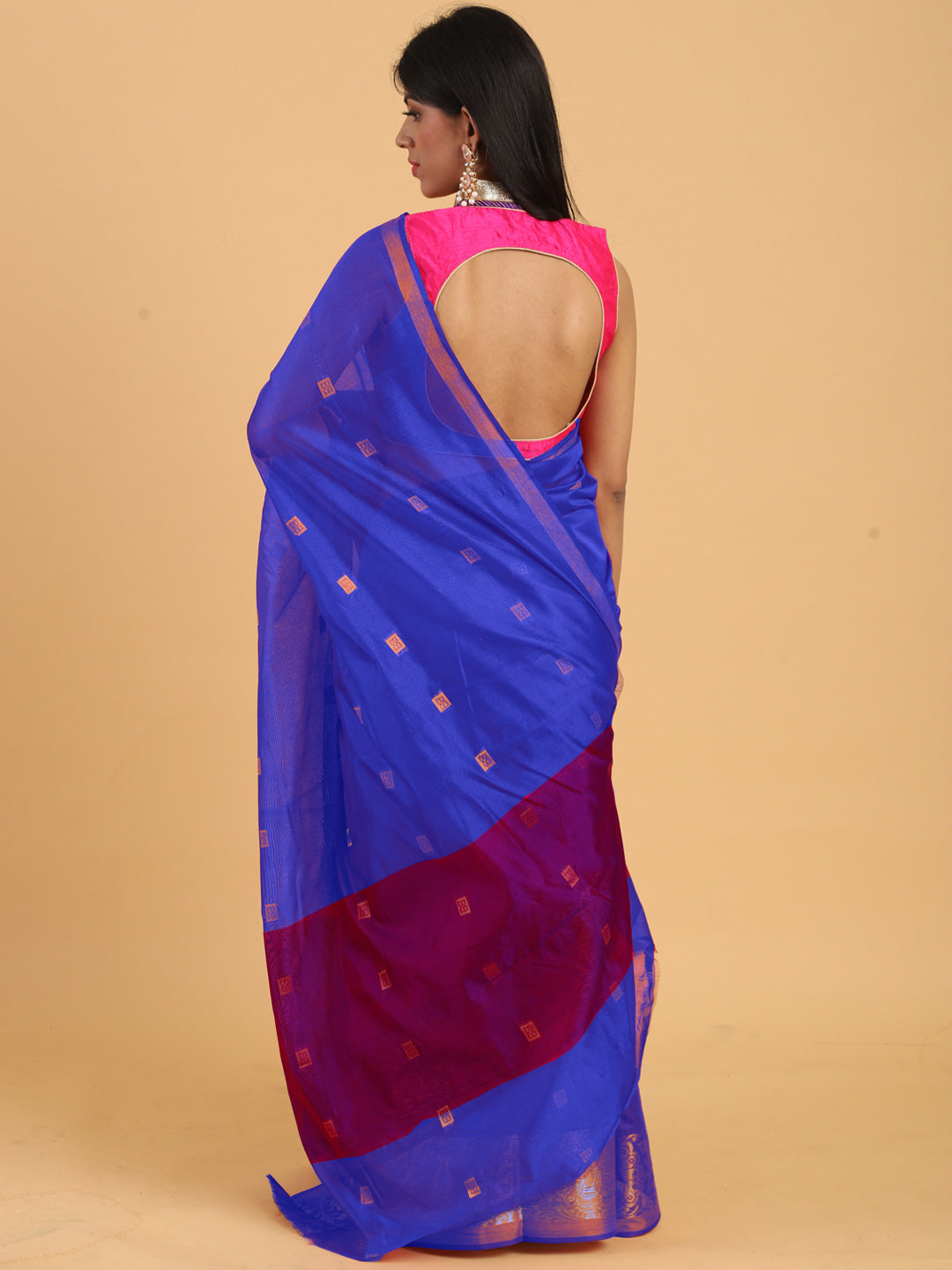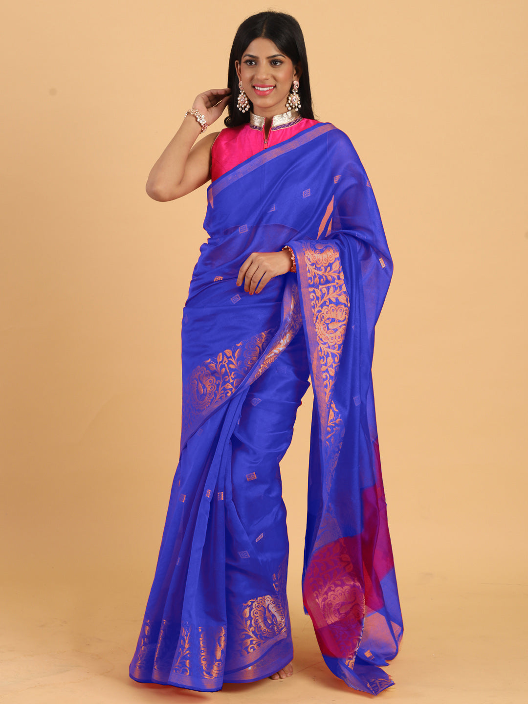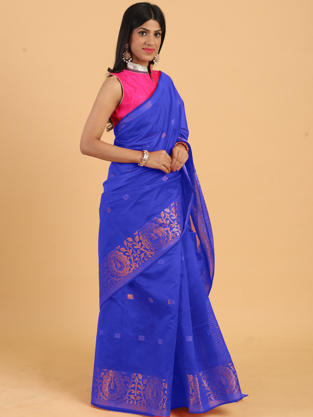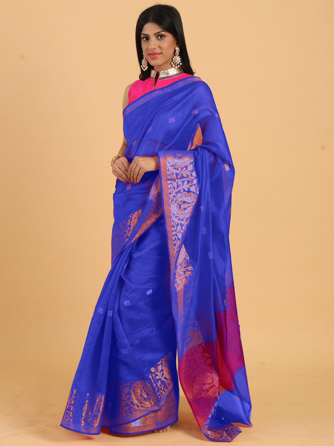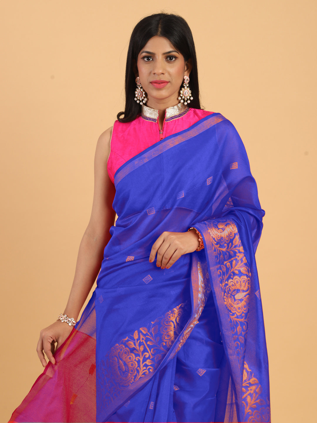 Blue Chanderi Silk Saree with Golden Zari Woven Motifs in Border