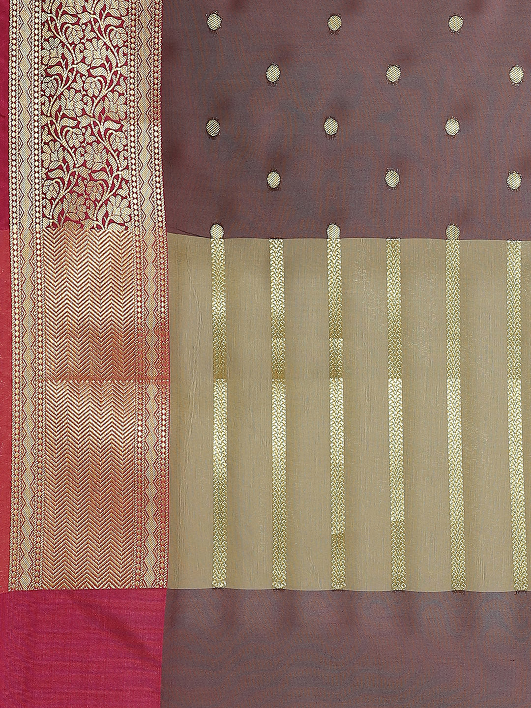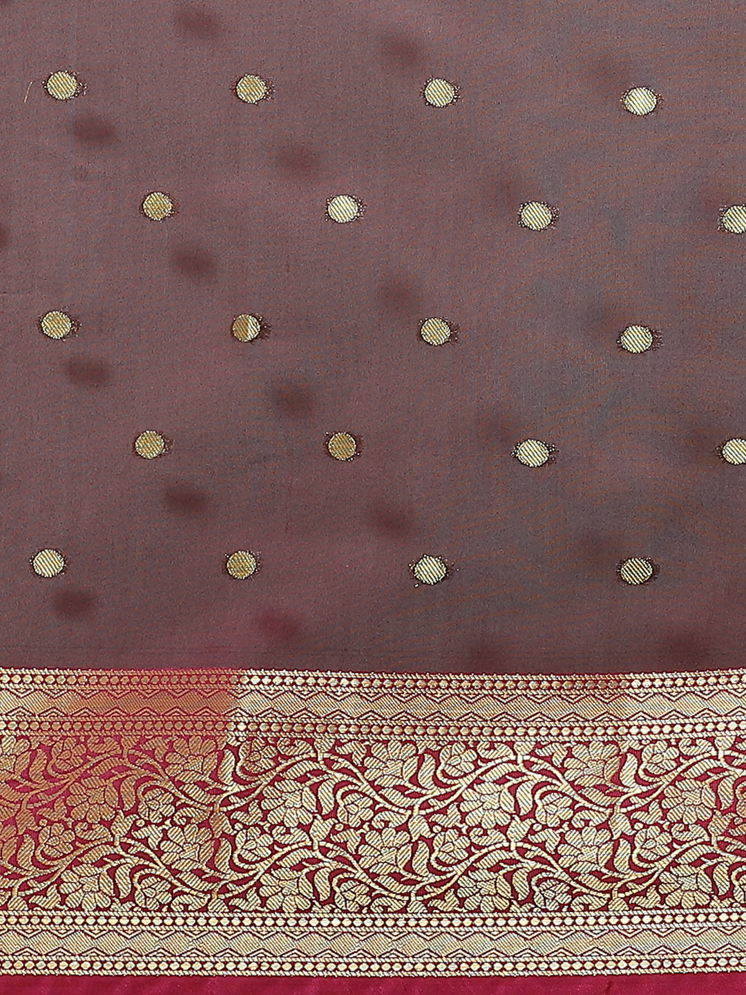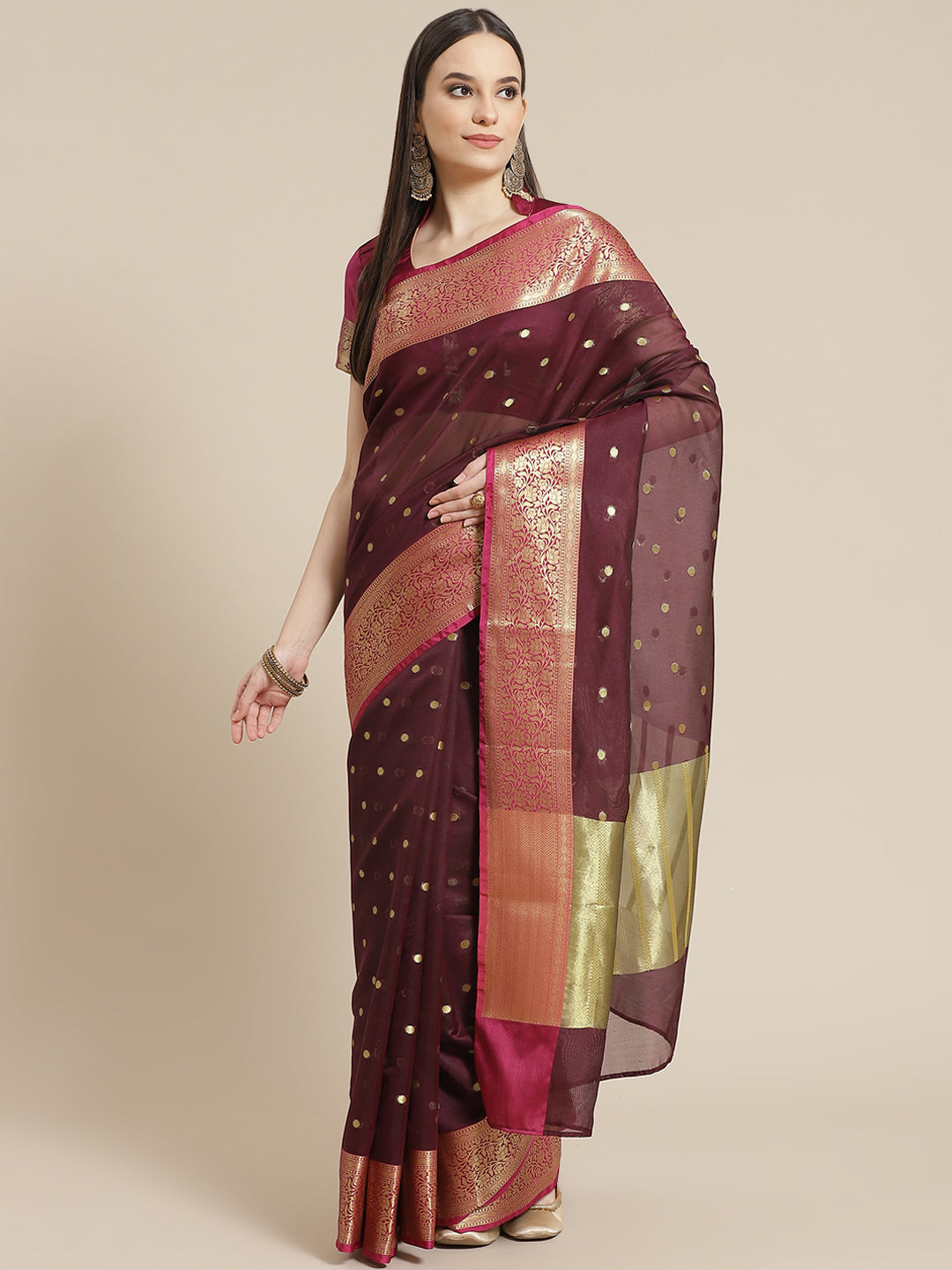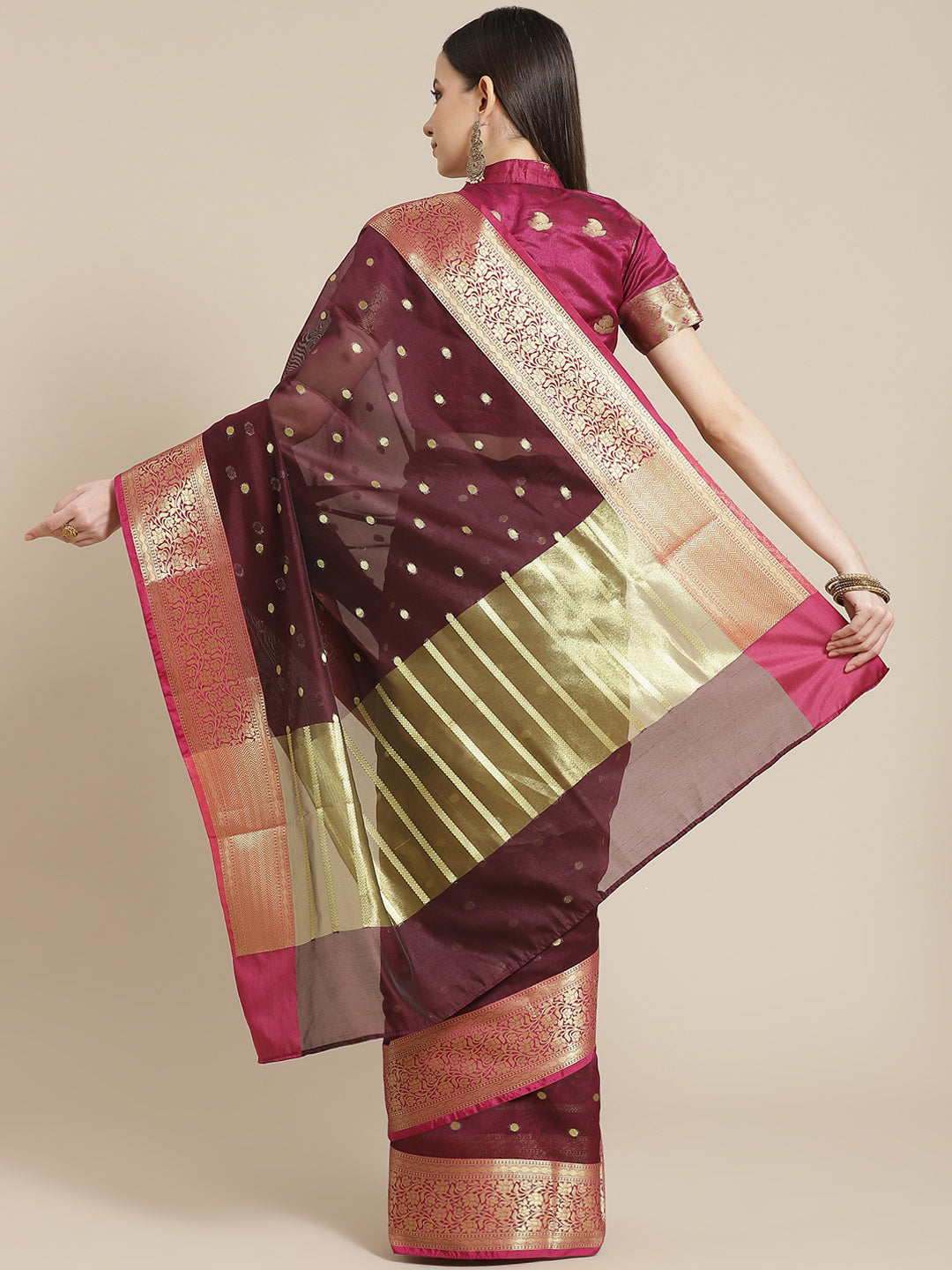 Burgundy Maheshwari Silk Banarasi Saree with Gold Zari woven Border