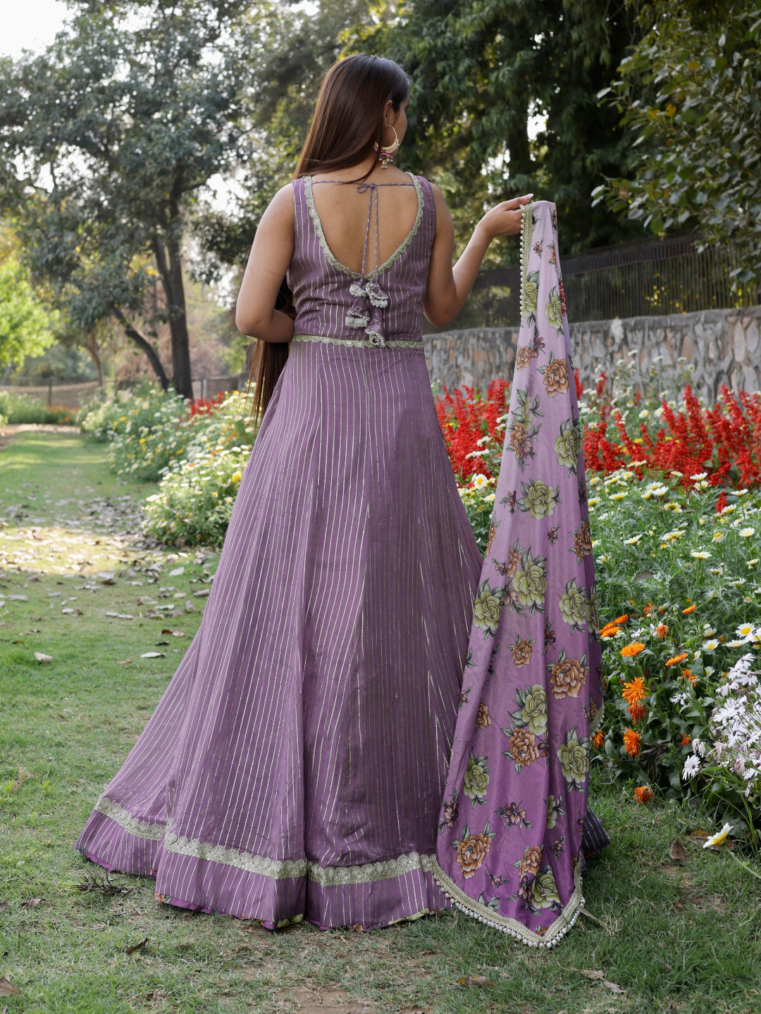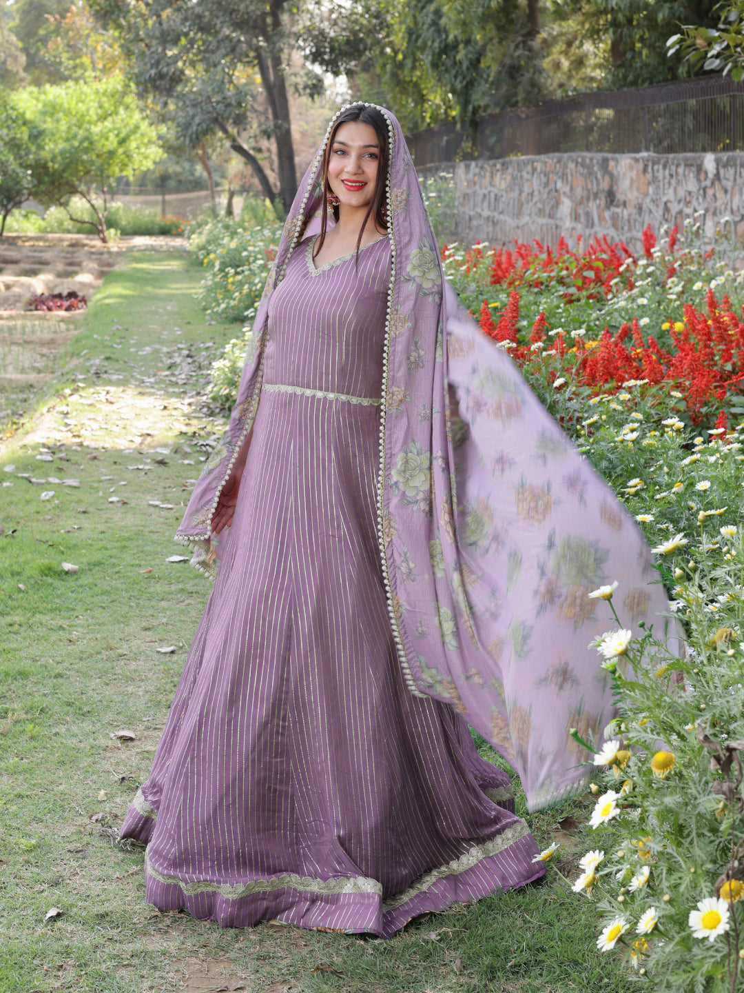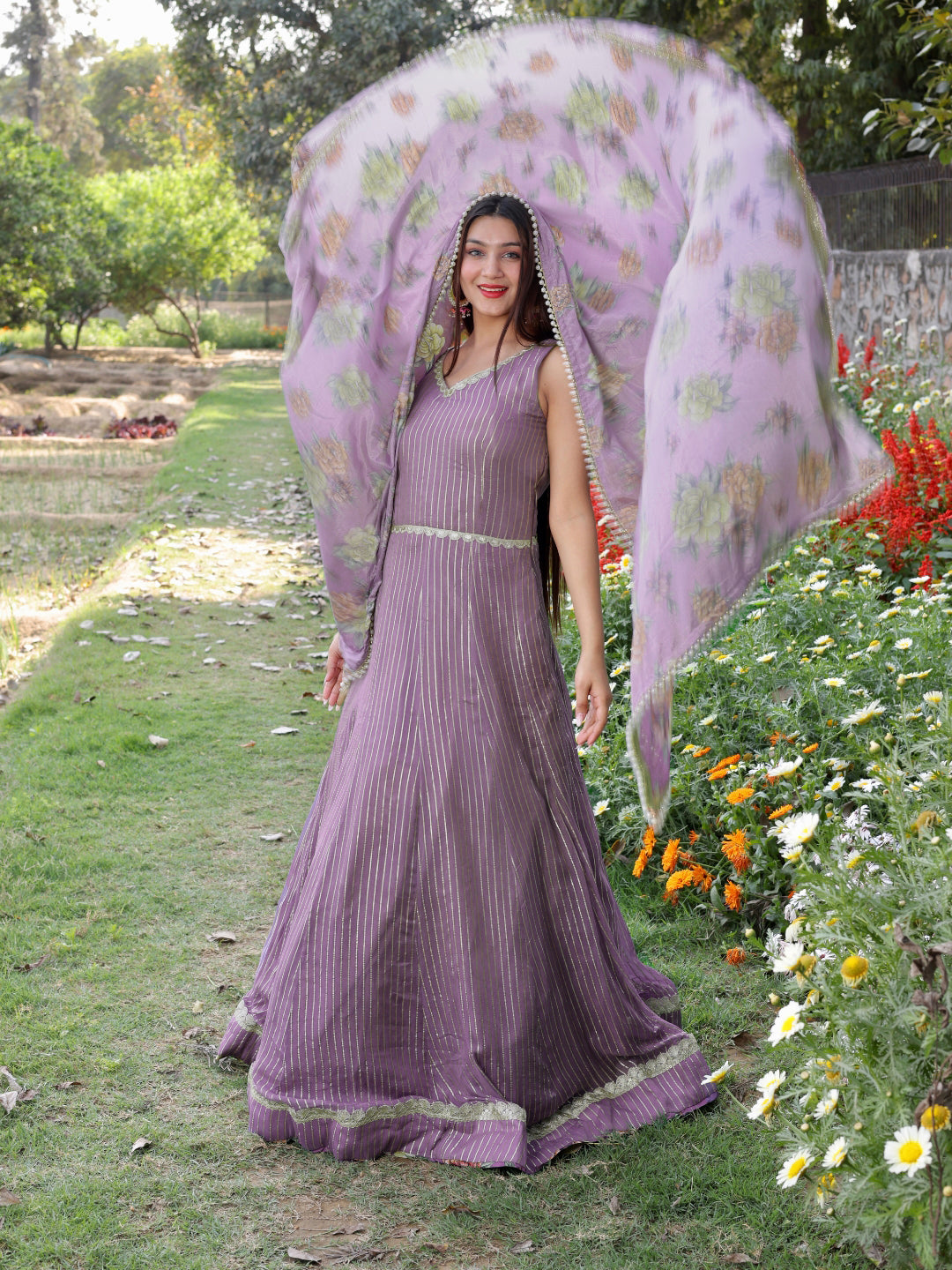 Mauve Stripes Gota Patti Embellish Flared Woven Gown & Dupatta