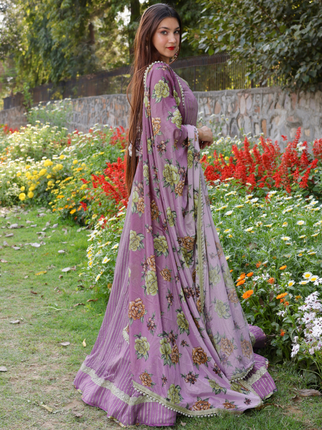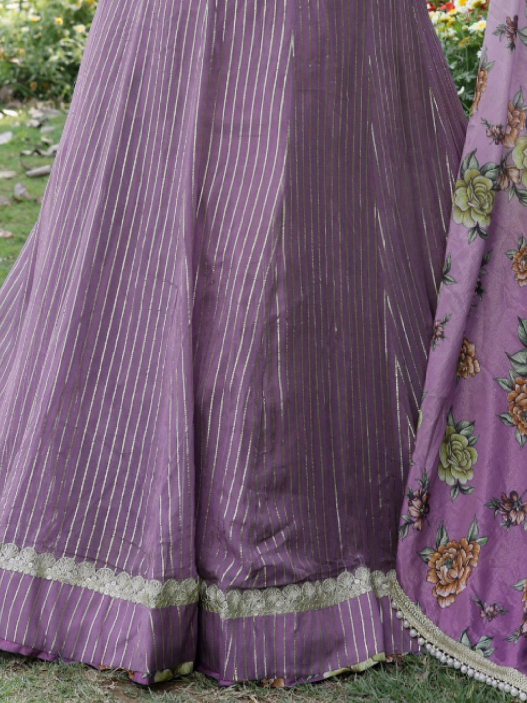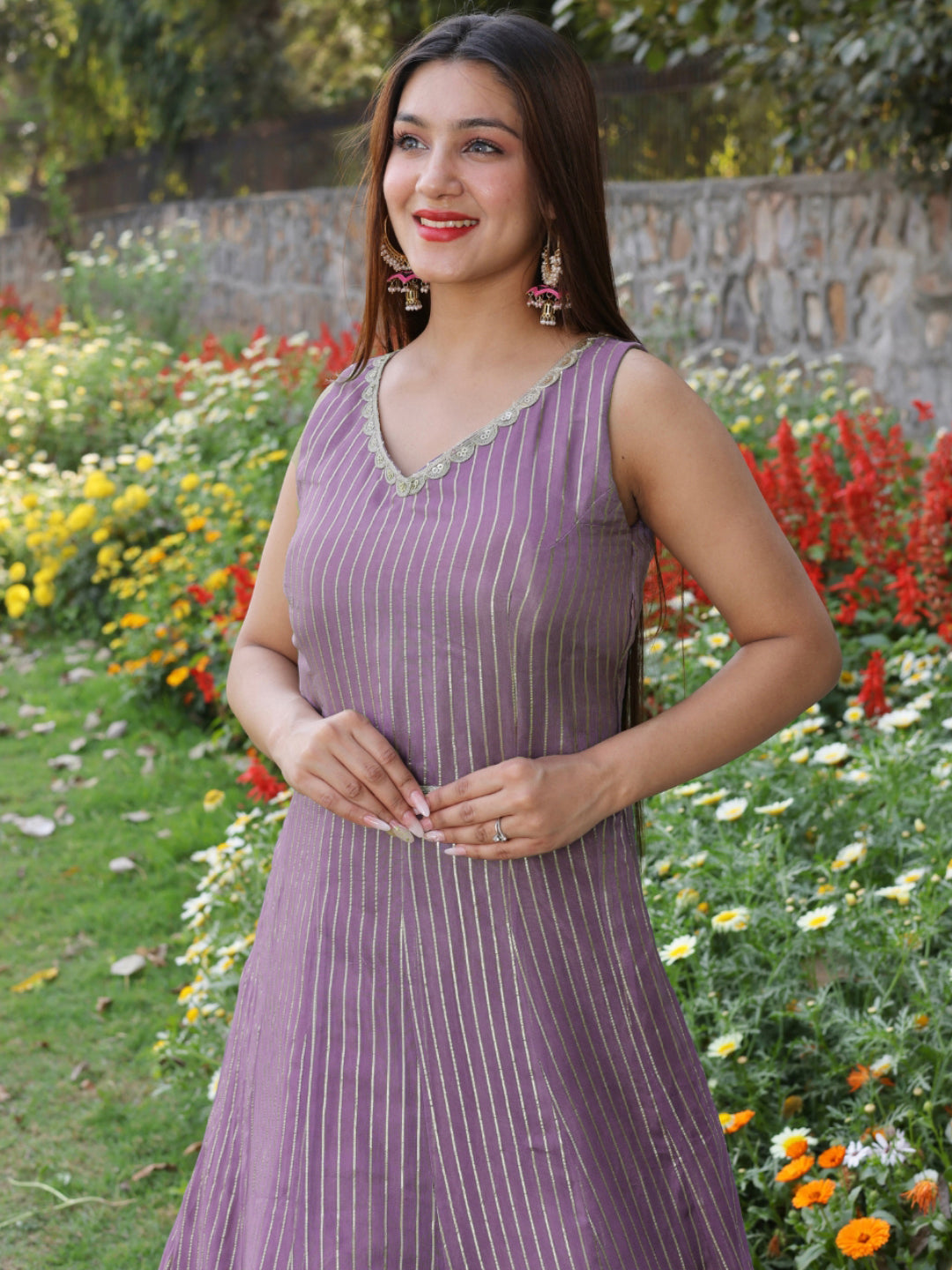 Mauve Stripes Gota Patti Embellish Flared Woven Gown & Dupatta