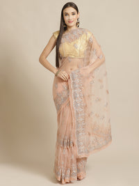 Peach Frills & Pleats Net Saree with Heavy Silver Zari & Resham Embroidery