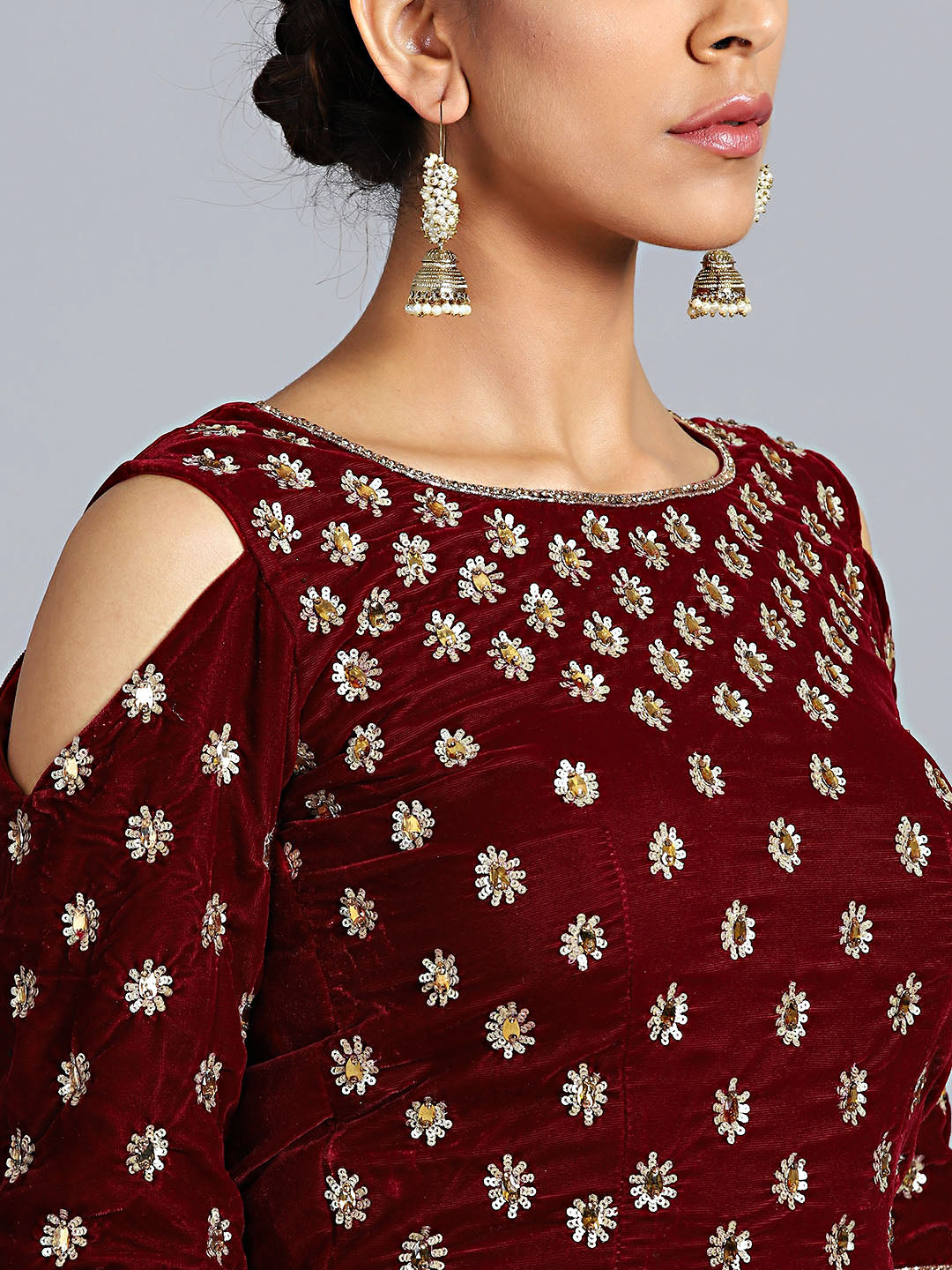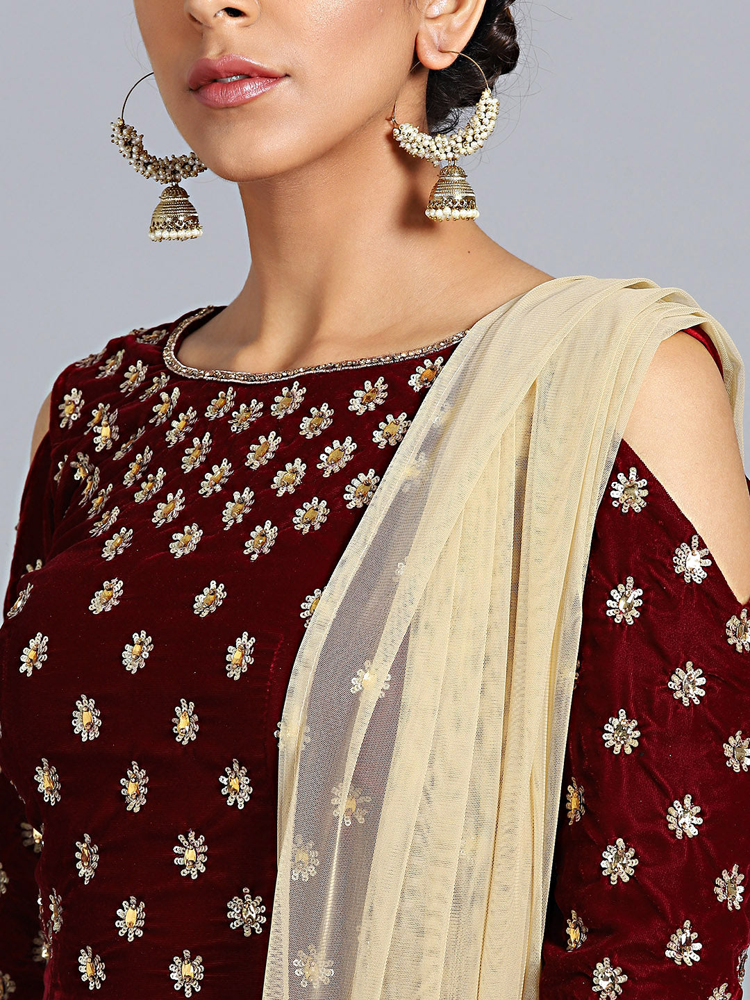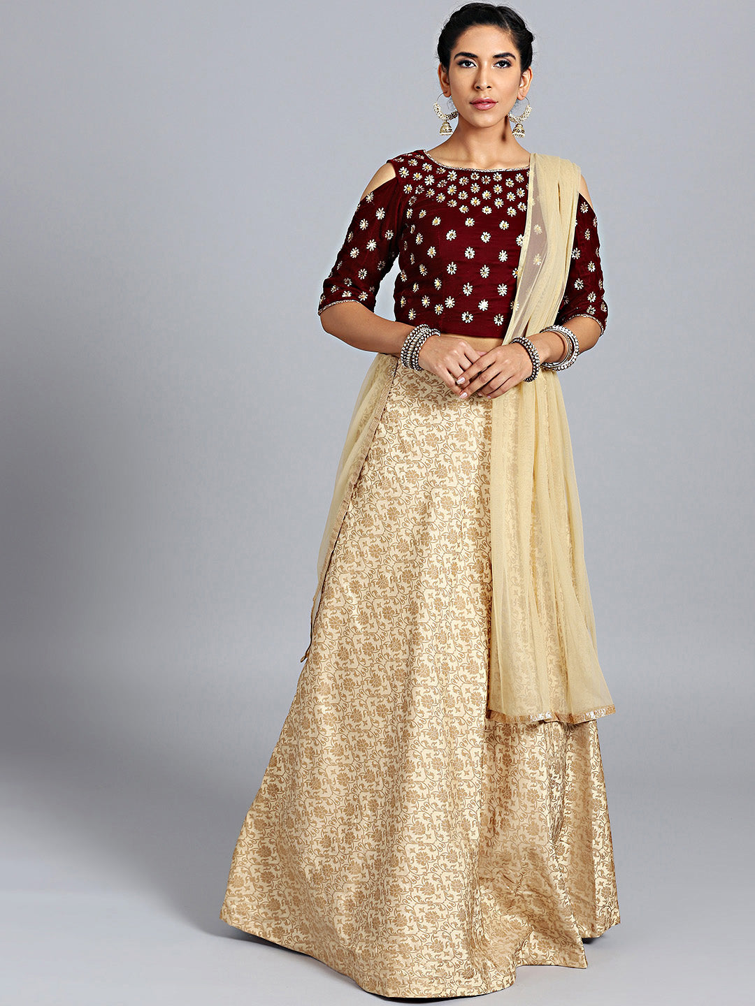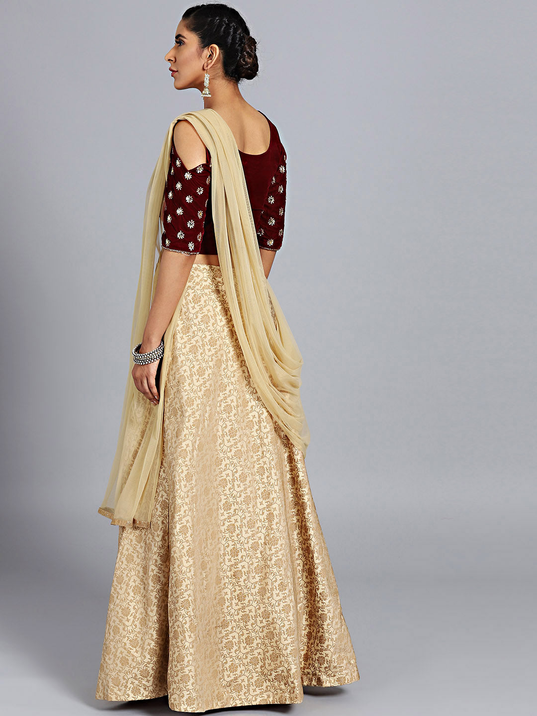 Jacquard Silk Lehenga with Hand Embroidered Cold Shoulder Choli