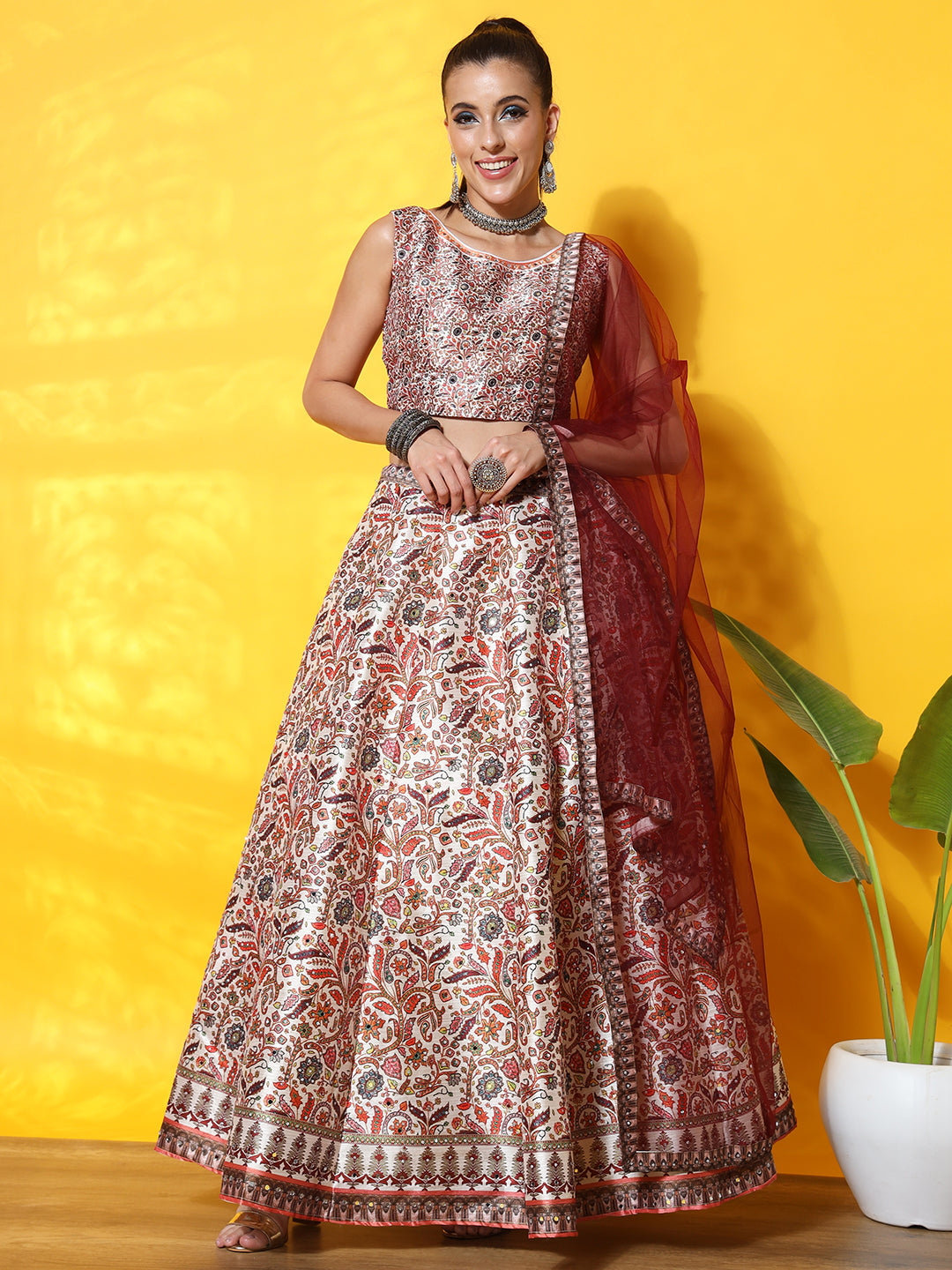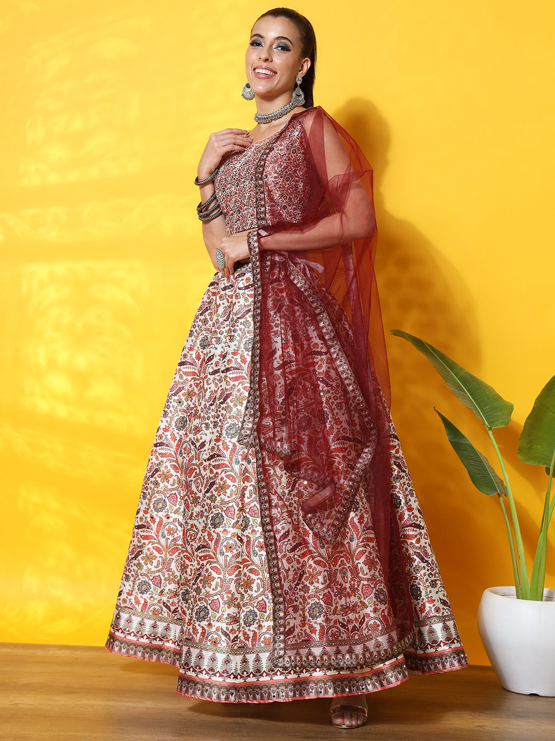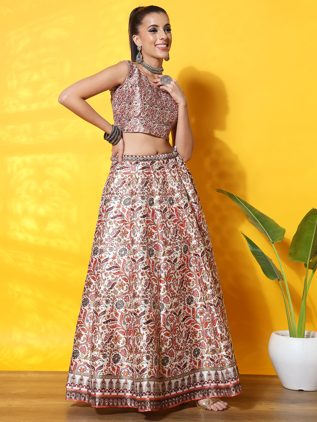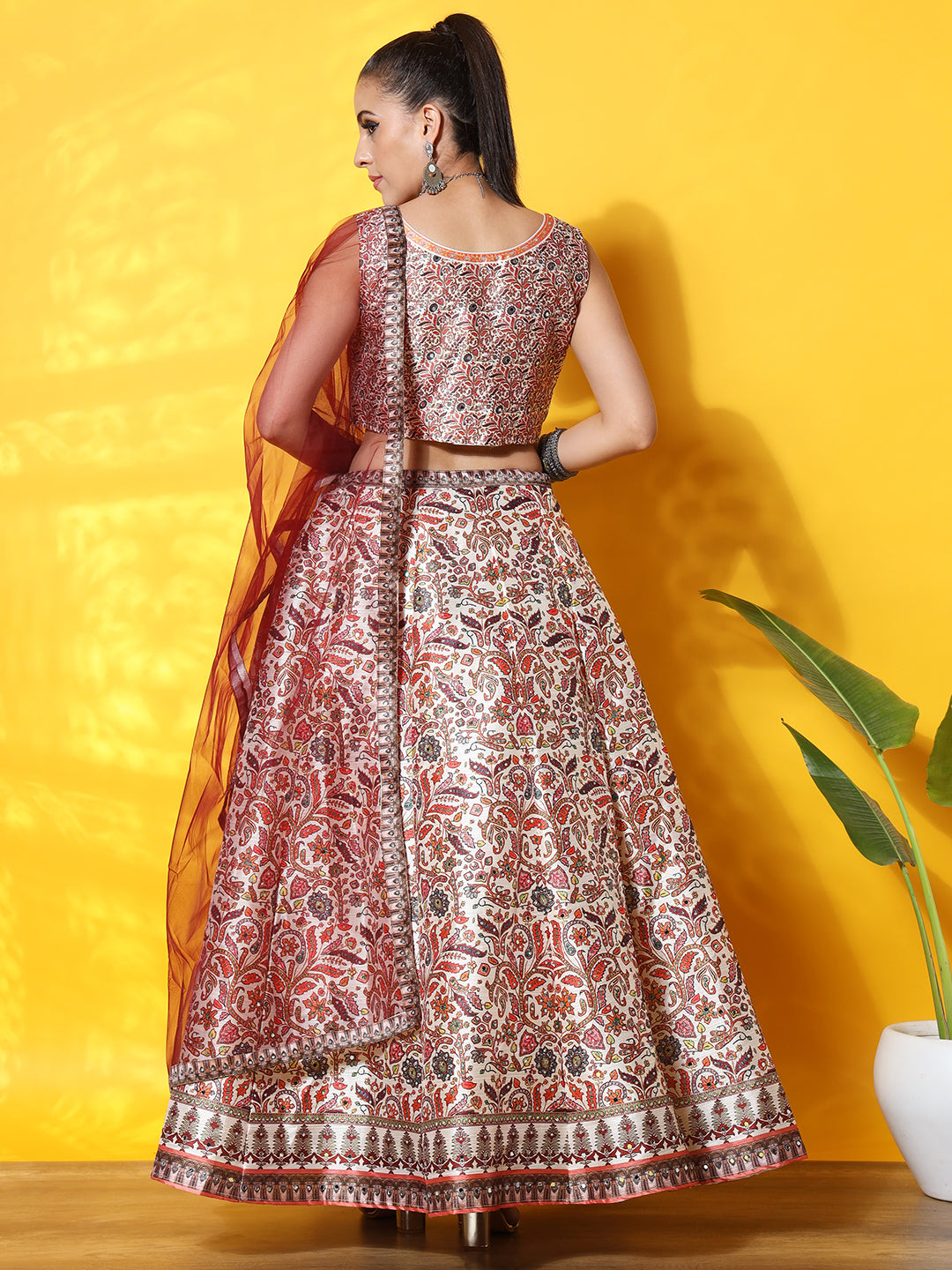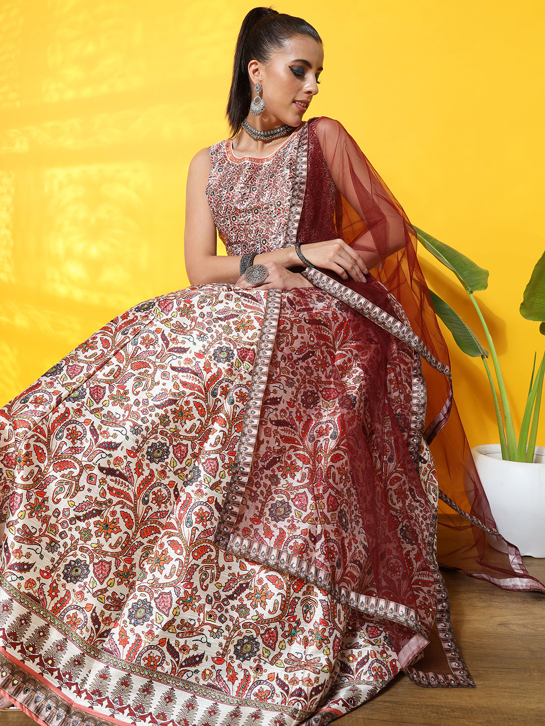 Kalamkari Inspired Cream Digital Print Silk Lehenga Set