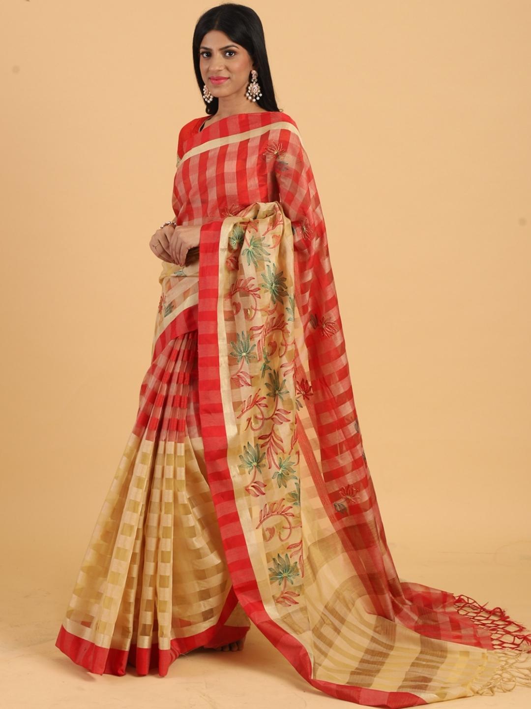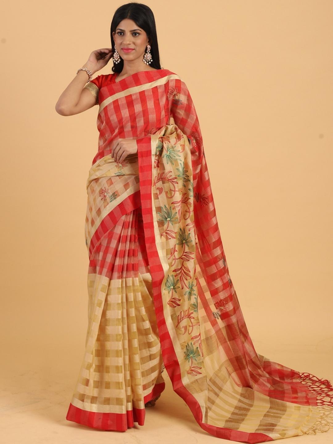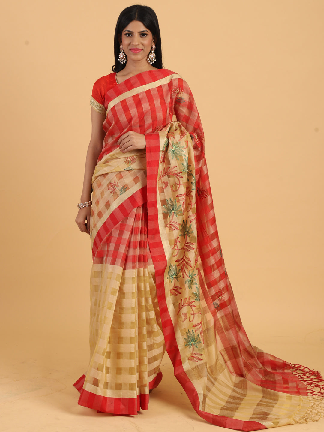 Zari woven Checked Half & Half Chanderi Saree with Floral Embroidery
