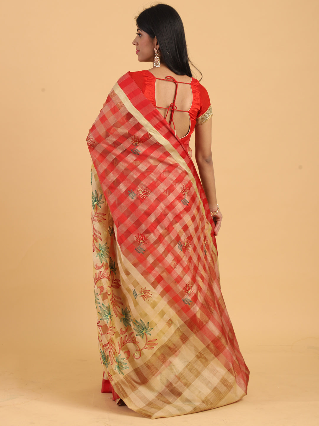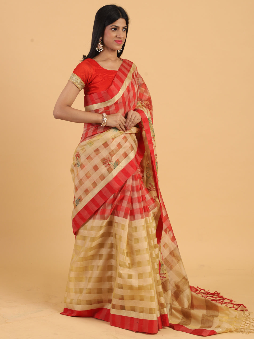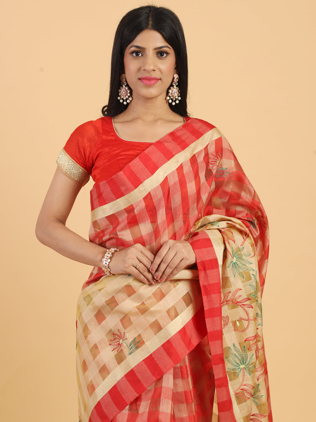 Zari woven Checked Half & Half Chanderi Saree with Floral Embroidery