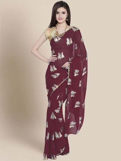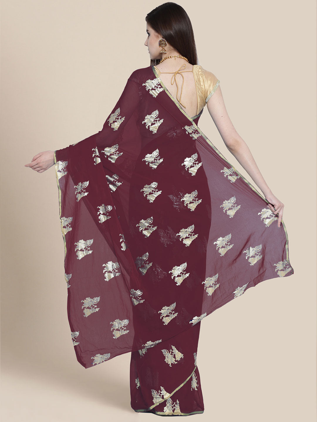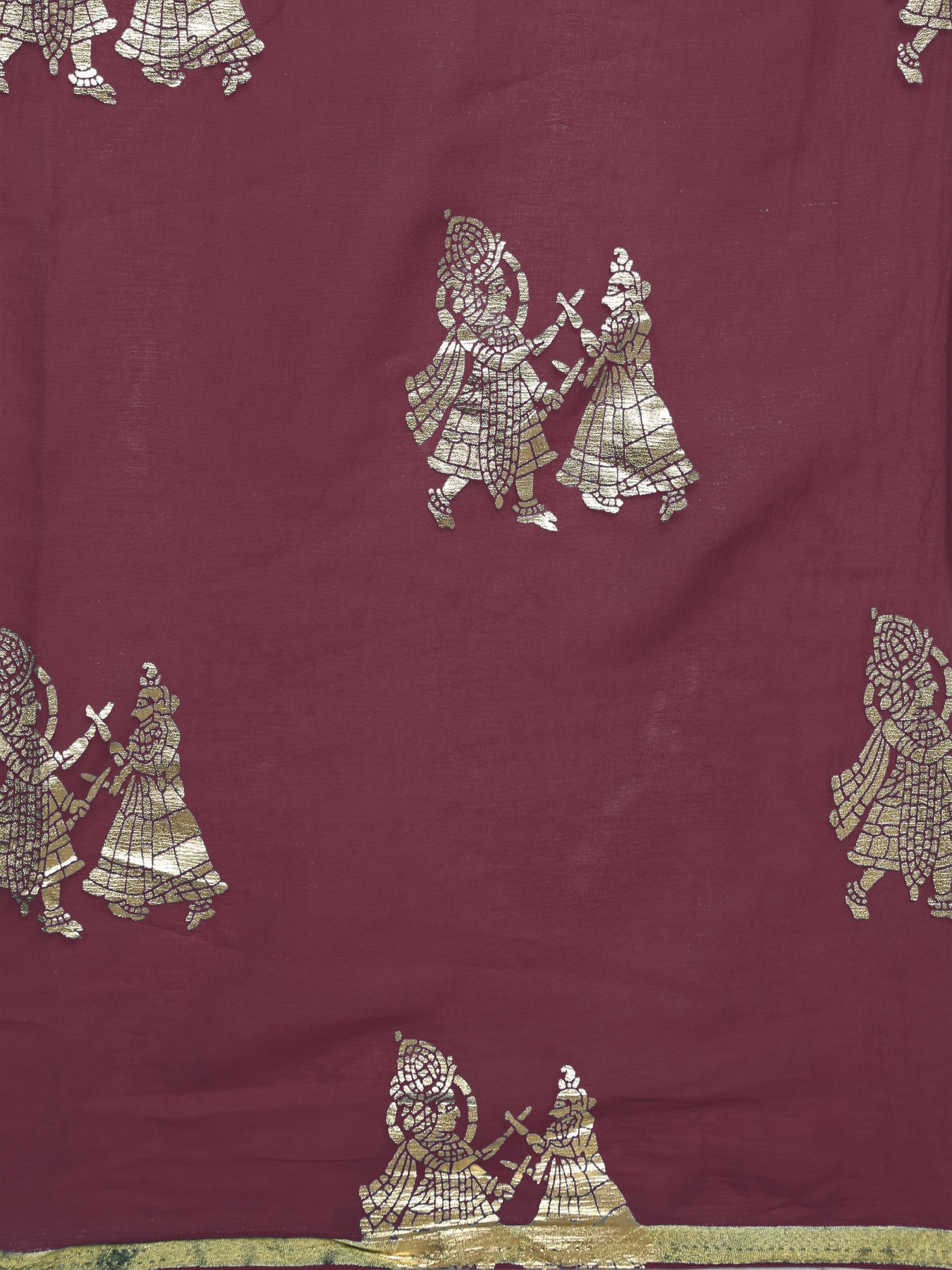 Burgundy Chiffon Foil Print Party Wear Saree with Ethnic Radha Kishan Motifs