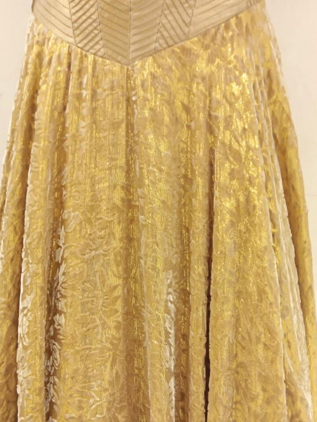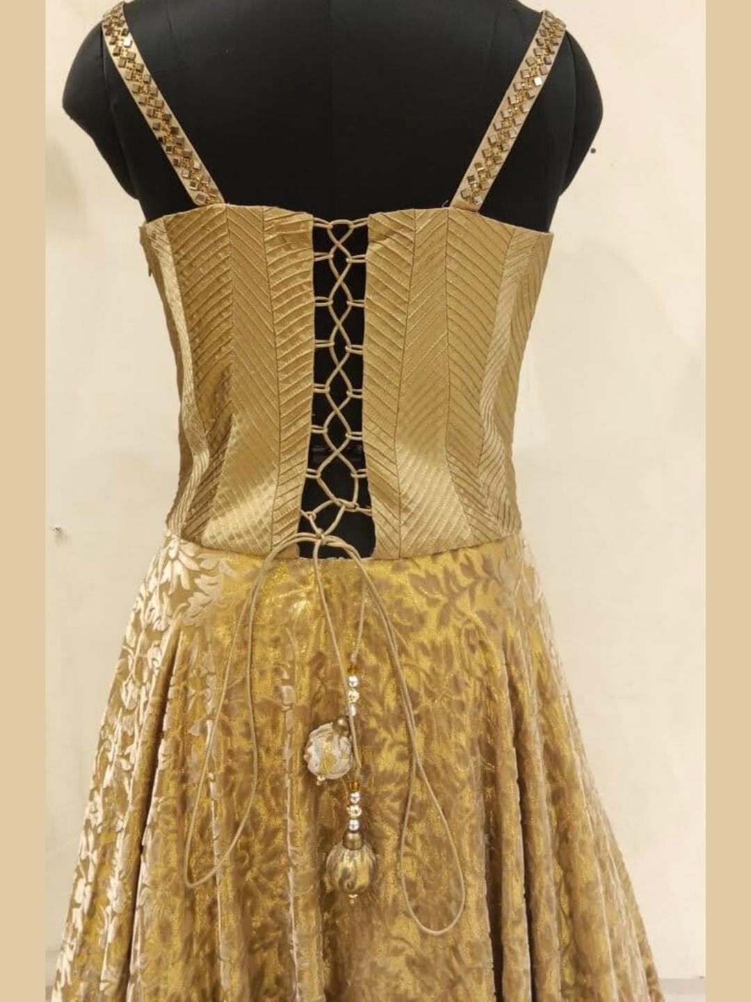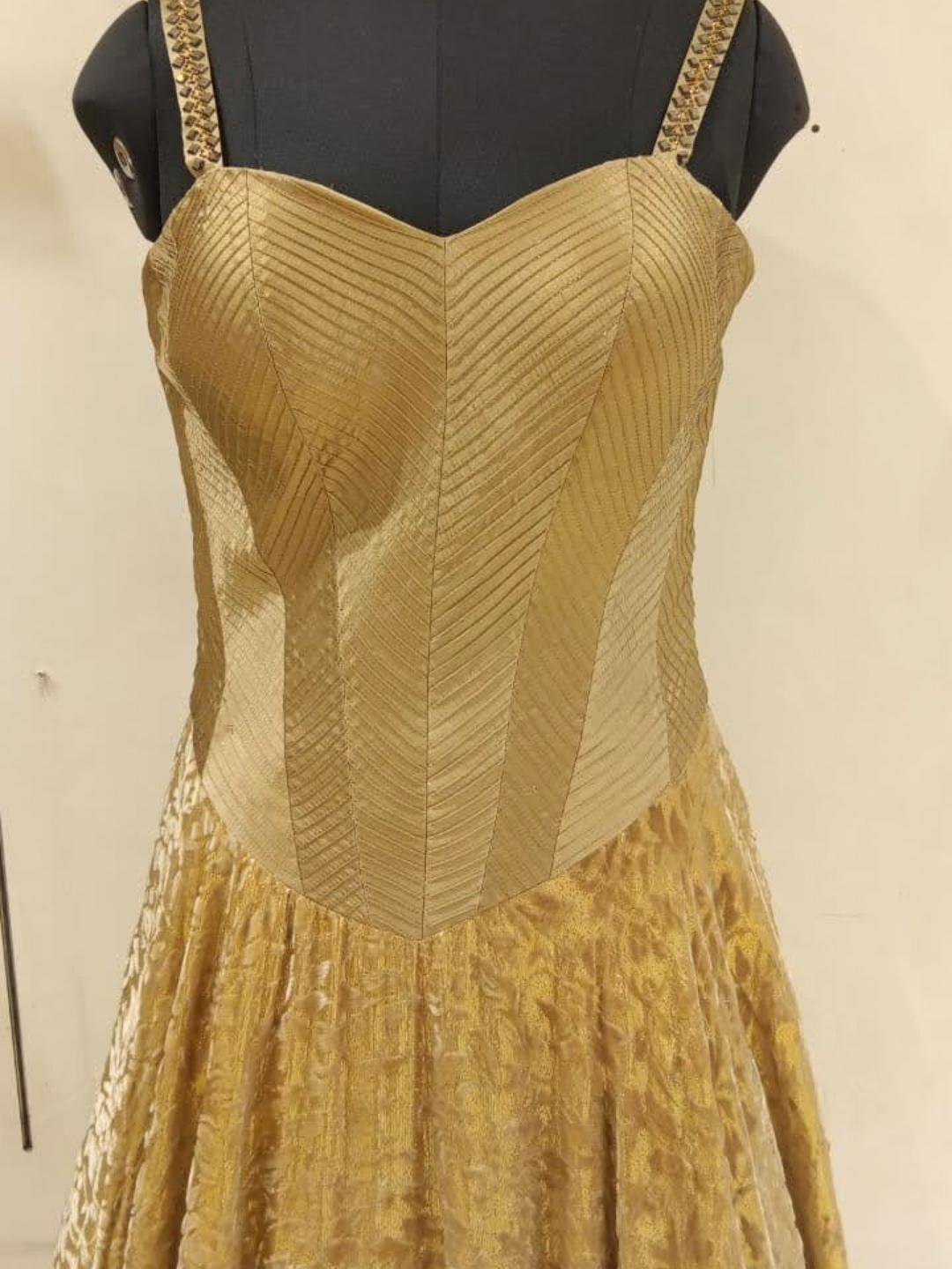 Golden Woven Rich Look Embellished Stylized Long Flared Gown Dress