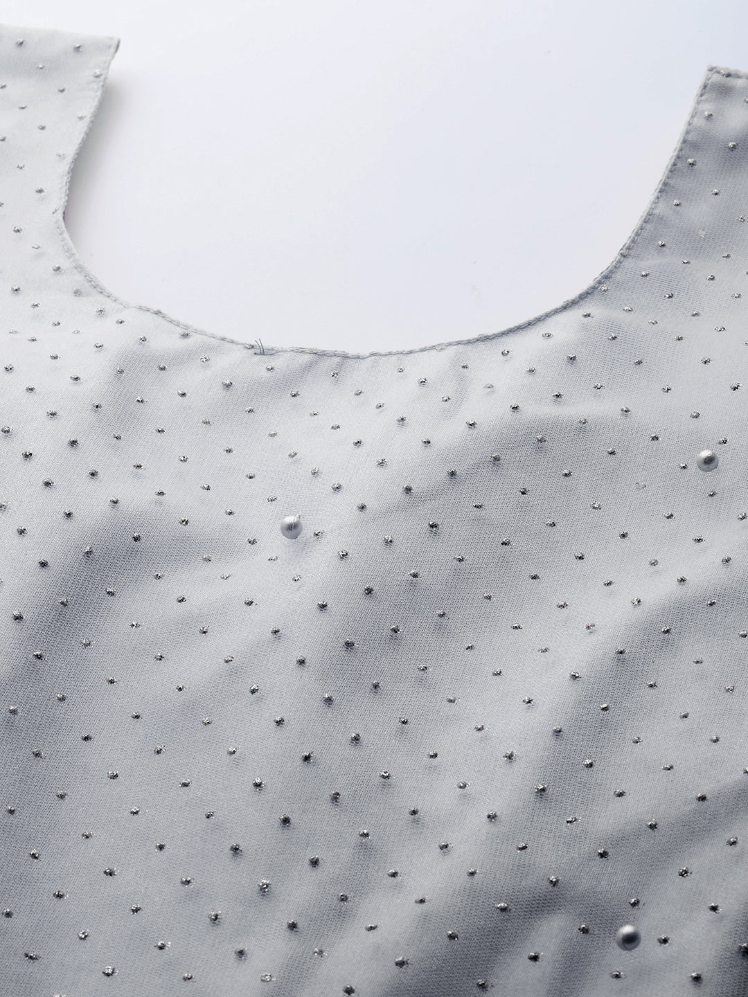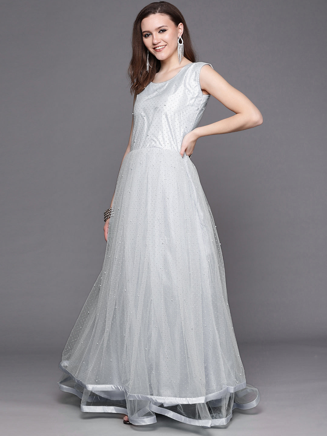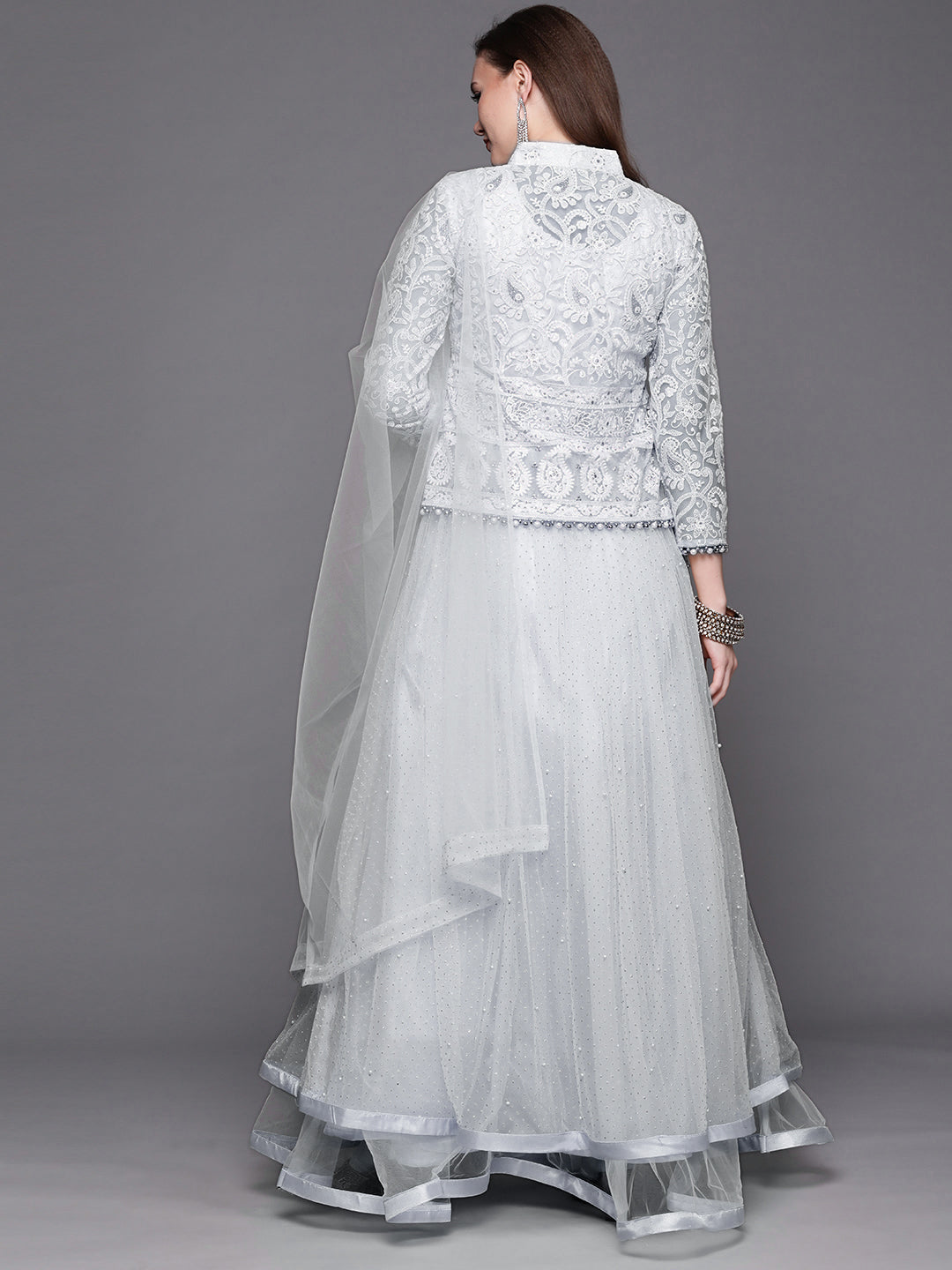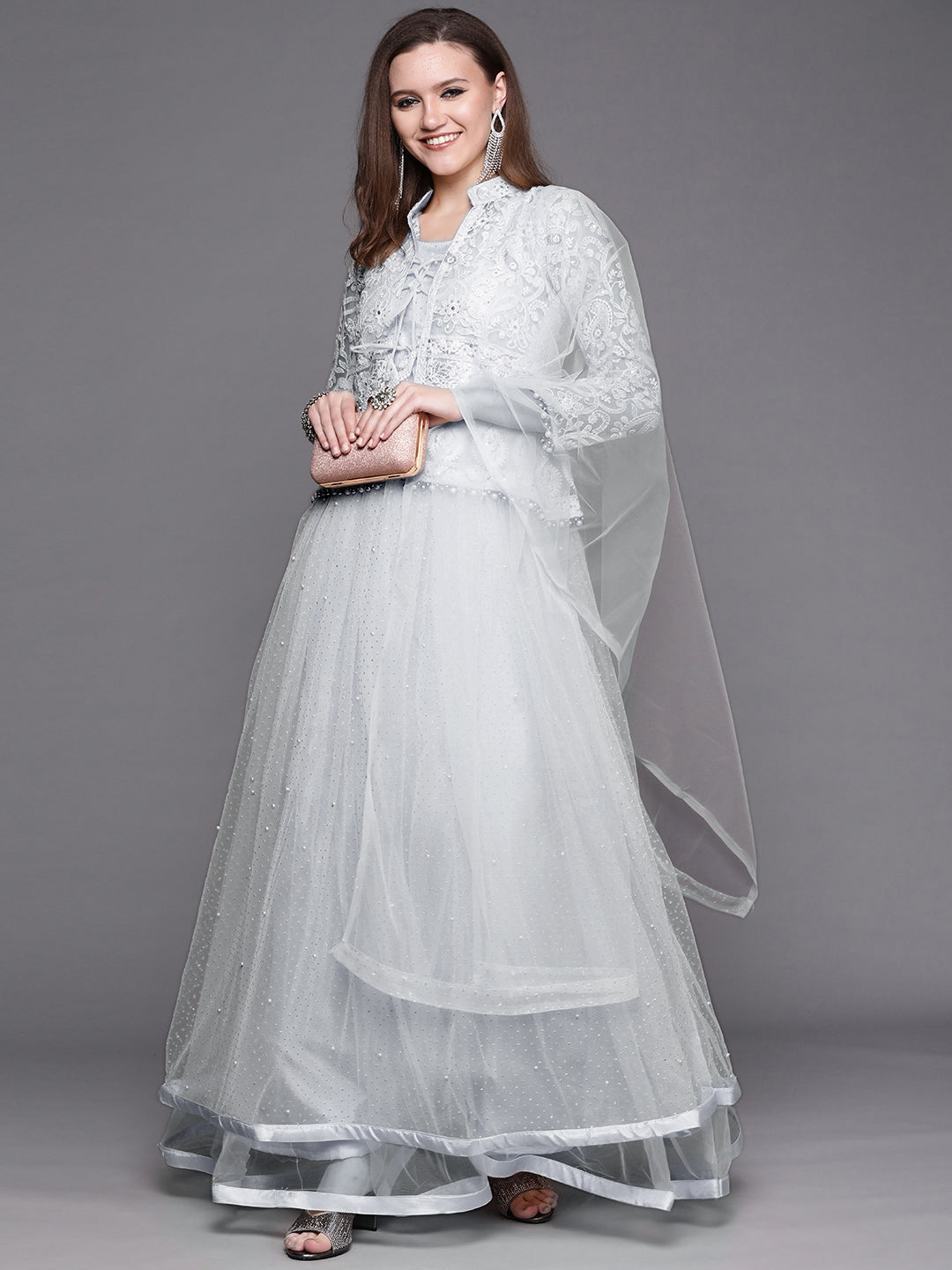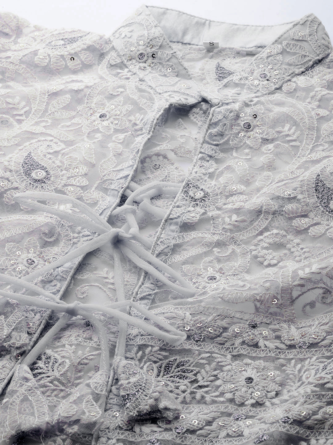 Grey Glitter Embellished Chikankari Jacket Flared Gown