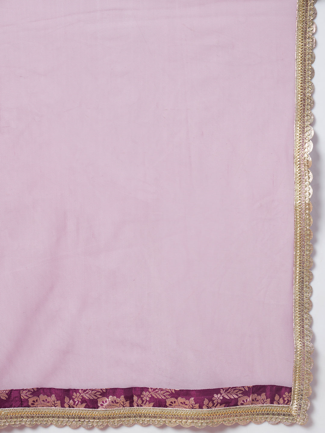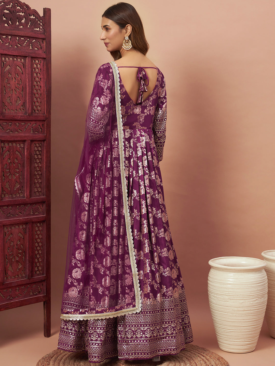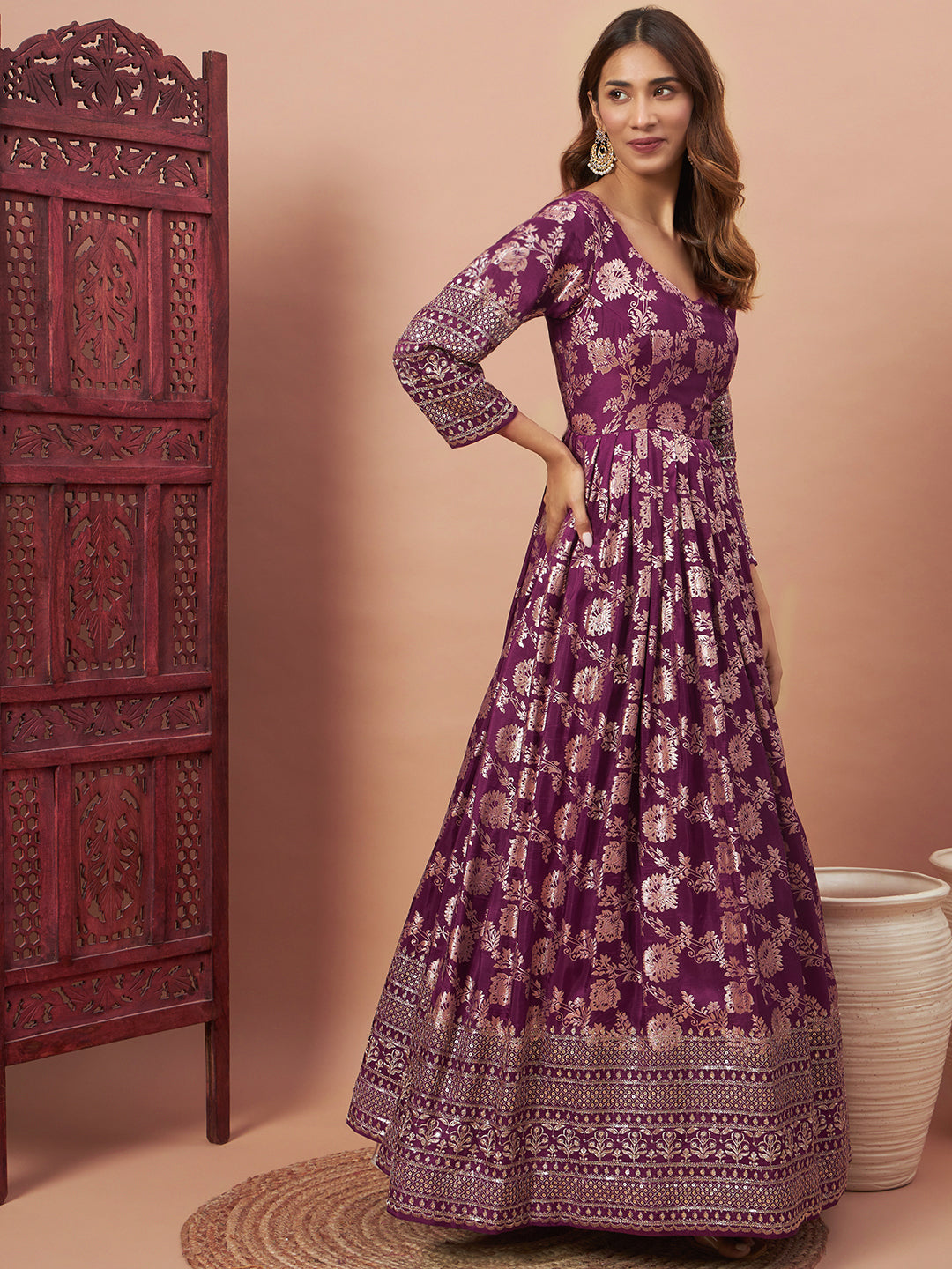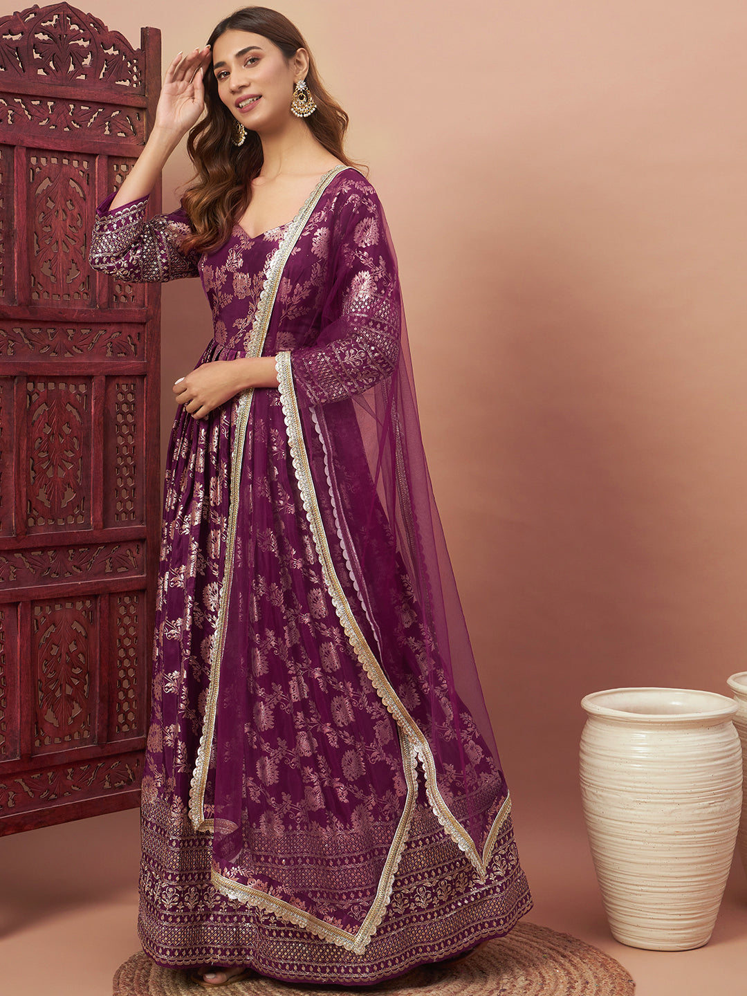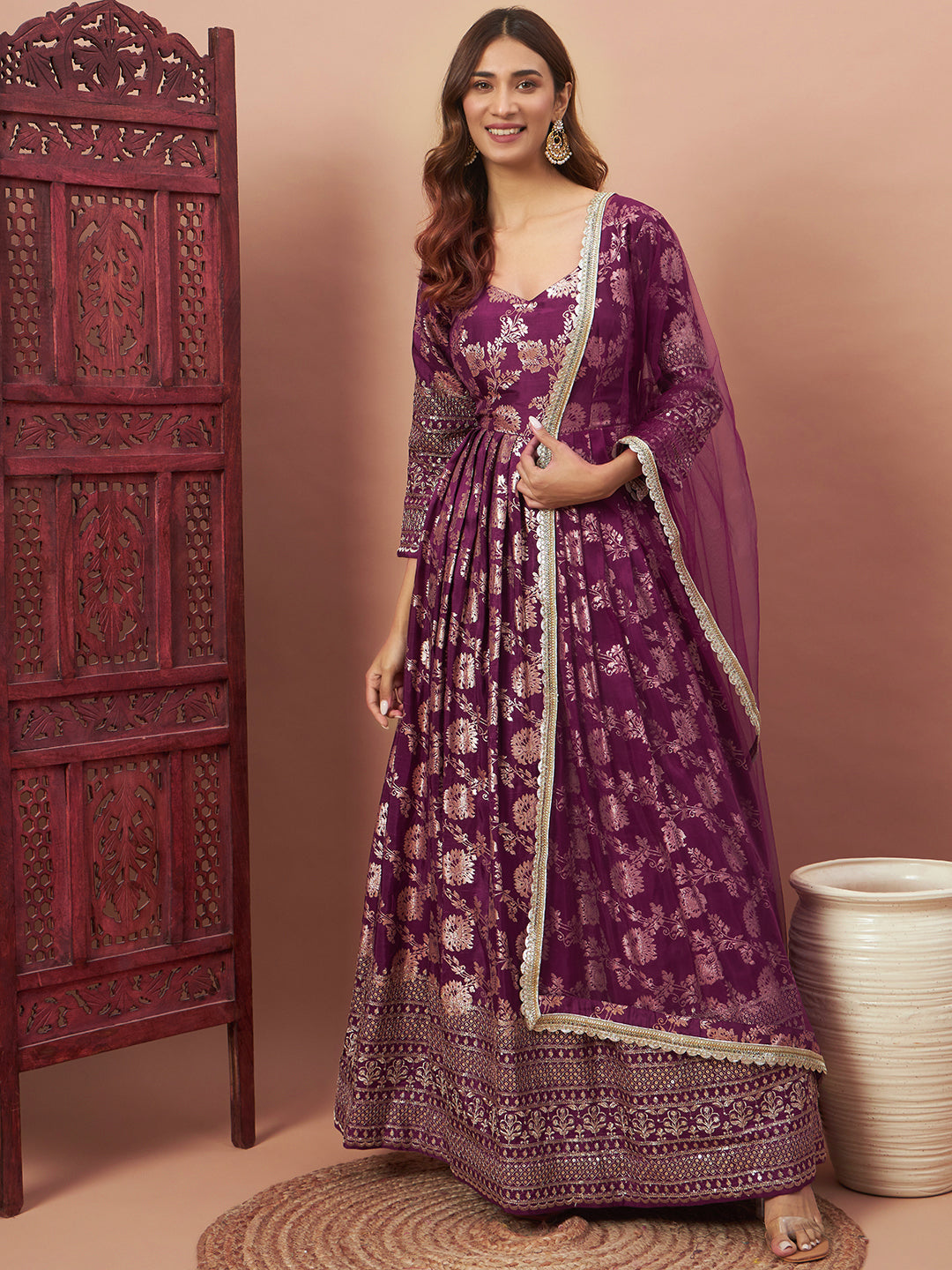 Burgundy Banarasi Brocade Anarkali Party Wear Long Gown Dress With Embellished Dupatta