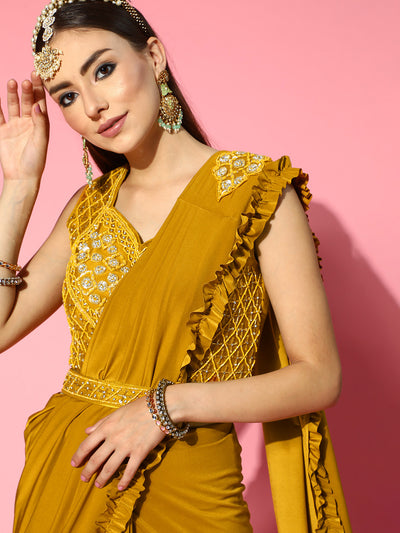 Chhabra 555 Mustard Pre-Draped Ruffled Ready to Wear Belted Saree with Pearl Embellishments